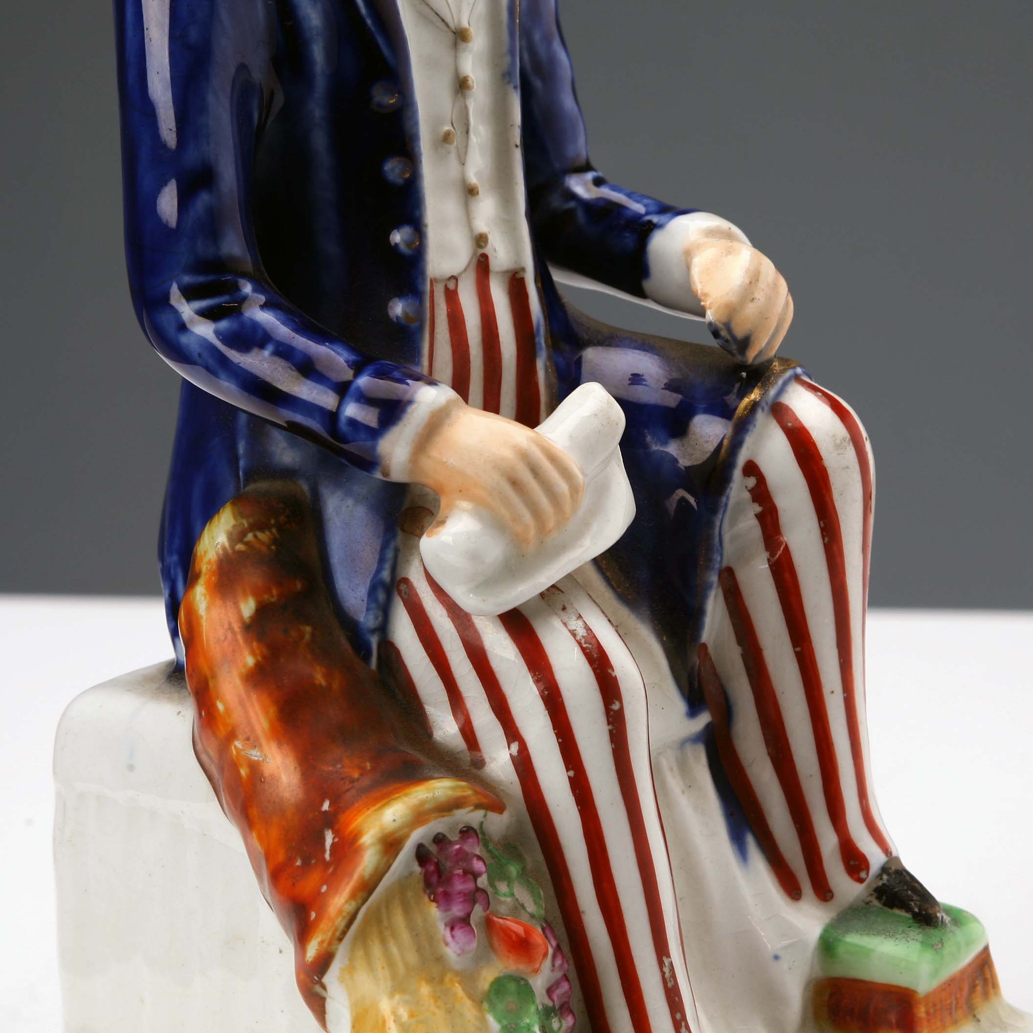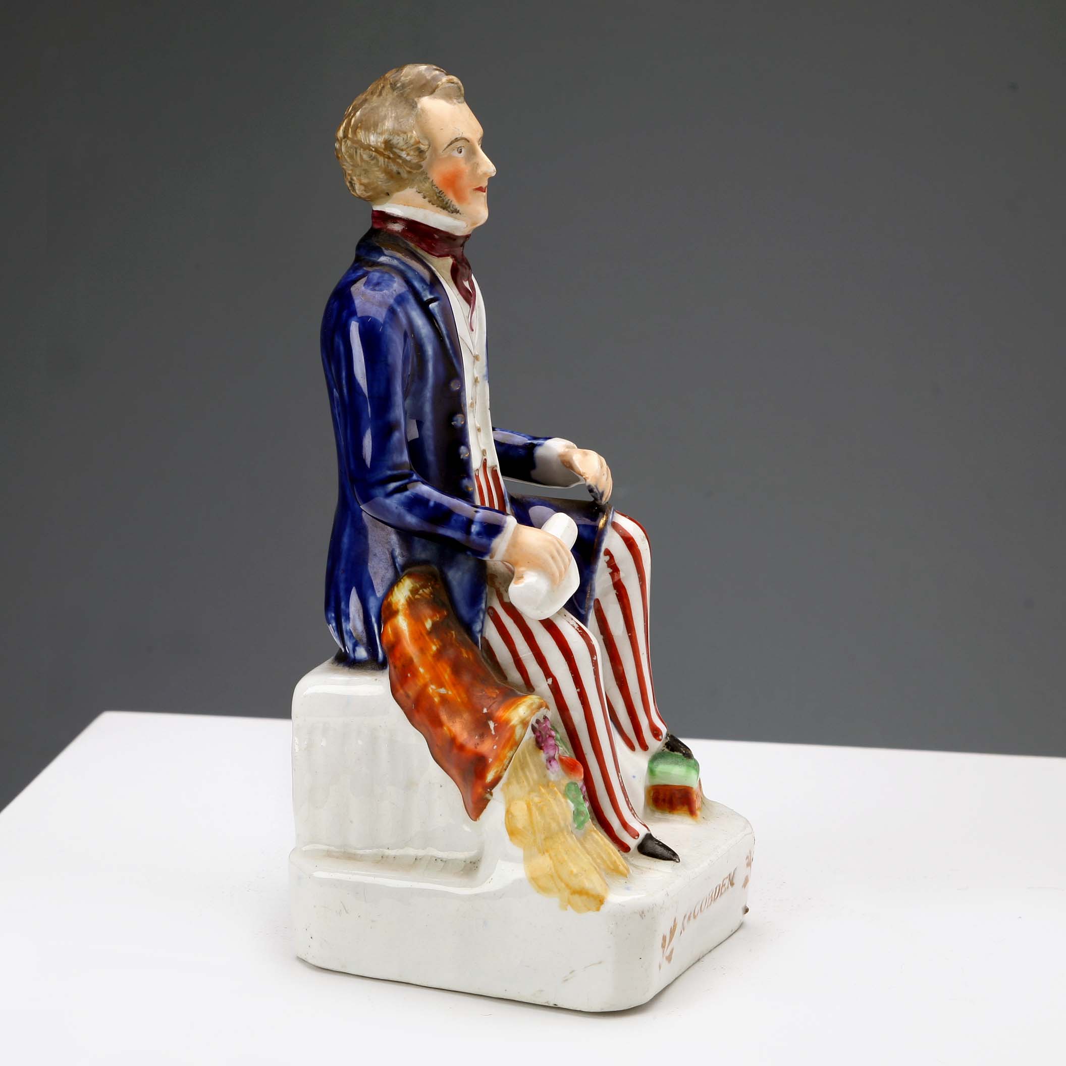 Sculpture en céramique polychrome représentant Richard Cobden, homme politique anglais de l'époque, assis avec un parchemin à la main et une corne d'abondance de fleurs à ses côtés.