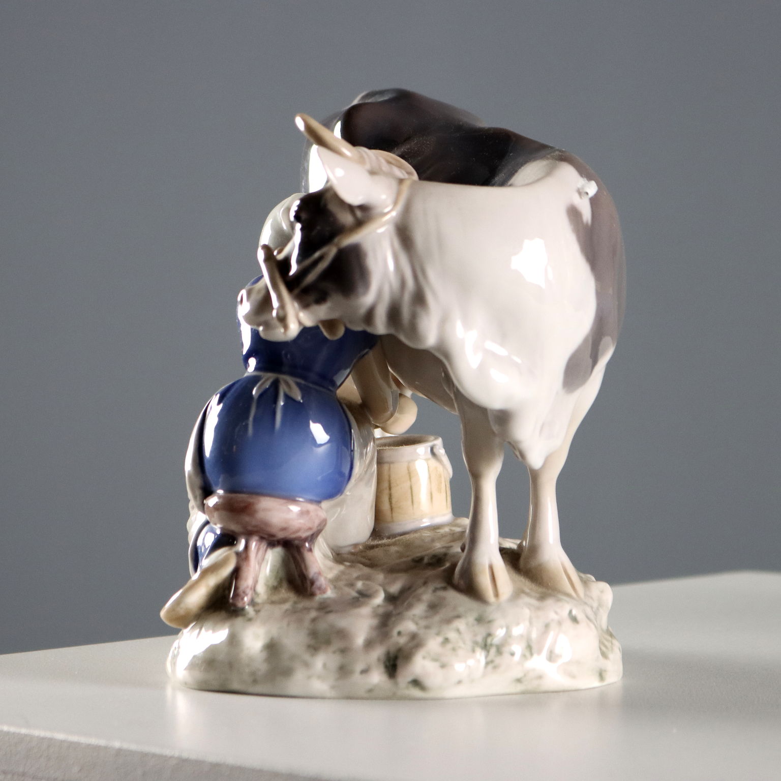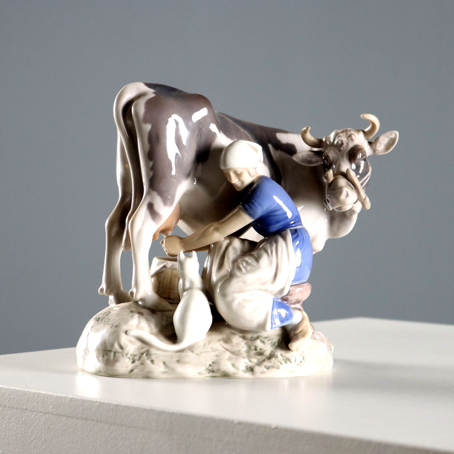 Sculpture en porcelaine représentant une scène de traite. Numérotée 2228. Signature de l'artiste gravée sur la base, marque du fabricant au dos.