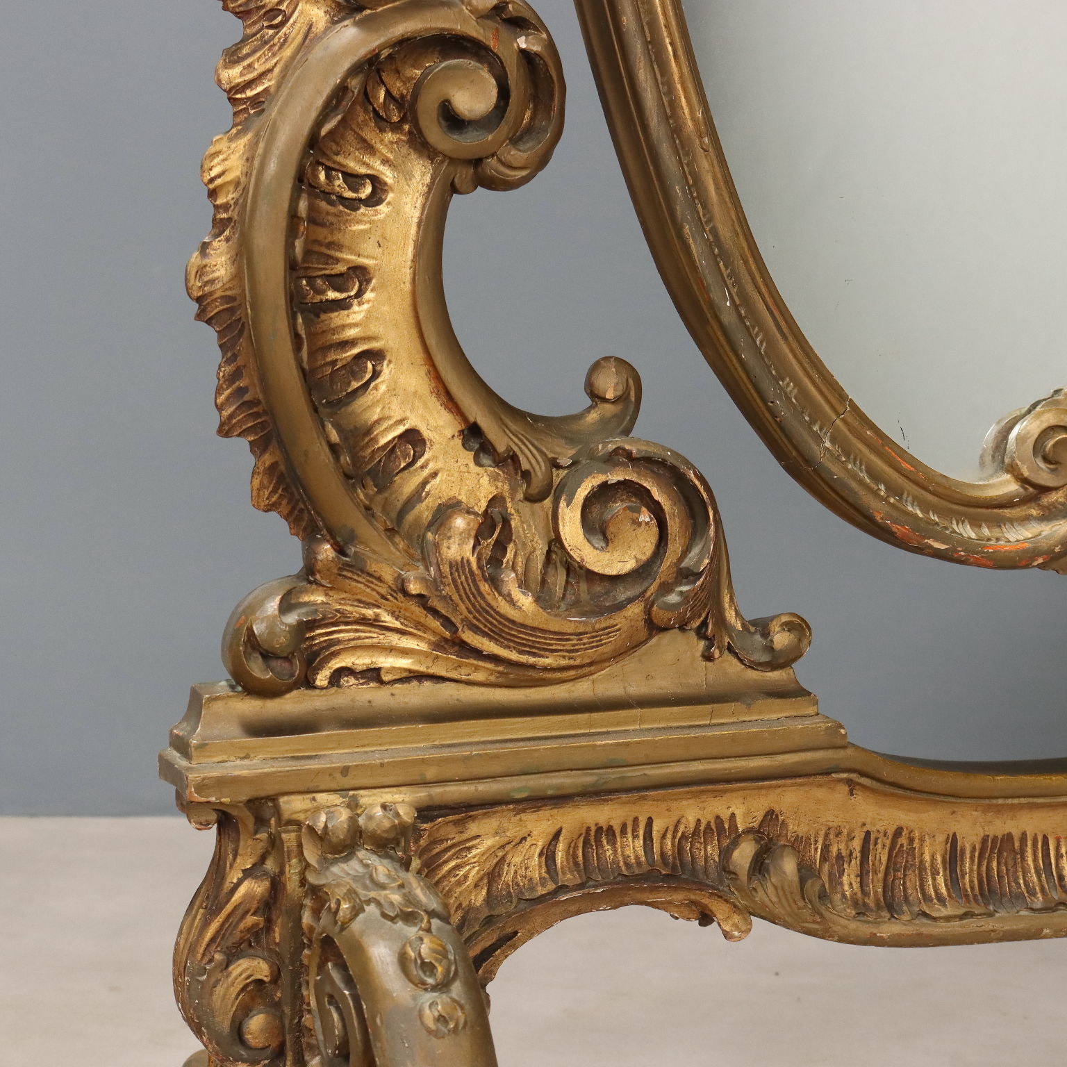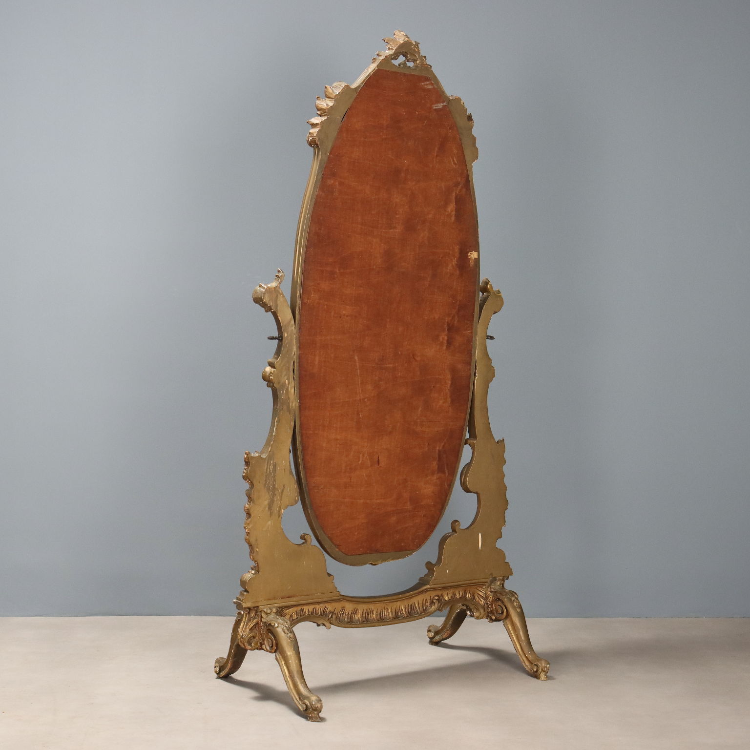Psyché en bois sculpté, laqué et doré. Miroir ovale à cadre orné de volutes et de feuilles, tout comme les montants qui le soutiennent. L'ensemble est assemblé à la base et repose sur des pieds galbés, eux aussi sculptés. Italie, début du XXe siècle.