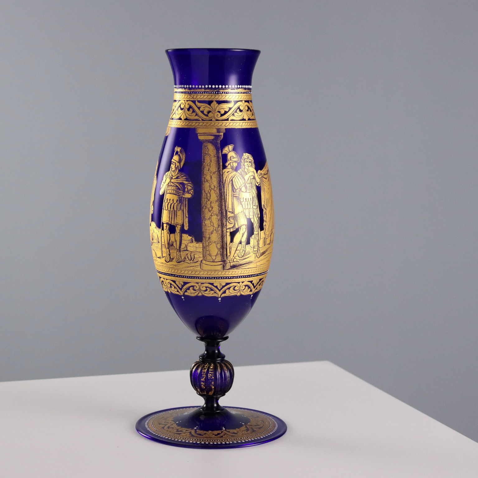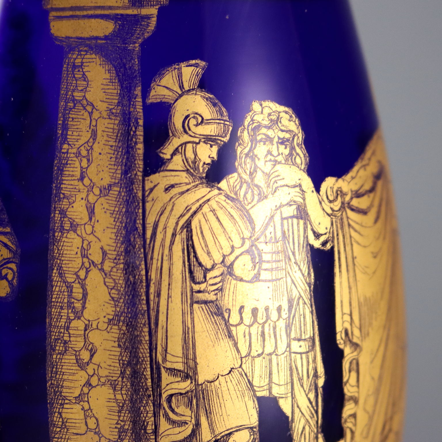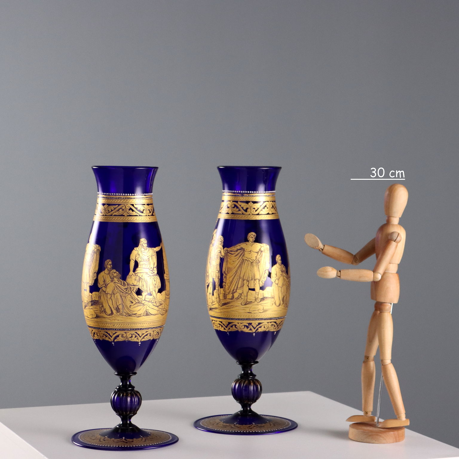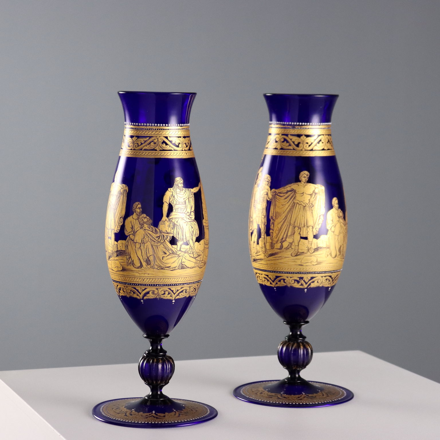 Paire de vases en verre soufflé bleu, en forme de fuseau et à col légèrement relevé. Décor doré représentant la scène légendaire de Gaius Mucius Scaevola posant la main sur le feu. Bordures et détails en relief dorés à patine blanche.