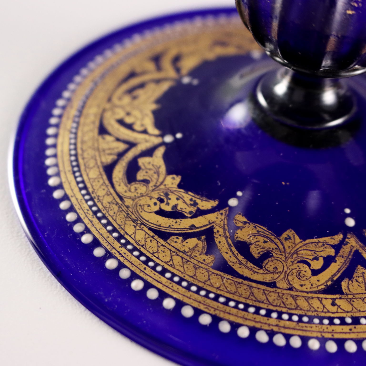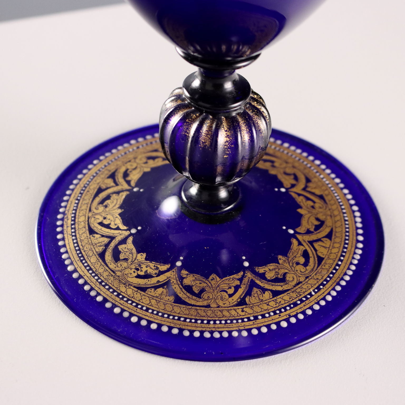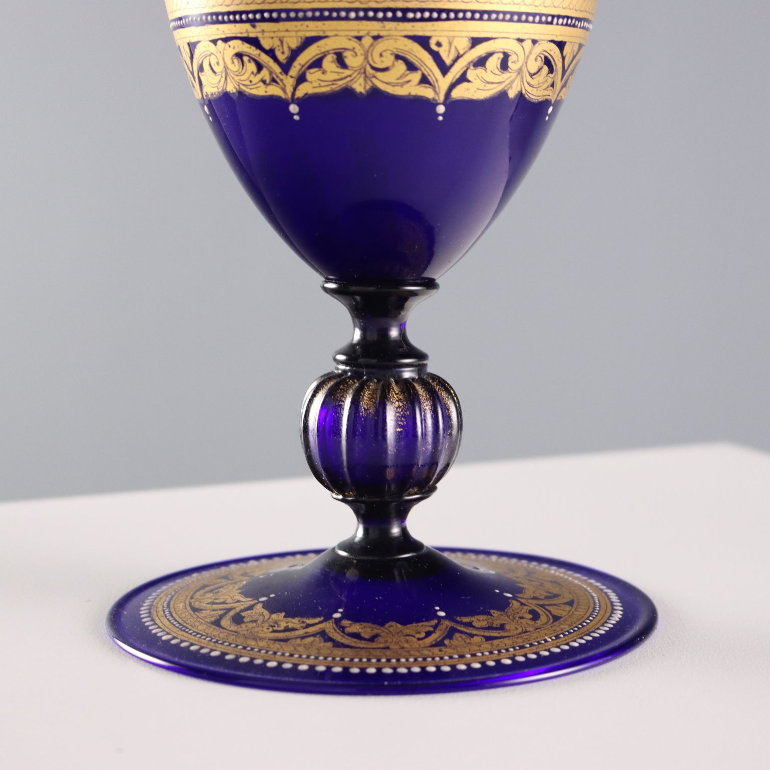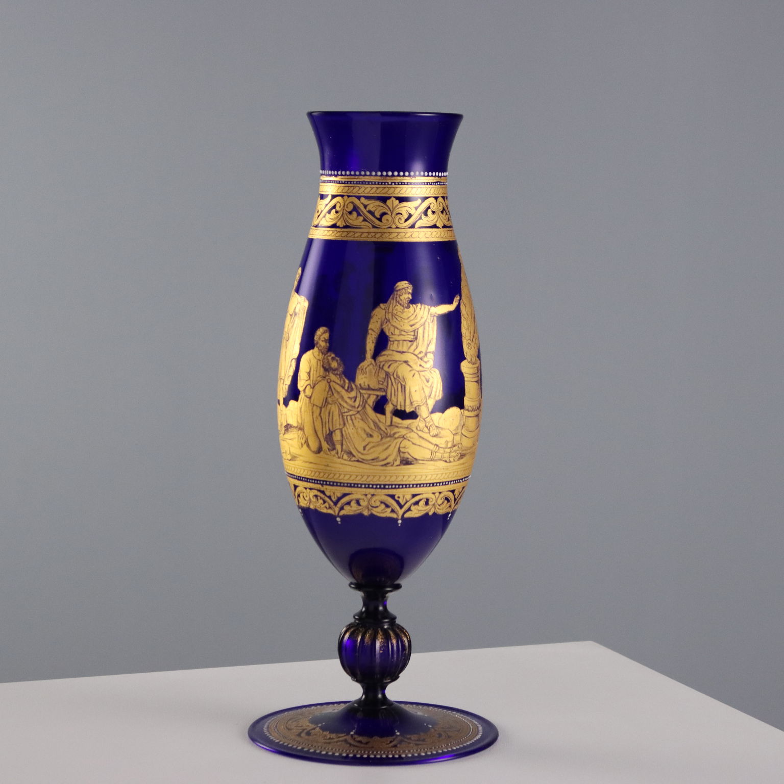 Paire de vases en verre soufflé bleu, en forme de fuseau et à col légèrement relevé. Décor doré représentant la scène légendaire de Gaius Mucius Scaevola posant la main sur le feu. Bordures et détails en relief dorés à patine blanche.
