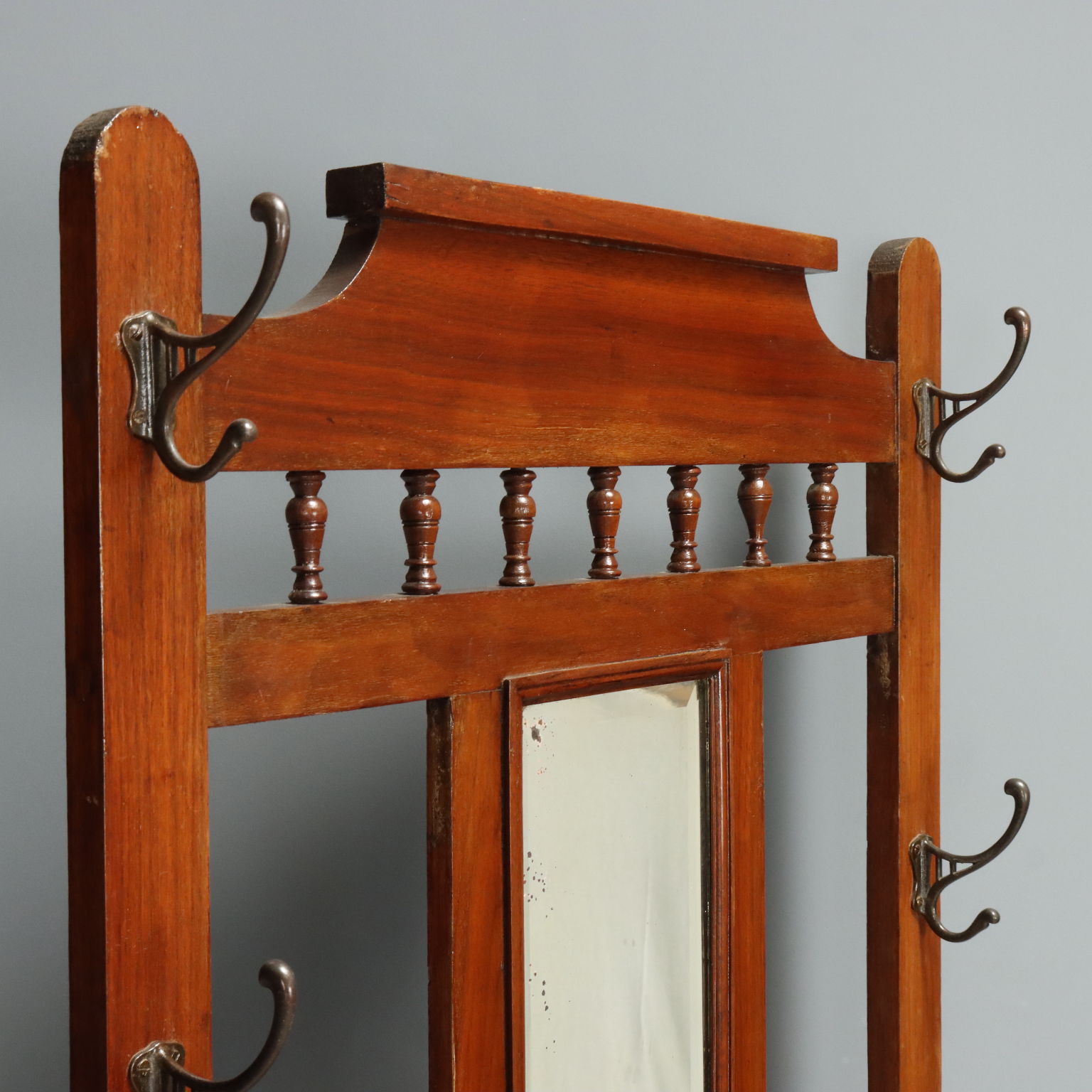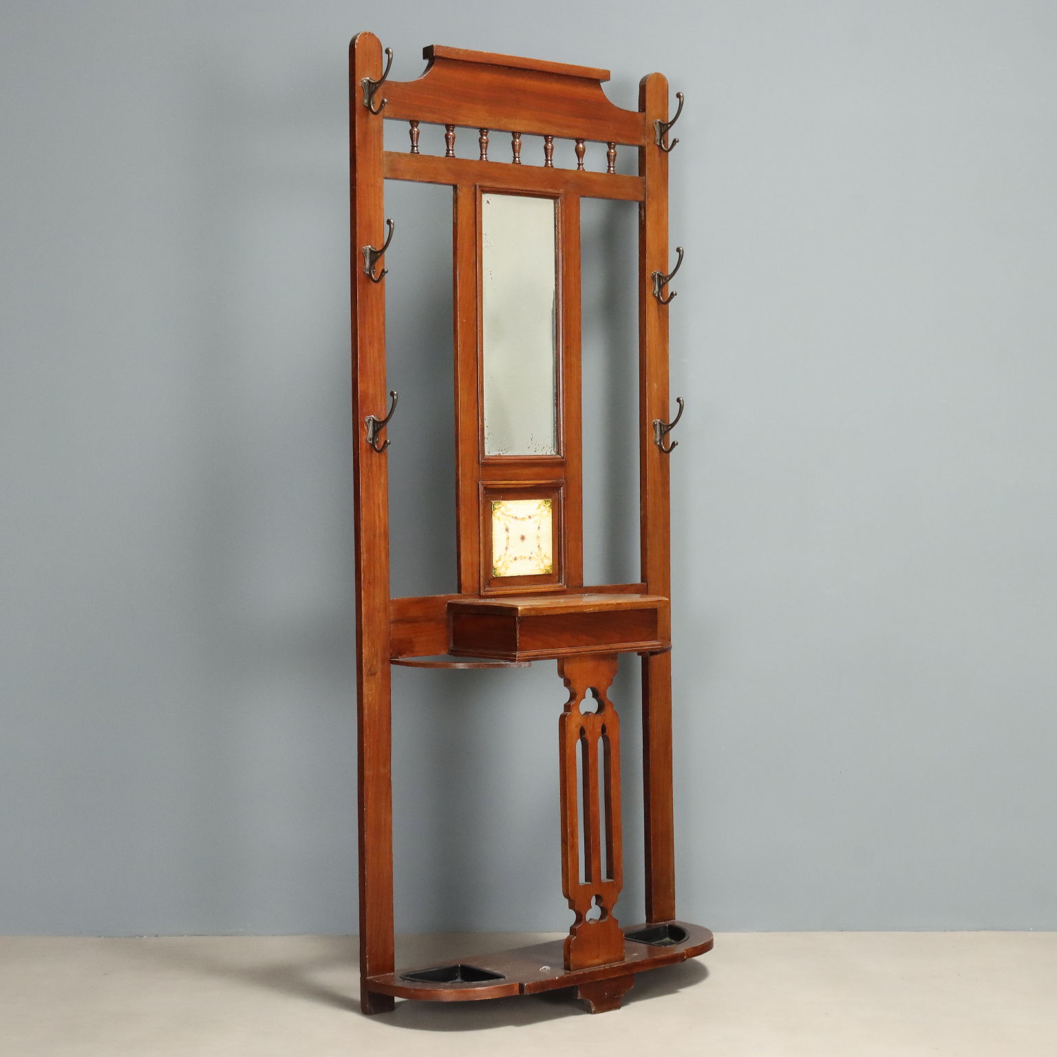 Porte-manteau Art nouveau en acajou. Miroir biseauté central avec tiroir en dessous et porte-parapluies latéraux. Six patères verticales, trois de chaque côté. Italie, début du XXe siècle.