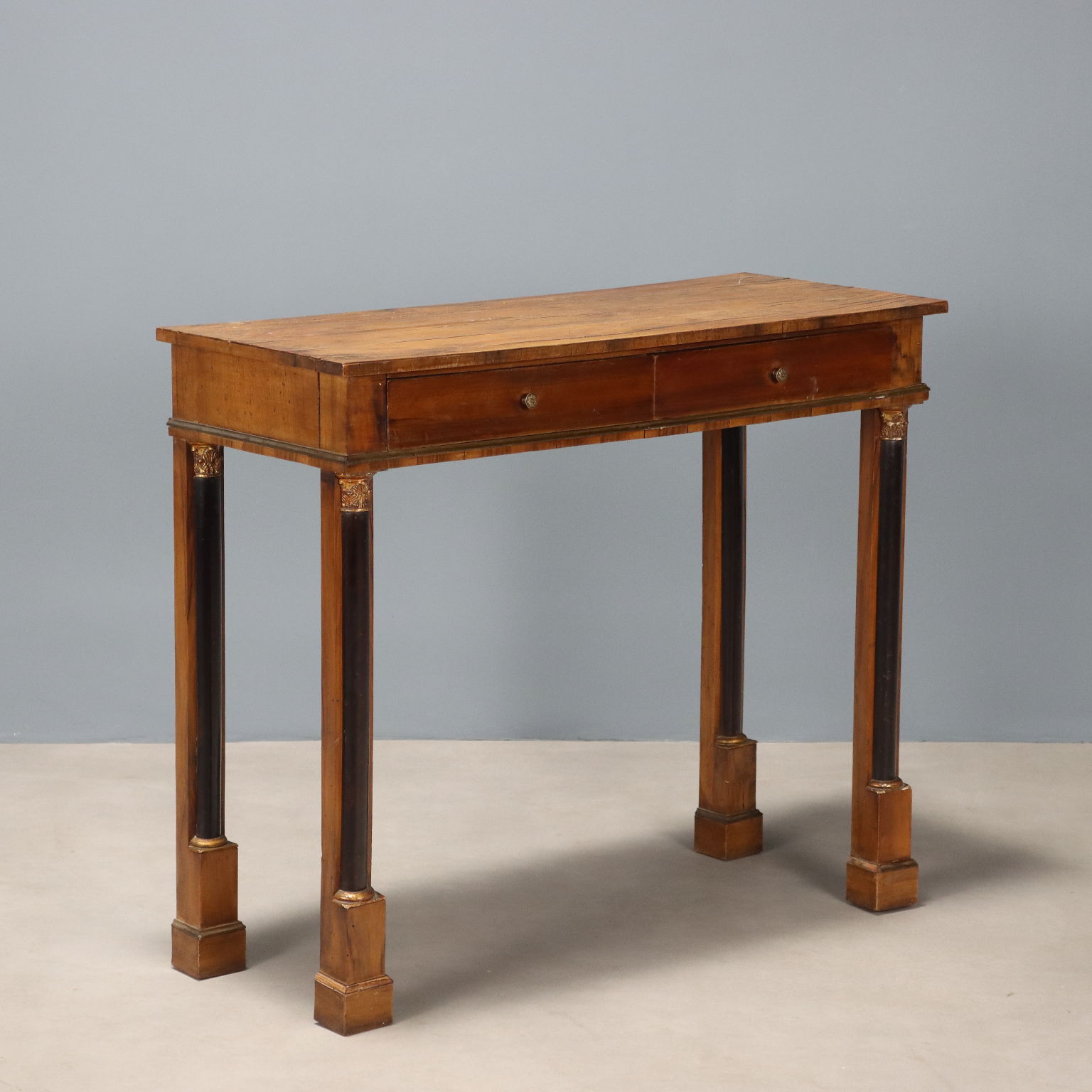 Console Empire en noyer. Tiroir dans la partie inférieure, quatre pieds demi-colonnes tournés et ébonisés, bases et chapiteaux sculptés et dorés. Socle, intérieur en sapin. Italie, début du XIXe siècle.