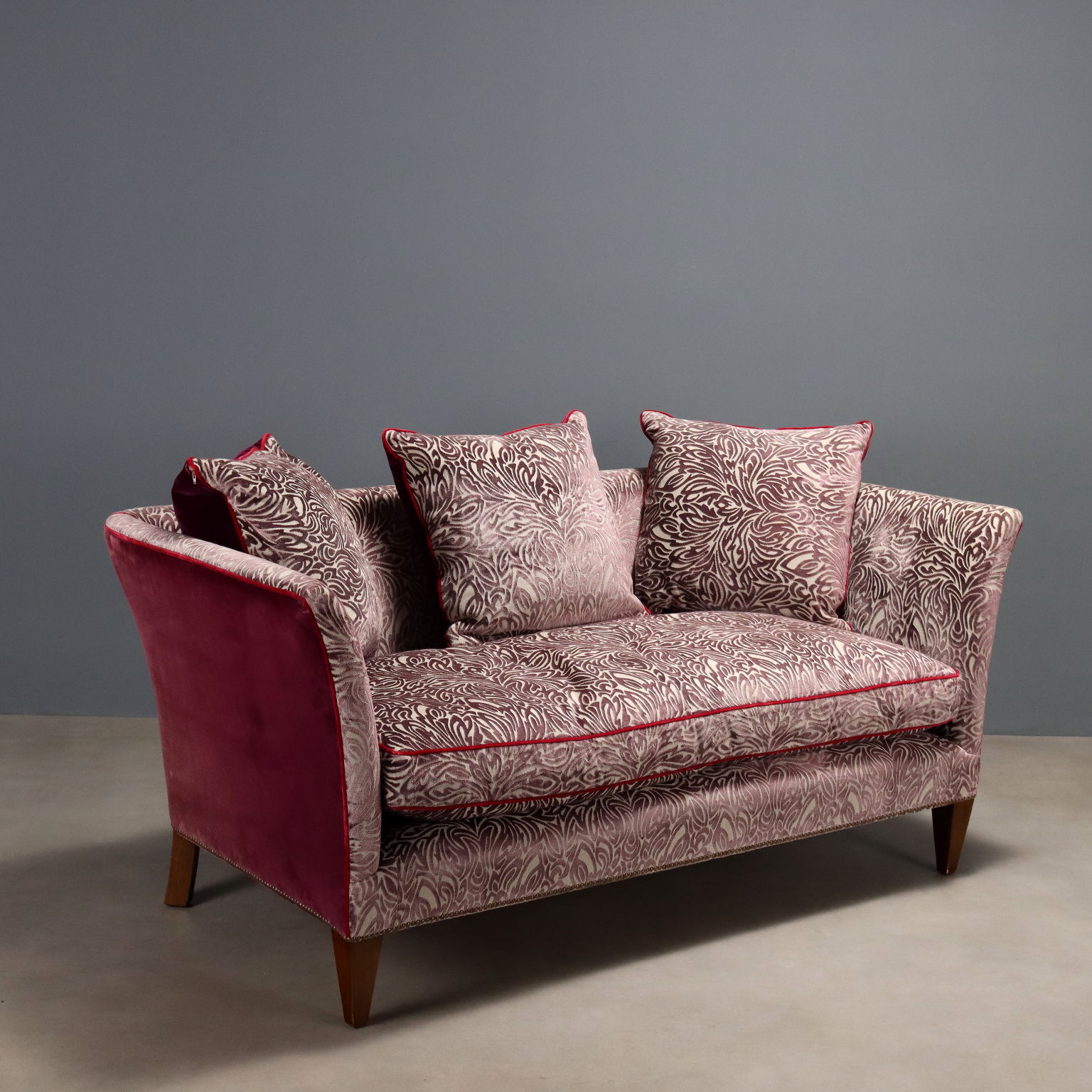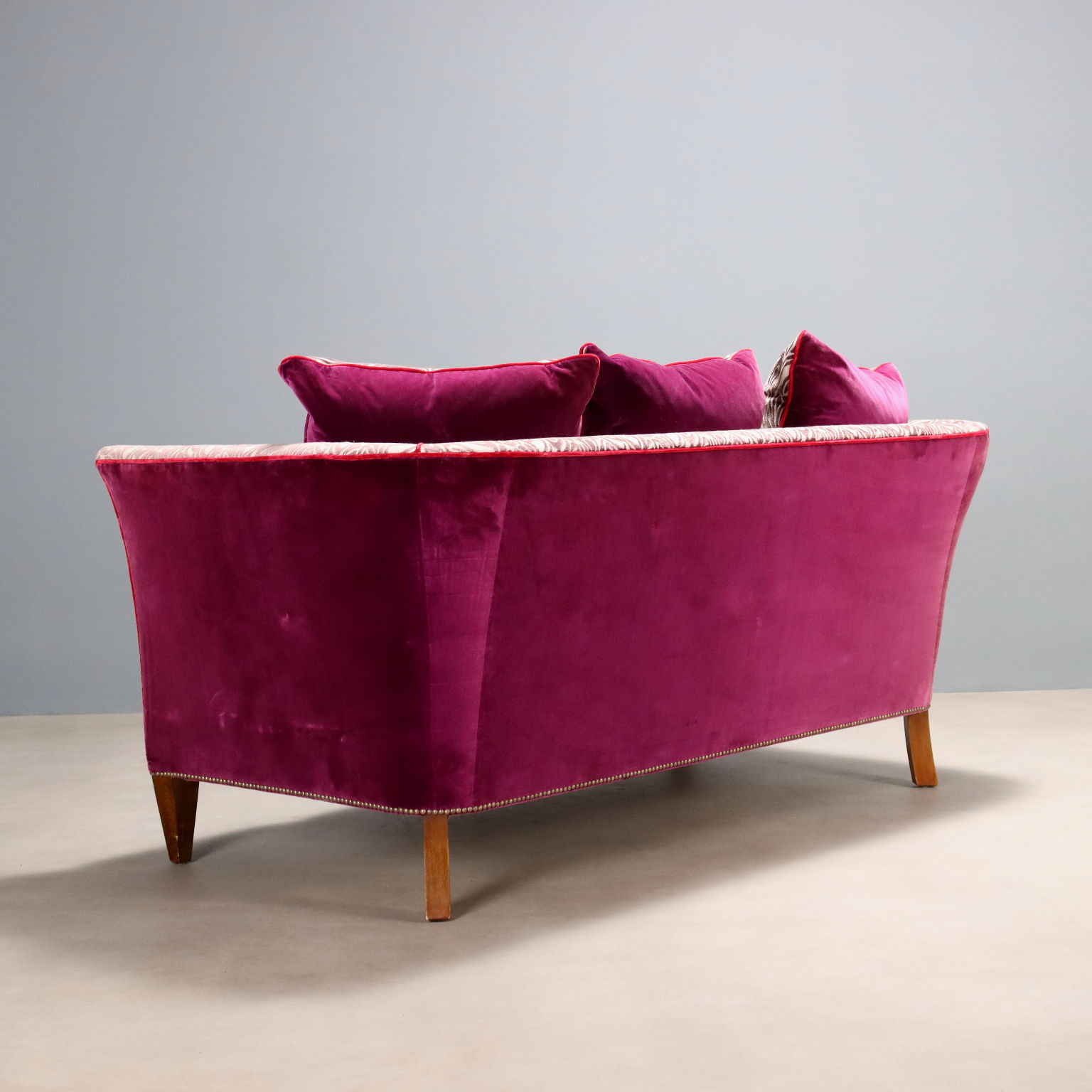 Canapé deux places à dossier et côtés en forme de traîneau, revêtement en velours, pieds en hêtre teinté noyer. Italie, XXe siècle.
