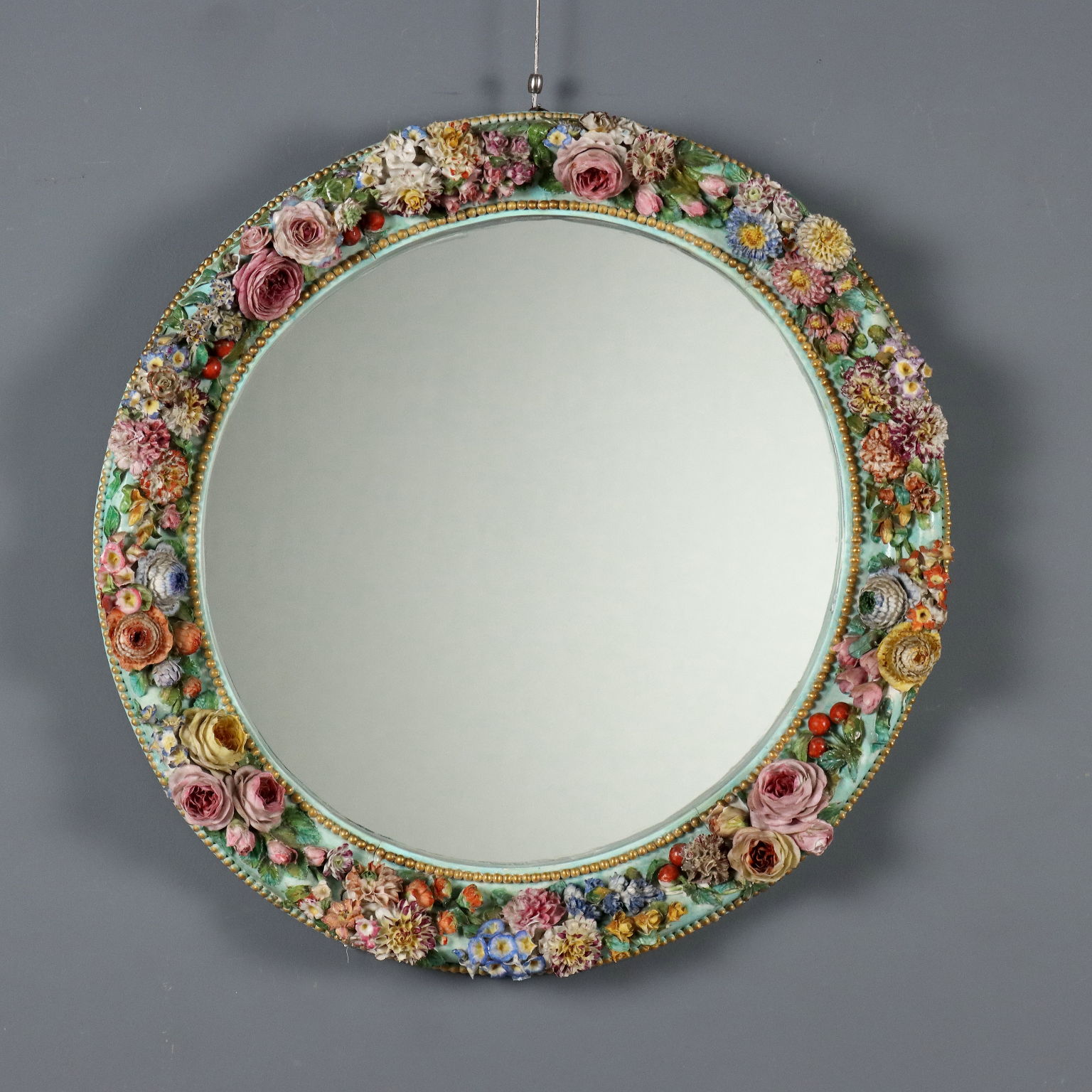 Miroir en céramique finement ouvragé, orné de motifs floraux et d'une finition peinte ; moulure intérieure à sphères dorées. Quelques parties manquantes. Italie, XIXe siècle.
