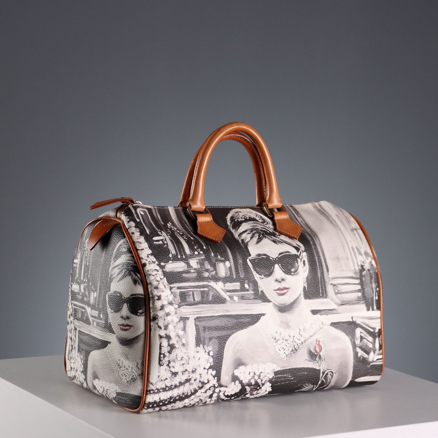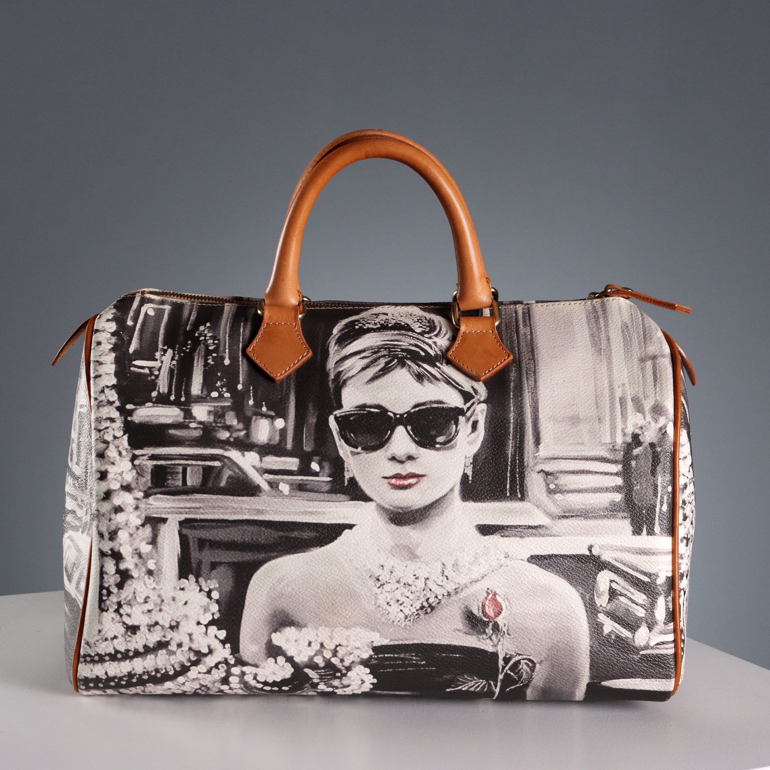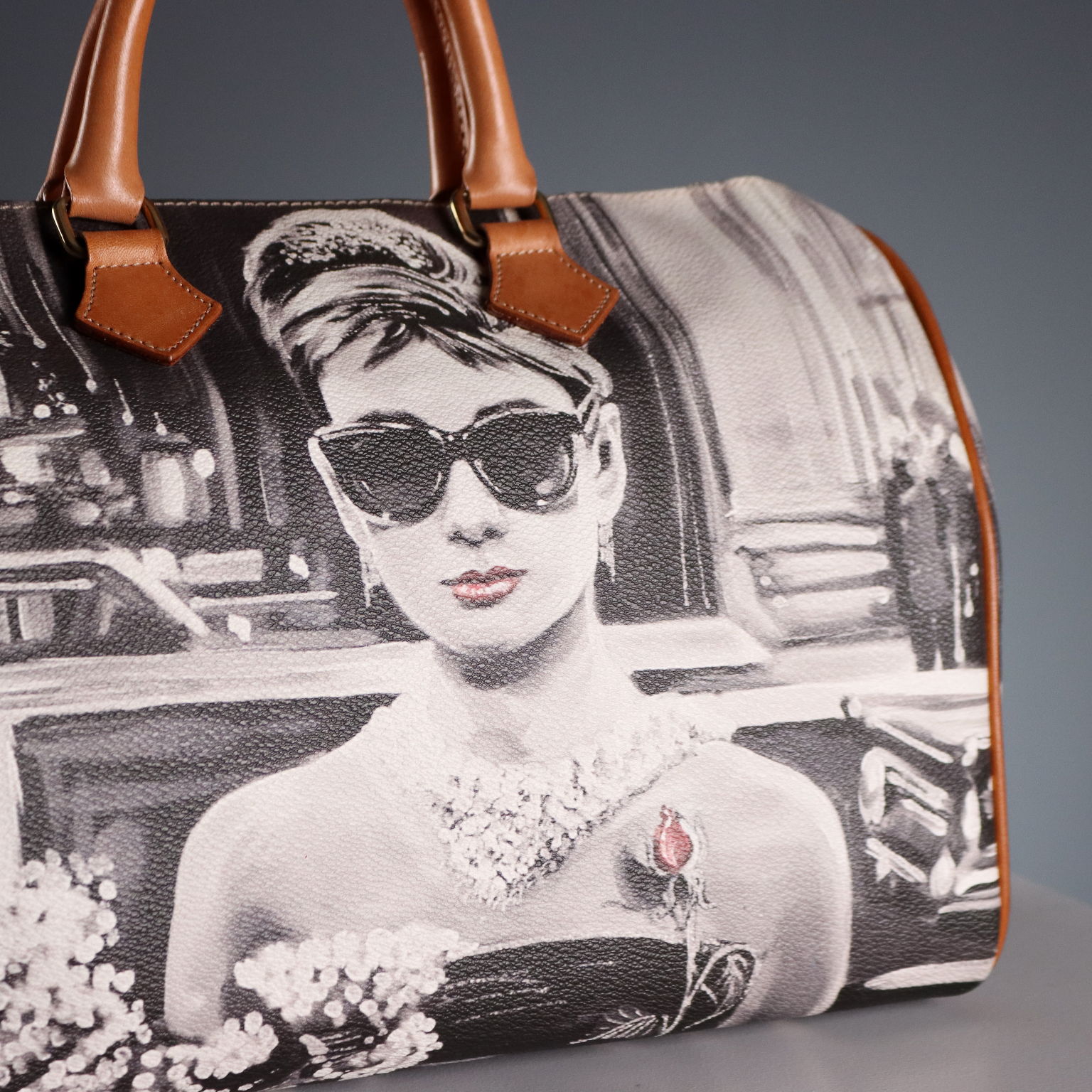 Sac à main orné d'une illustration d'Audrey Hepburn dans une scène culte de « Diamants sur canapé ». Modèle spacieux avec deux anses et finitions en cuir. Doublure avec une poche. Probablement jamais utilisé.