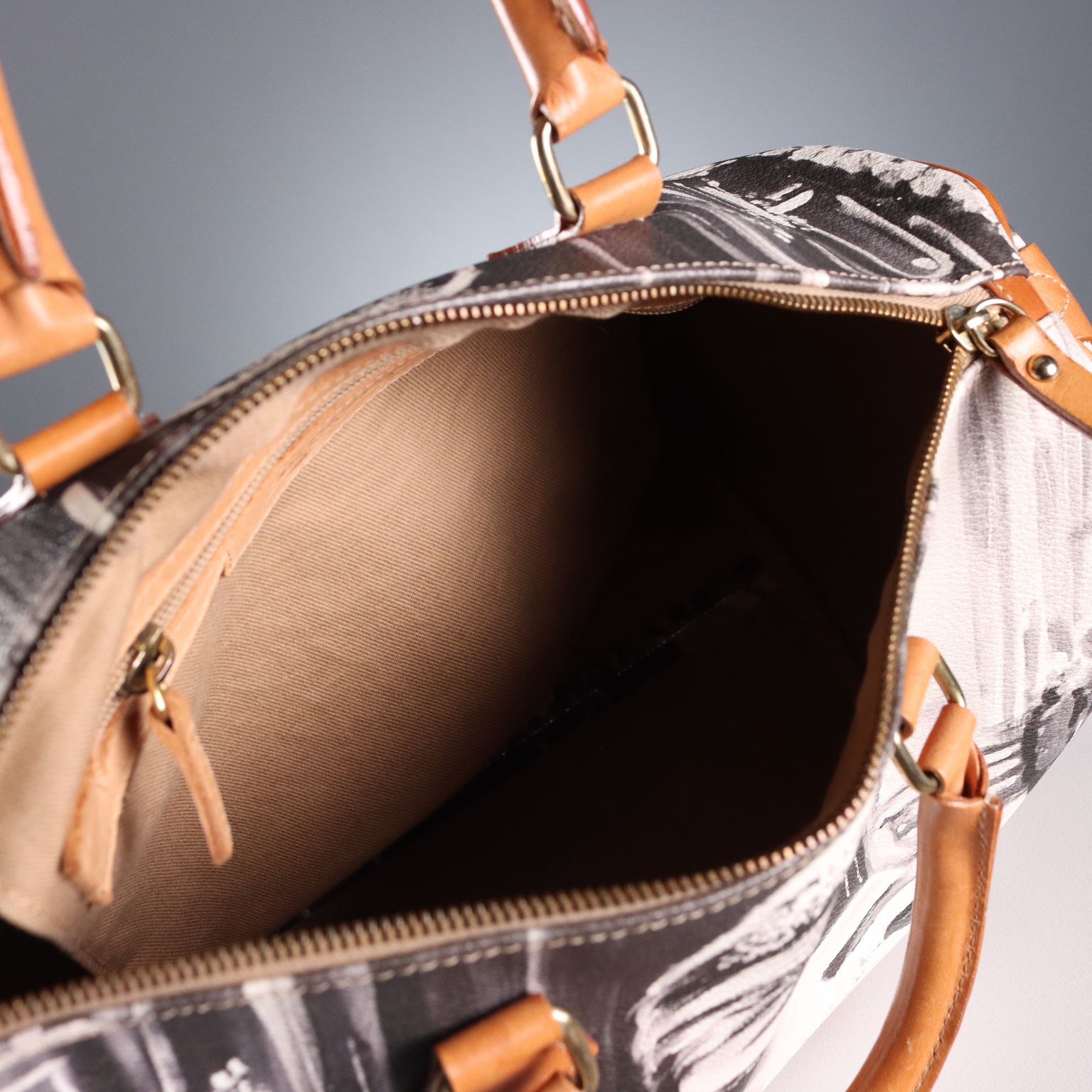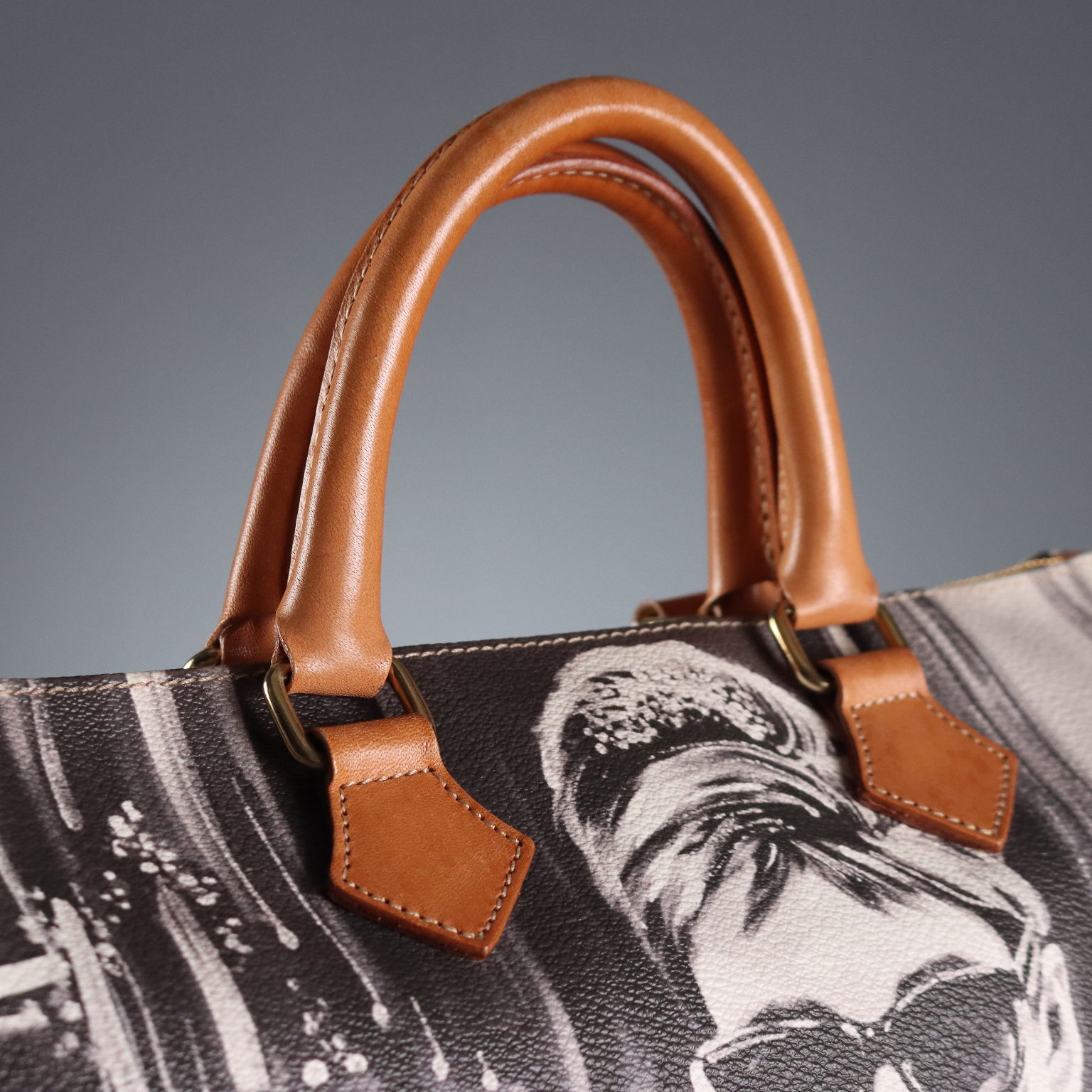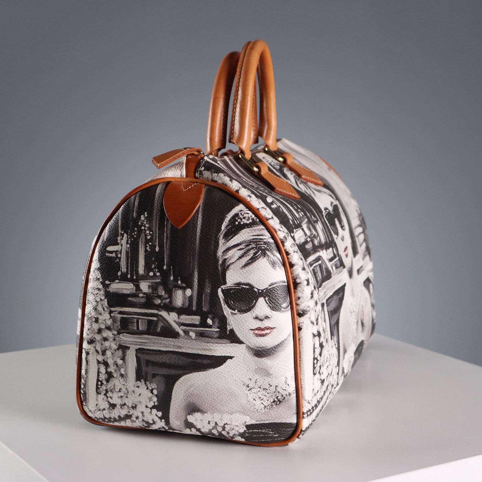 Sac à main orné d'une illustration d'Audrey Hepburn dans une scène culte de « Diamants sur canapé ». Modèle spacieux avec deux anses et finitions en cuir. Doublure avec une poche. Probablement jamais utilisé.