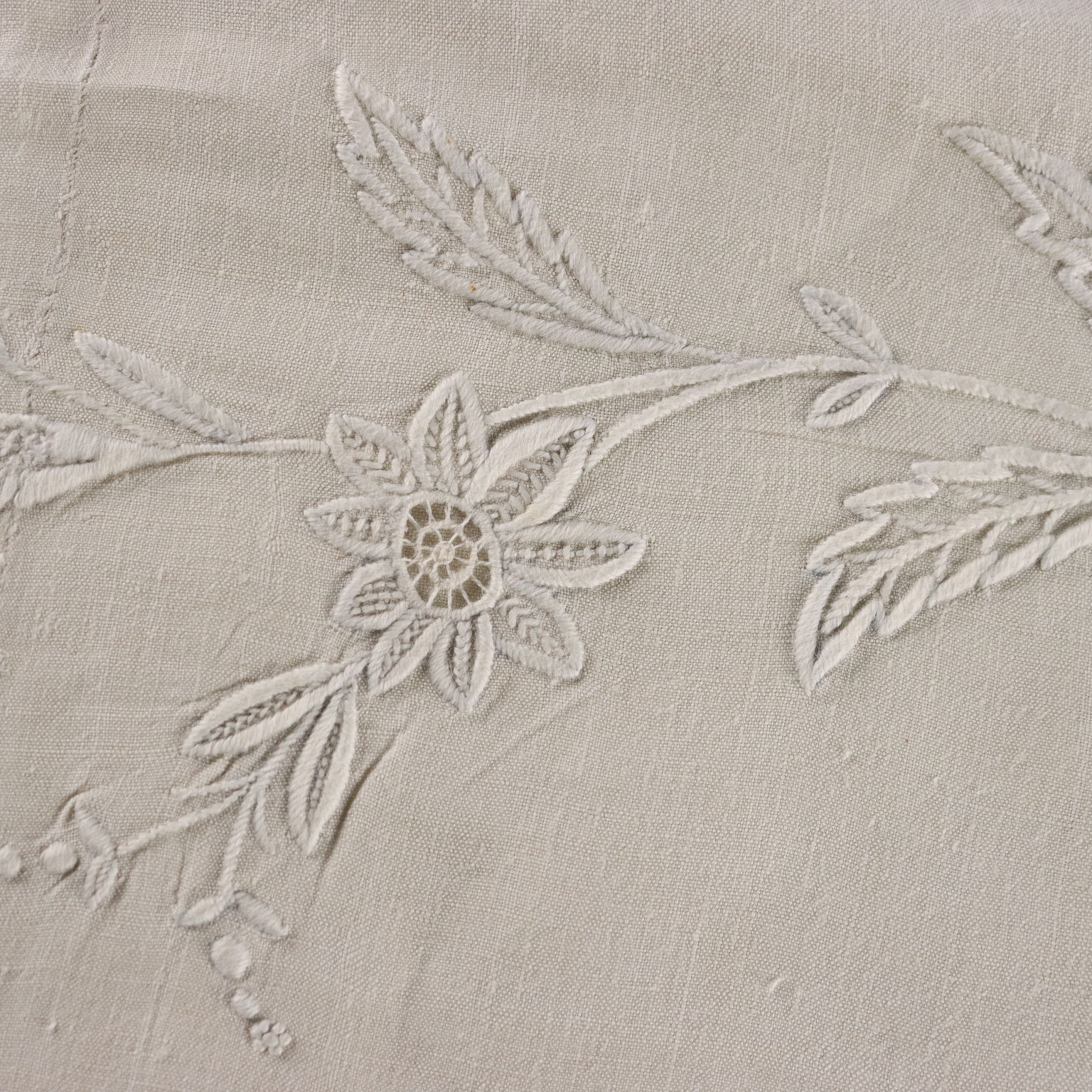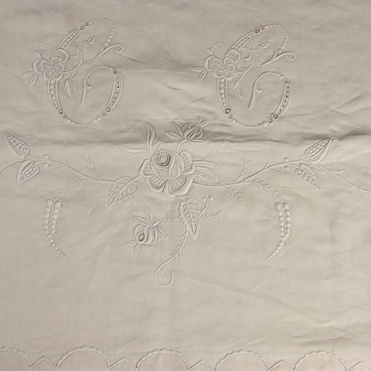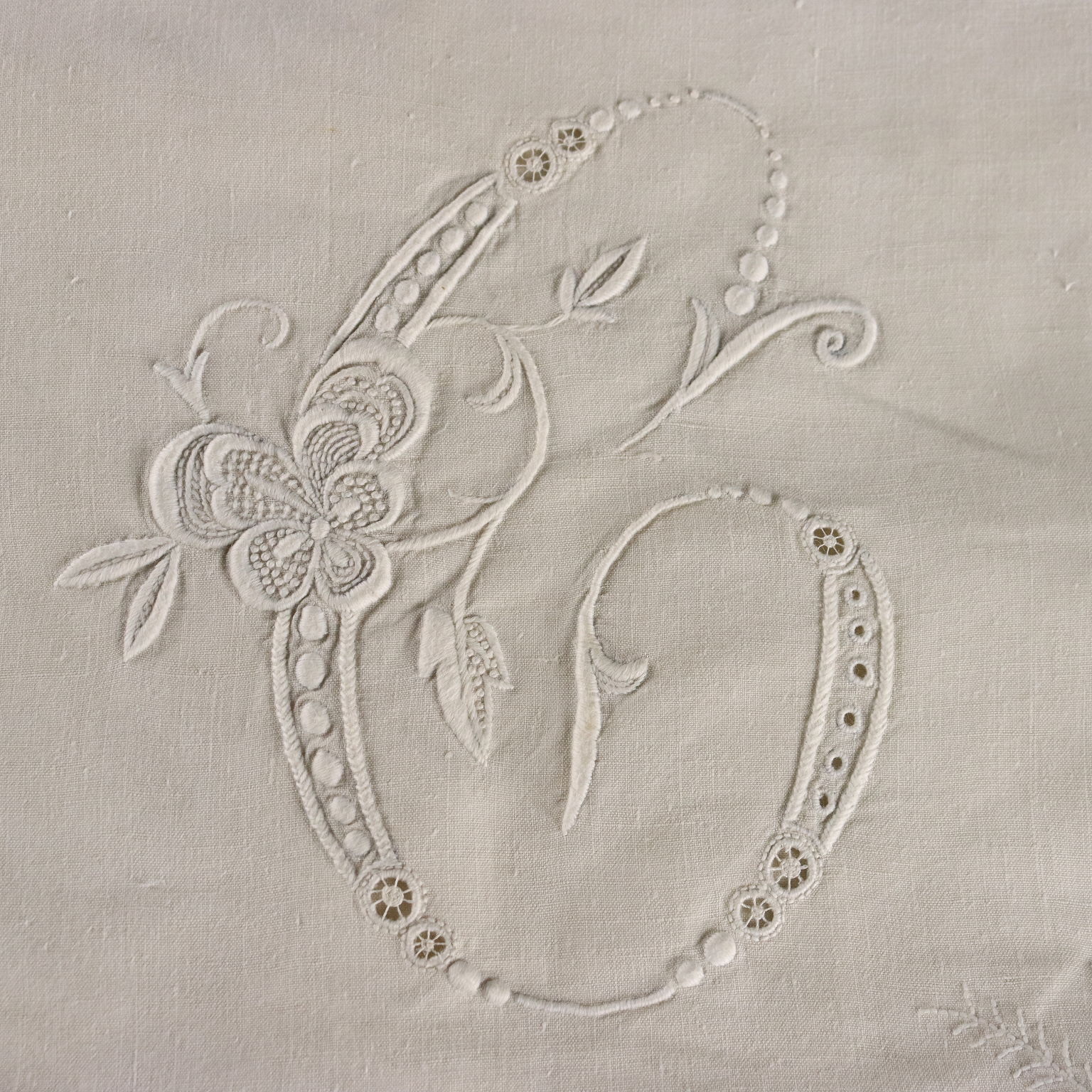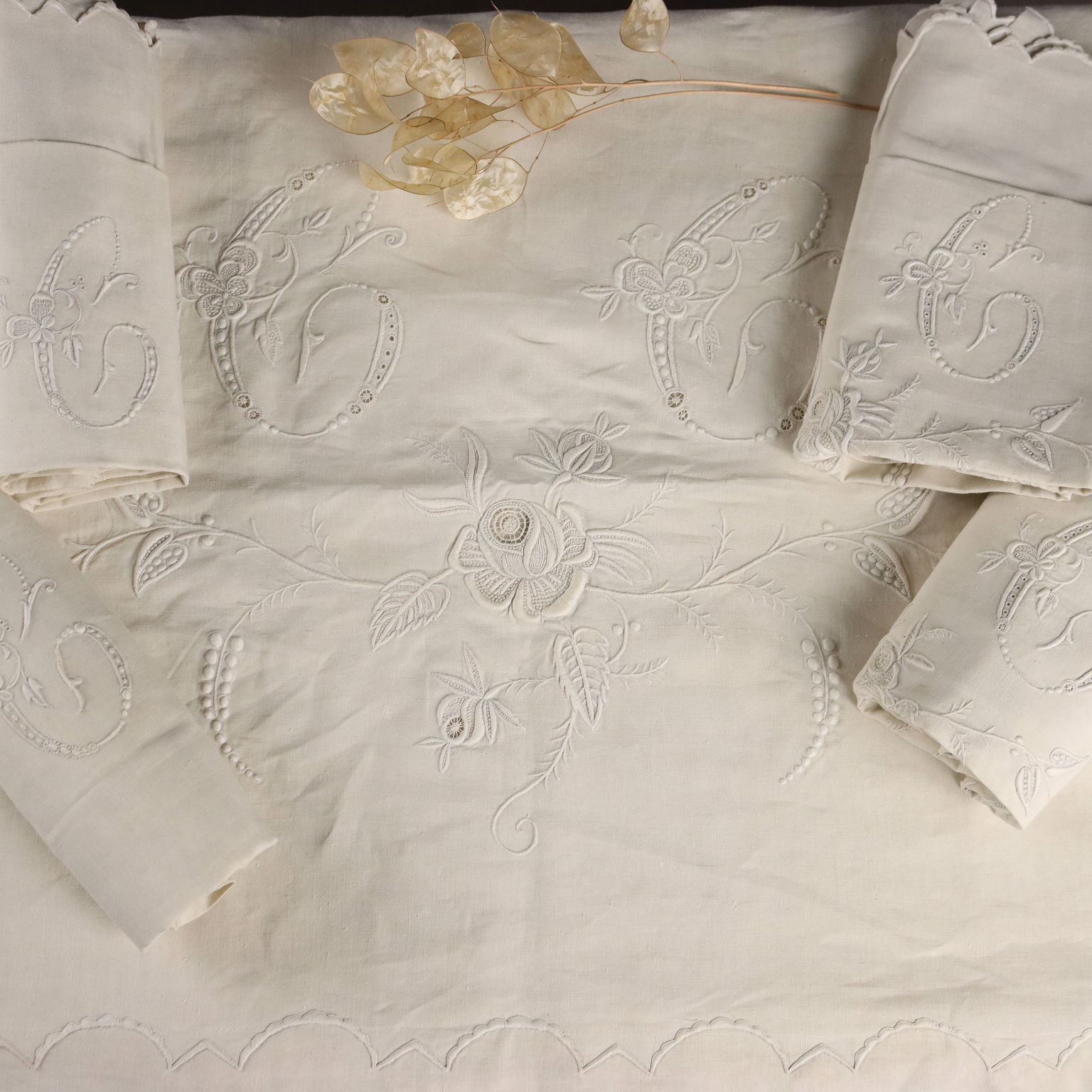 Magnifique drap double en lin avec quatre taies d'oreiller, fin XIXe - début XXe siècle, monogrammé, brodé à la main au point de satin.