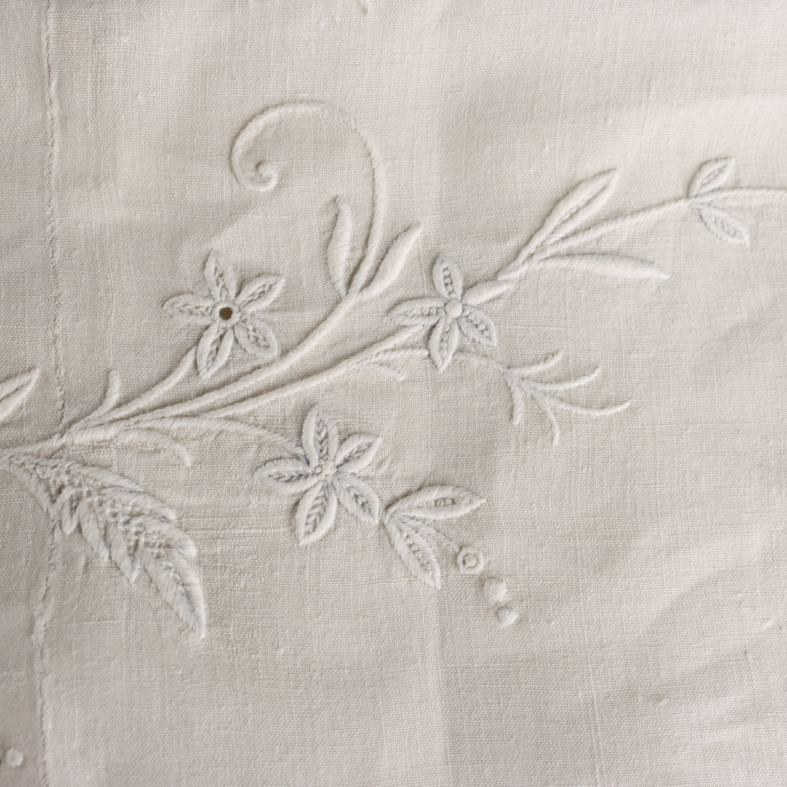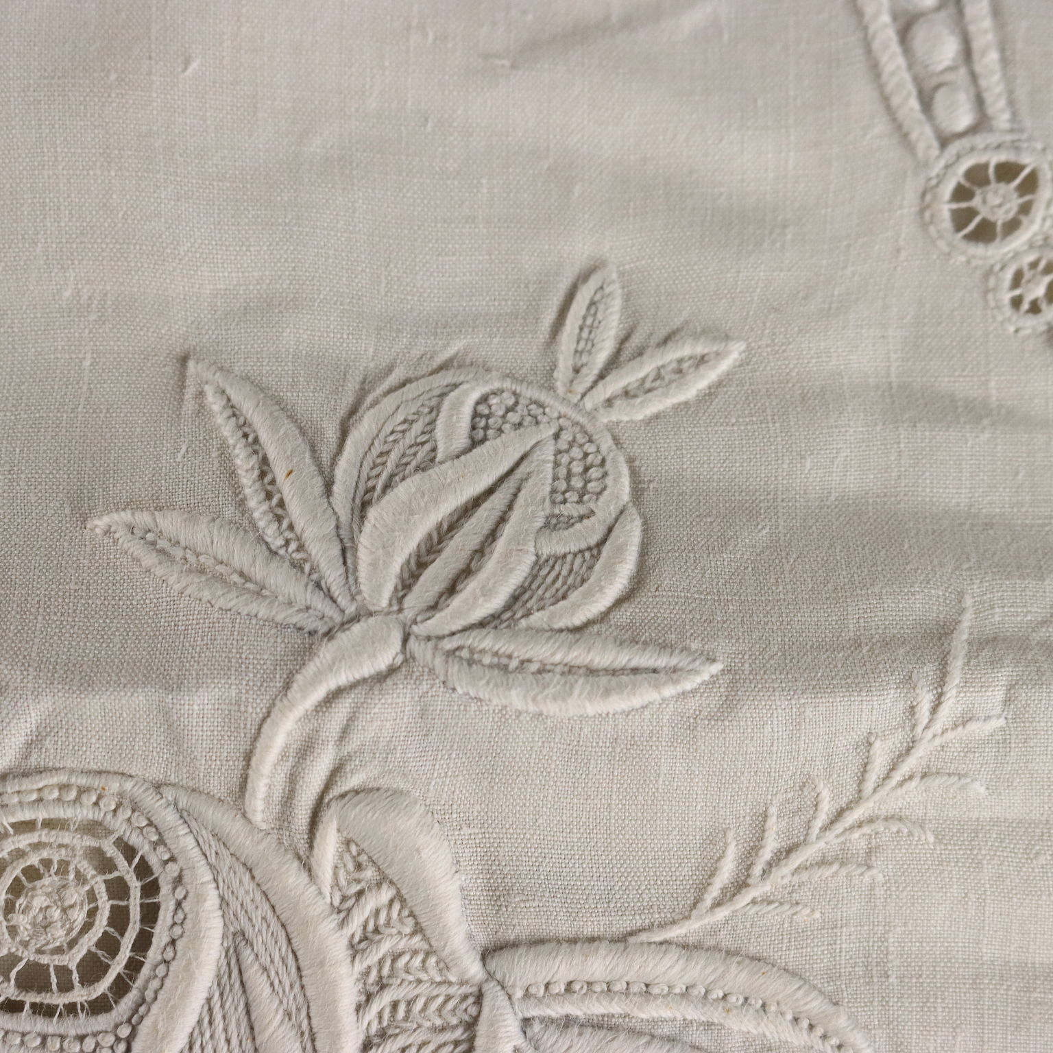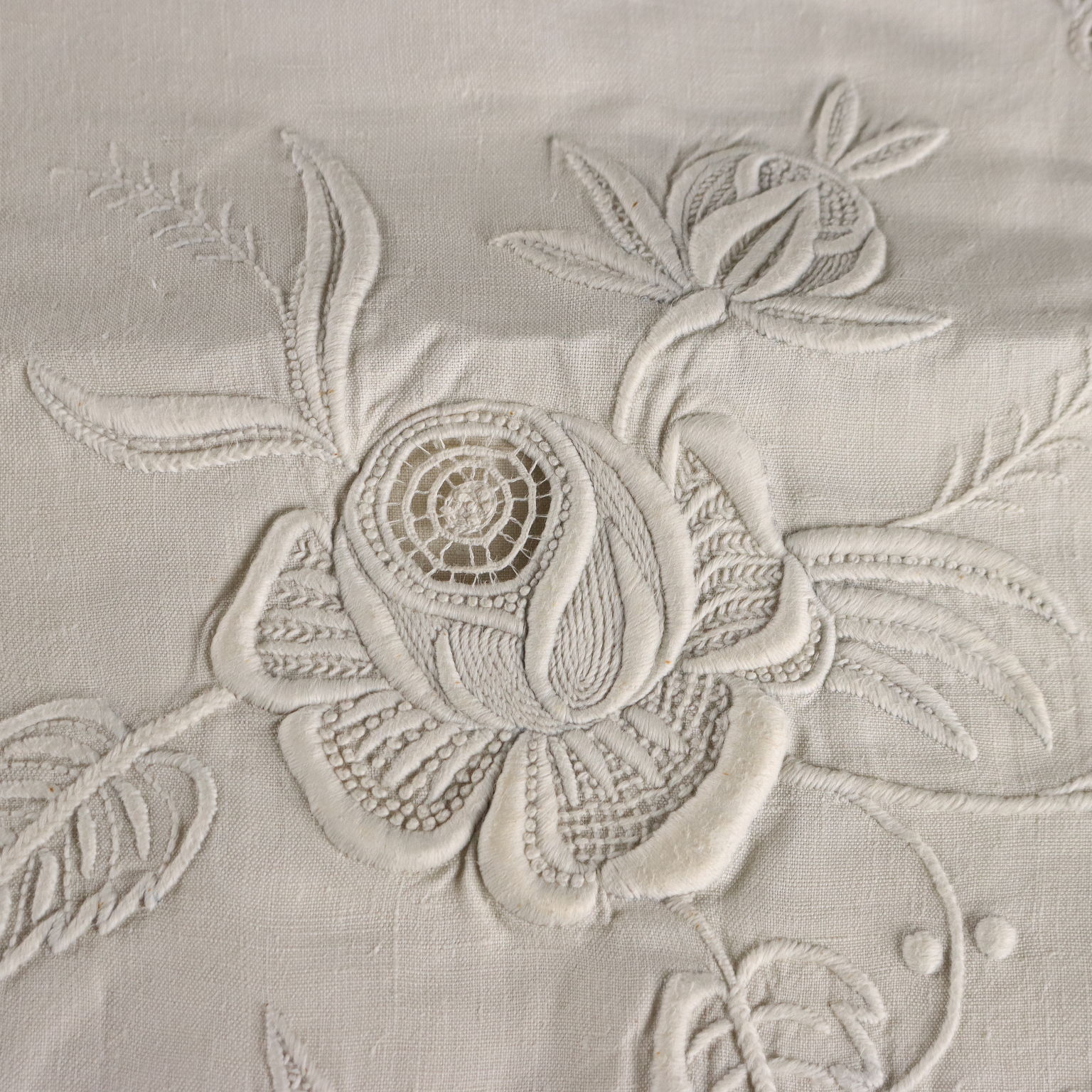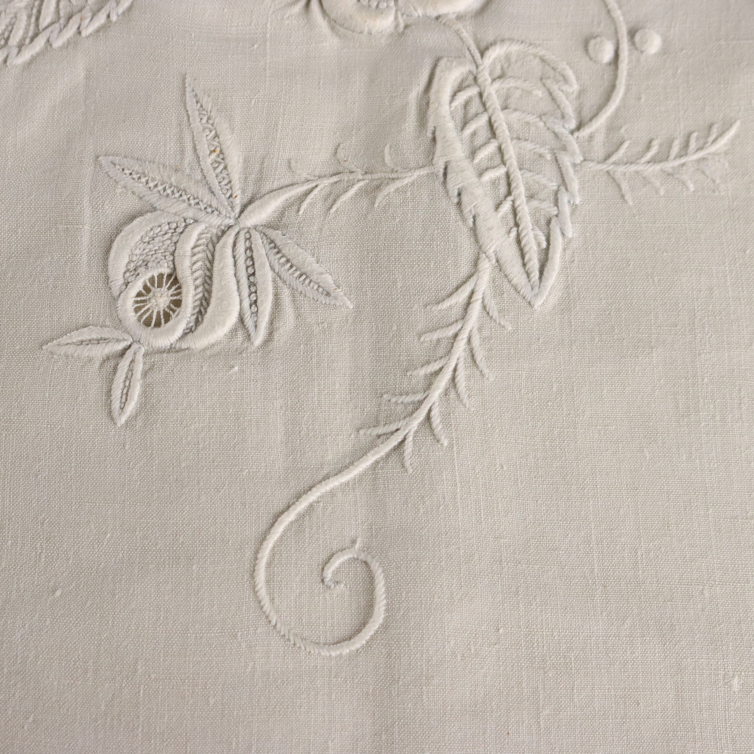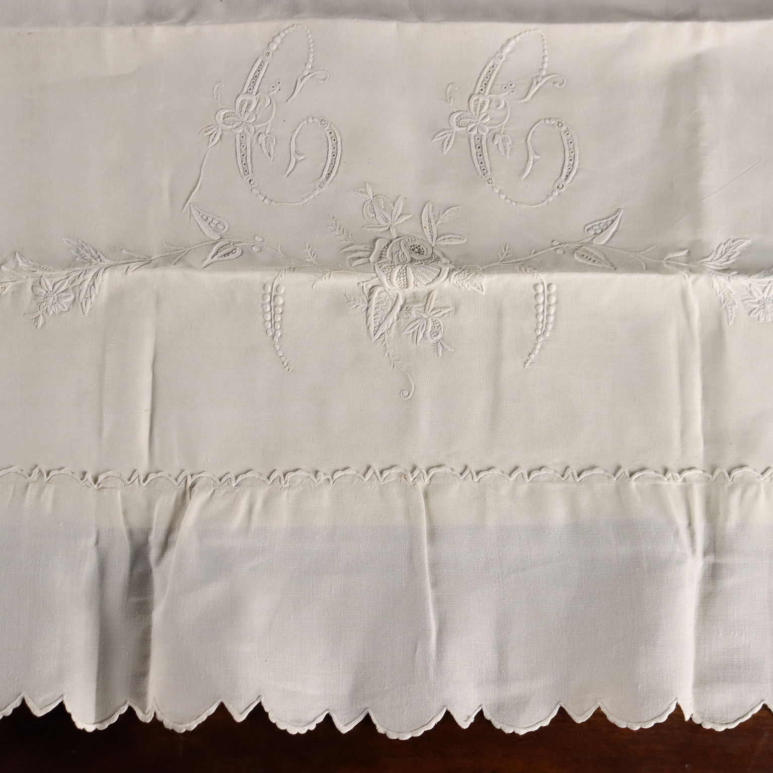 Magnifique drap double en lin avec quatre taies d'oreiller, fin XIXe - début XXe siècle, monogrammé, brodé à la main au point de satin.