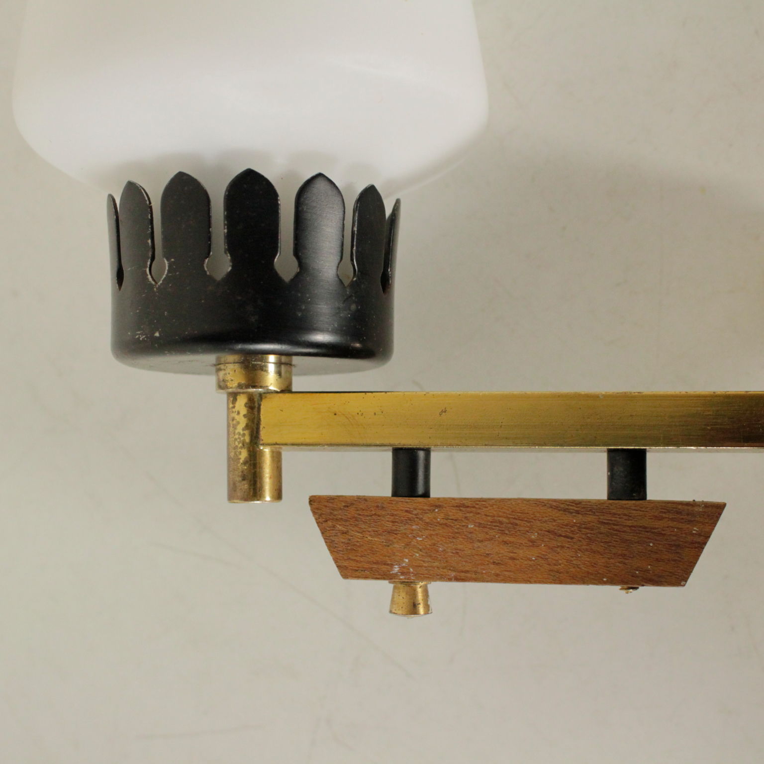 Coppia di lampade a parete; ottone, alluminio laccato, vetro opalino.