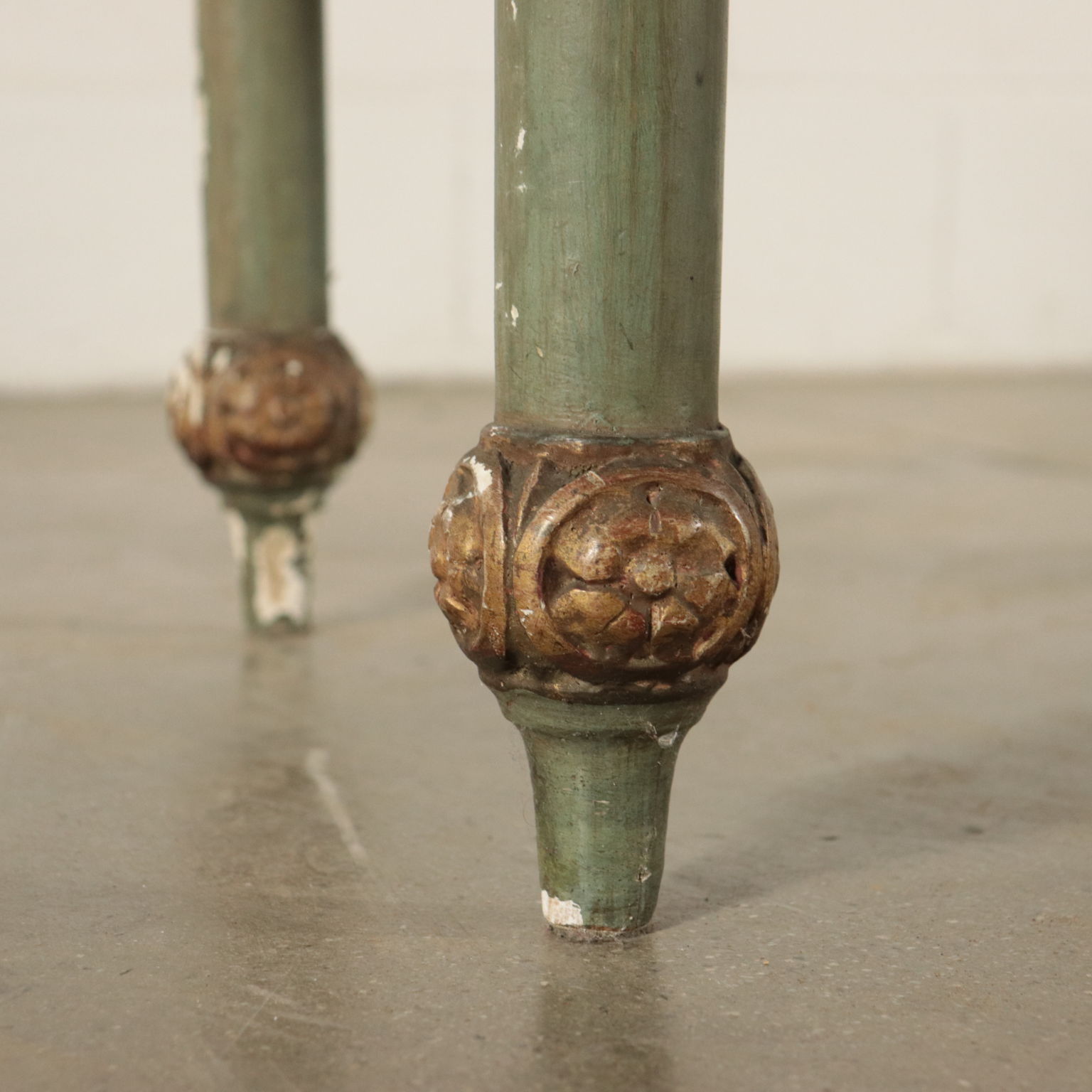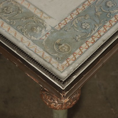 Realizzato con parti ricavate da antichi mobili neoclassici. Le gambe tornite, ornate con dadi intagliati e dorati, sono il reimpiego dei sostegni di un divano; il piano dipinto a scagliola è reimpiegato da una consolle, la decorazione a candelabra è stata riproposta successivamente lungo i lati corti.
