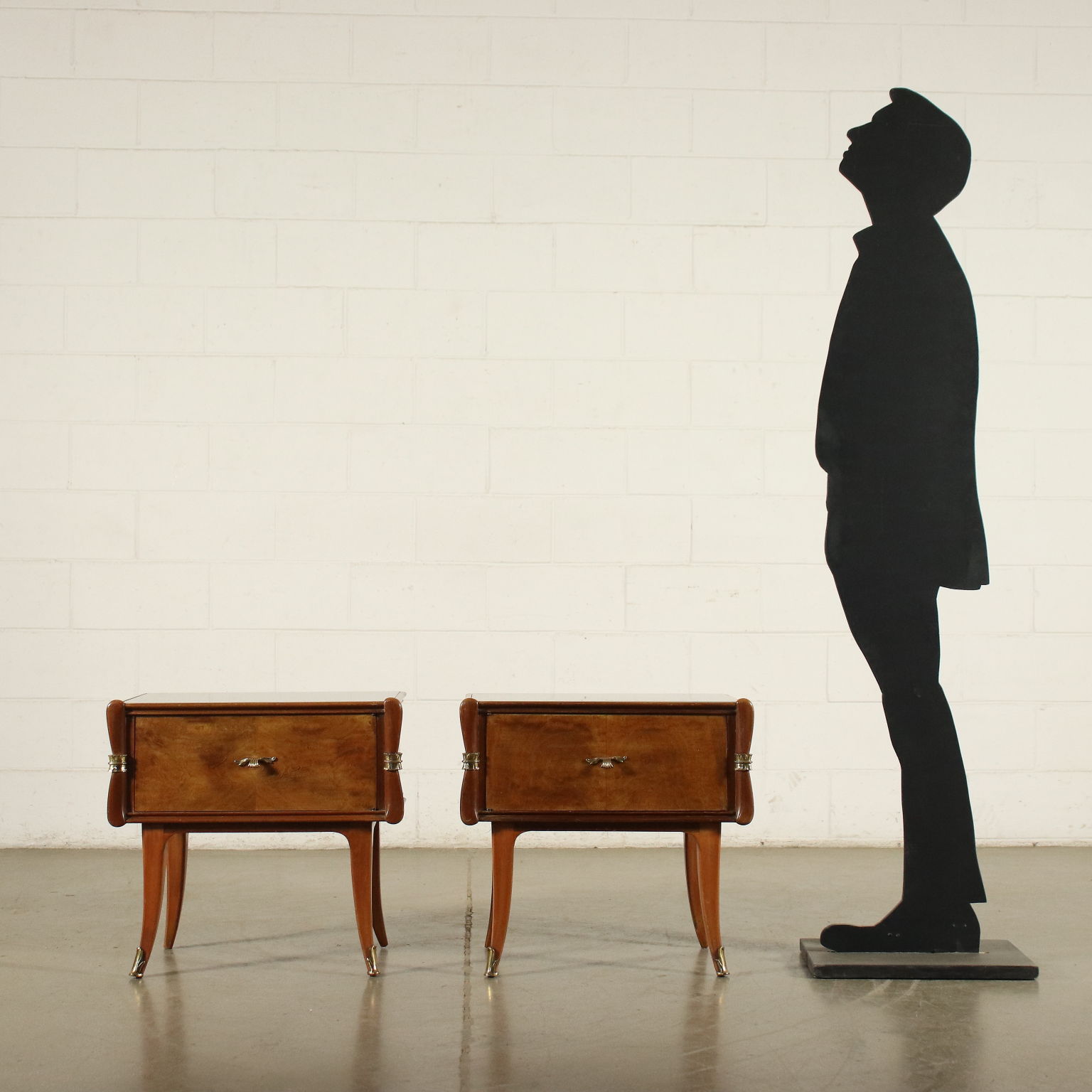 Coppia di comodini ad anta battente, legno impiallacciato Radica e Faggio, vetro retro trattato sul piano, particolari in ottone.