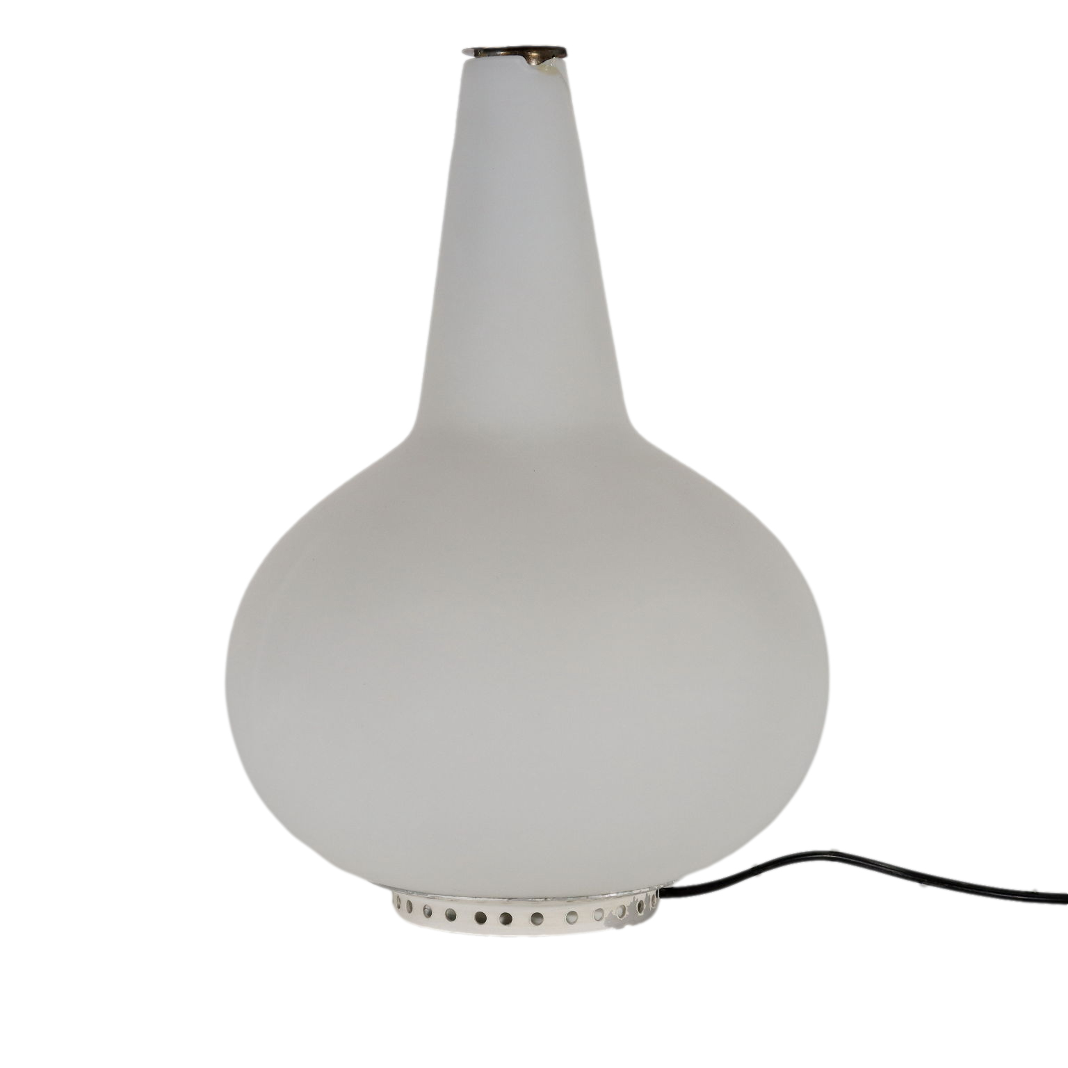 Vaso luminoso in vetro opalino con portafiori in ottone disegnato da Max Ingrand negli anni '50. Vetro sbeccato.