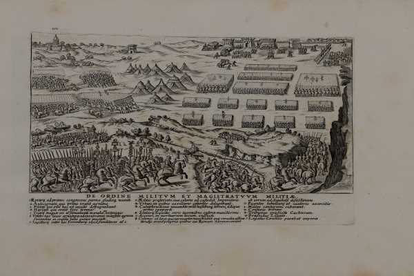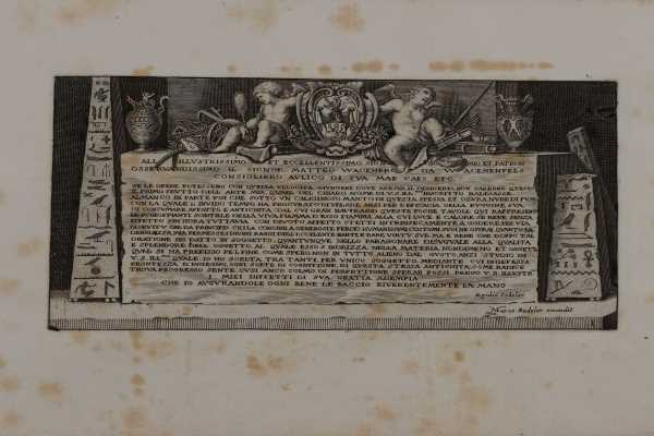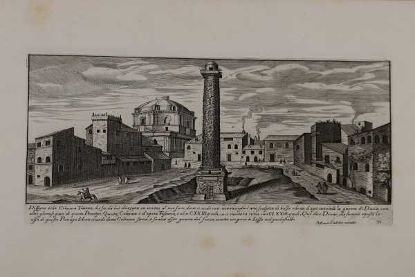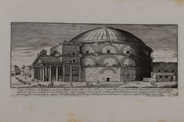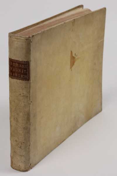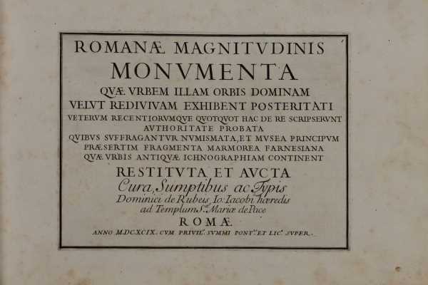Il nostro volume presenta due importanti opere uscite dalla tipografia della famiglia De Rossi, nel XVII secolo la maggiore officina per la produzione e il commercio di stampe artistiche a Roma, specializzata nelle descrizioni di Roma antica e moderna e dei suoi monumenti con una distribuzione a livello internazionale. “Romanae magnitudinis monumenta quae urbem illam Orbis dominam velut redivivam exhibent posteritati veterum recentiorumque auctoritate probata quibus suffragantur numismata, et Musea principum praesertim fragmenta marmorea Farnesiana quae urbis antiquae ichnographiam continent restituta et aucta” è la prima delle due opere: impressa nel 1699 Cura, Sumptibus ac typis Dominici de Rubeis, Io: Iacobi haeredis ad Templum S.Mariae de Pace, presenta 138 tavole incise in rame: il frontespizio, un'elaborata composizione architettonica in cui si inscrive la dedica al Cardinale Hieronymo Casanate, 18 tavole dedicate alla storia romana e alla sua potenza militare, 118 tavole di ricostruzione degli antichi monumenti della città eterna. Dalla descrizione del Cicognara, 3857: "Sotto ciascuna stampa leggonsi le dichiarazioni intagliate in rame; sono tav. 138 raccolte in questa Calcografia e riprodotte con questo frontespizio, le quali erano state impiegate precedentemente in simili opere, come vedesi dalle tavole ritoccate, e nuovamente numerate per ridurle in questo ordine." L'Enciclopedia Treccani attribuisce questo capolavoro a Pier Santi Bartoli, che è riportato come incisore in calce alla tavola di dedica dell'opera: “La reputazione di architetto, o meglio di studioso di architettura, del Bartoli è legata alla ricostruzione da lui proposta, nell'atto di inciderli in rame, di molti fra i più insigni monumenti dell'Urbe A metà strada fra il cinquecentesco Speculum di A. Lafréry e le settecentesche Antichità di G. B. Piranesi, il Bartoli assume per suo conto, con una preparazione ed una disposizione d'animo più vicine a quella spiccatamente archeologica del primo che a quella essenzialmente lirica e in un certo senso drammatica del secondo, il tema della "magnificenza di Roma" e lo sviscera con una tenacia ed una costanza che durano un'intera vita, estendendolo alle pitture, alle lucerne sepolcrali, alle monete, alle gemme antiche”. Nelle 118 tavole i monumenti dell'antica Roma vengono riproposti nella loro integrità in incisioni dai tratti netti e nitidi. Tutt'altro carattere ha l'opera seguente: Vestigi delle antichità di Roma Tivoli Pozzuolo e altri luoghi come si ritrovavano nel secolo M.D., impressi da Gio. Iacomo de Rossi alla Pace, sul cantone, all'insegna di Parigi, senza indicazione di data (ma 1660): qui protagonista è la Roma del XVI secolo con vedute in cui le rovine degli antichi monumenti si inseriscono come sfondo alla vita delle piccole figurette che animano le scene. L'incisore è Marco Sadeler, membro della più grande e probabilmente più nota tra le dinastie di incisori fiamminghi che operarono in Europa nei secoli XVI, XVII e seguenti, sia come artisti che come editori. Marco riproduce un precedente lavoro di Aegidius Sadeler, incisore di corte di Rodolfo II, edito a Praga nel 1606, reincidendo i rami. A sua volta quest'opera era in parte una riproduzione in formato ridotto dell'opera “I vestigi dell'antichità di Roma raccolti et ritratti in perspettiua con ogni diligentia da Stefano du Perac parisino”, pubblicato a Roma presso Lorenzo della Vaccheria nel 1575. Le stesse 38 vedute di Roma, precedute da un bel frontespizio figurato e da una dedica a Matteo Wachker da Wachkenfeld Consigliere Aulico, vengono riproposte in uno stile più ricco di chiaroscuri e ad esse si aggiungono 2 vedute di Tivoli, 7 di Baia e Pozzuoli, 1 di Barland nella Zelanda e 1 del Castello di Vissehrad in Boemia.