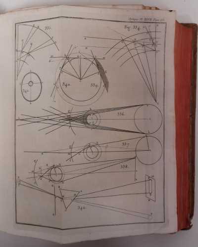 Il nostro volume presenta la traduzione francese nel trattato “ A Compleat System of Optics” pubblicato in Inghilterra nel 1738 dal matematico Robert Smith, professore a Cambridge, insignito del titolo di Professore Plumiano di Astronomia e Filosofia sperimentale dal 1716 al 1760. La traduzione è opera del matematico Nicolas-Claude Duval-Leroy, professore a l'Ecole d'Artillerie di Brest, città in cui è attiva dal XVII secolo la stamperia della famiglia Malassis. Al testo del professore inglese il traduttore aggiunge importanti contributi quali i “Remarques nouvelles sur les Lunettes achromatiques” e la descrizione dell'Héliostat. Il testo è diviso in tre libri: un primo libro “contenant une exposition simple & facile de l'Optique”, il secondo “Dans lequel l'Optique est traitée avec l'étendue & l'exactitude convenables, à l'aide de la Géométrie et du Calcul” e il terzo “De la manière de tailler les verres & les miroirs des télescopes; & description des instruments d'optique”. Seguono le “Additions sur une difficulte concernant le mouvement rectiligne de la lumière”. Il testo è accompagnato da 67 planches ripiegate incise su rame con schemi, diagrammi, figure ottiche e strumenti (nel nostro esemplare presenti 66 planches: manca la planche XLI).Fregio floreale al frontespizio; testatine, capilettera e finalini incisi