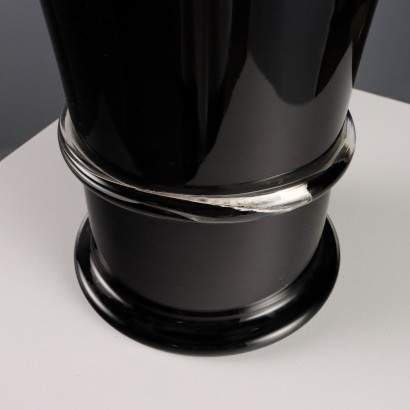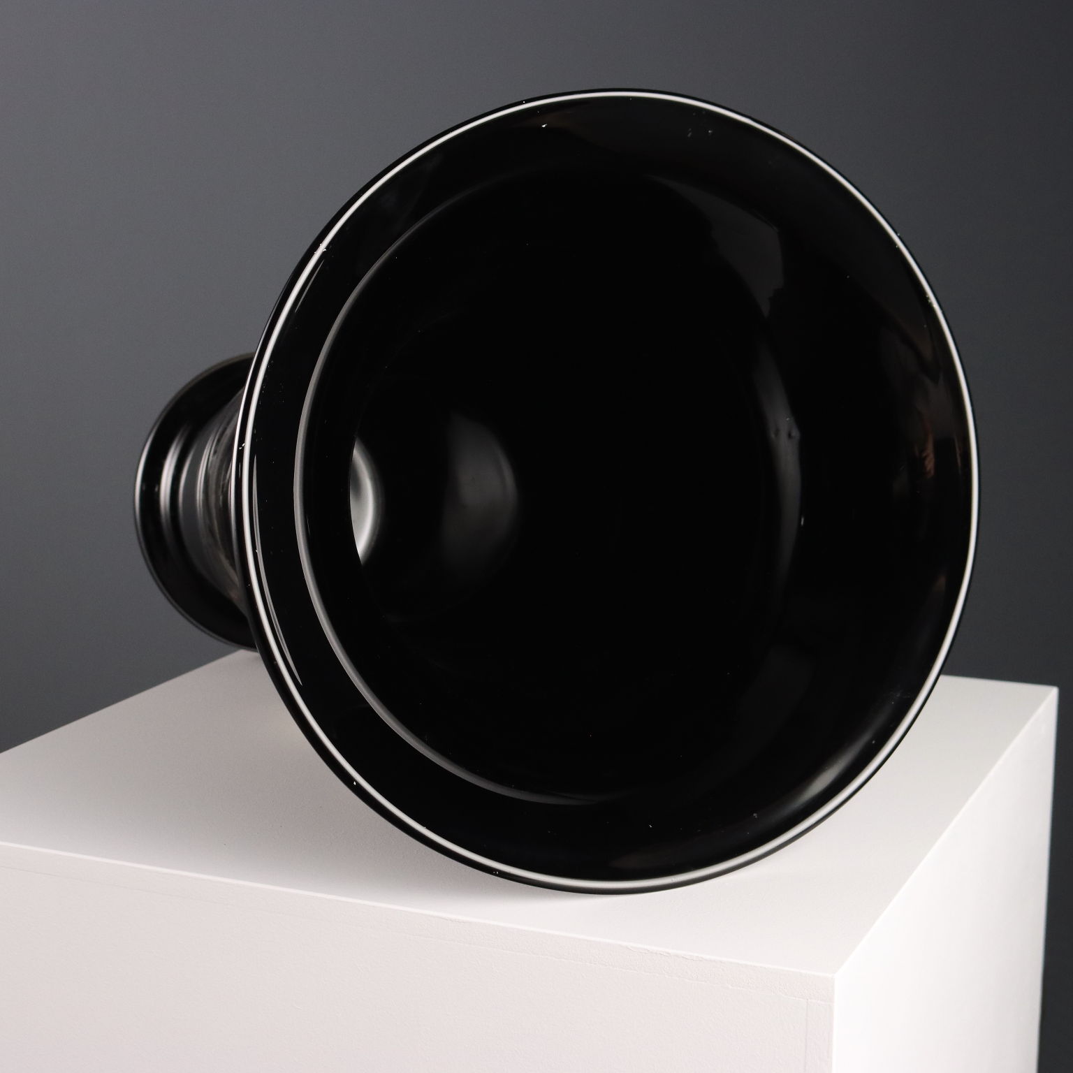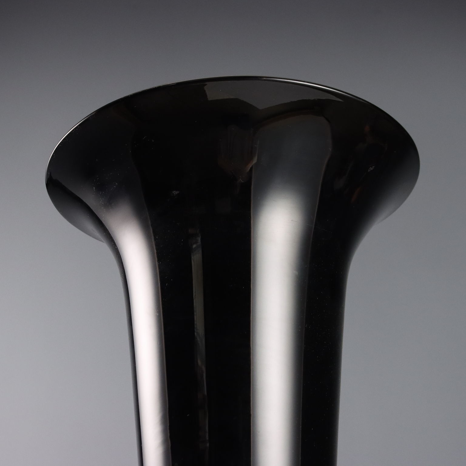 Vaso a tromba in vetro nero, manifattura Seguso Vetri d'Arte. Sotto la base firma a punta della manifattura.
