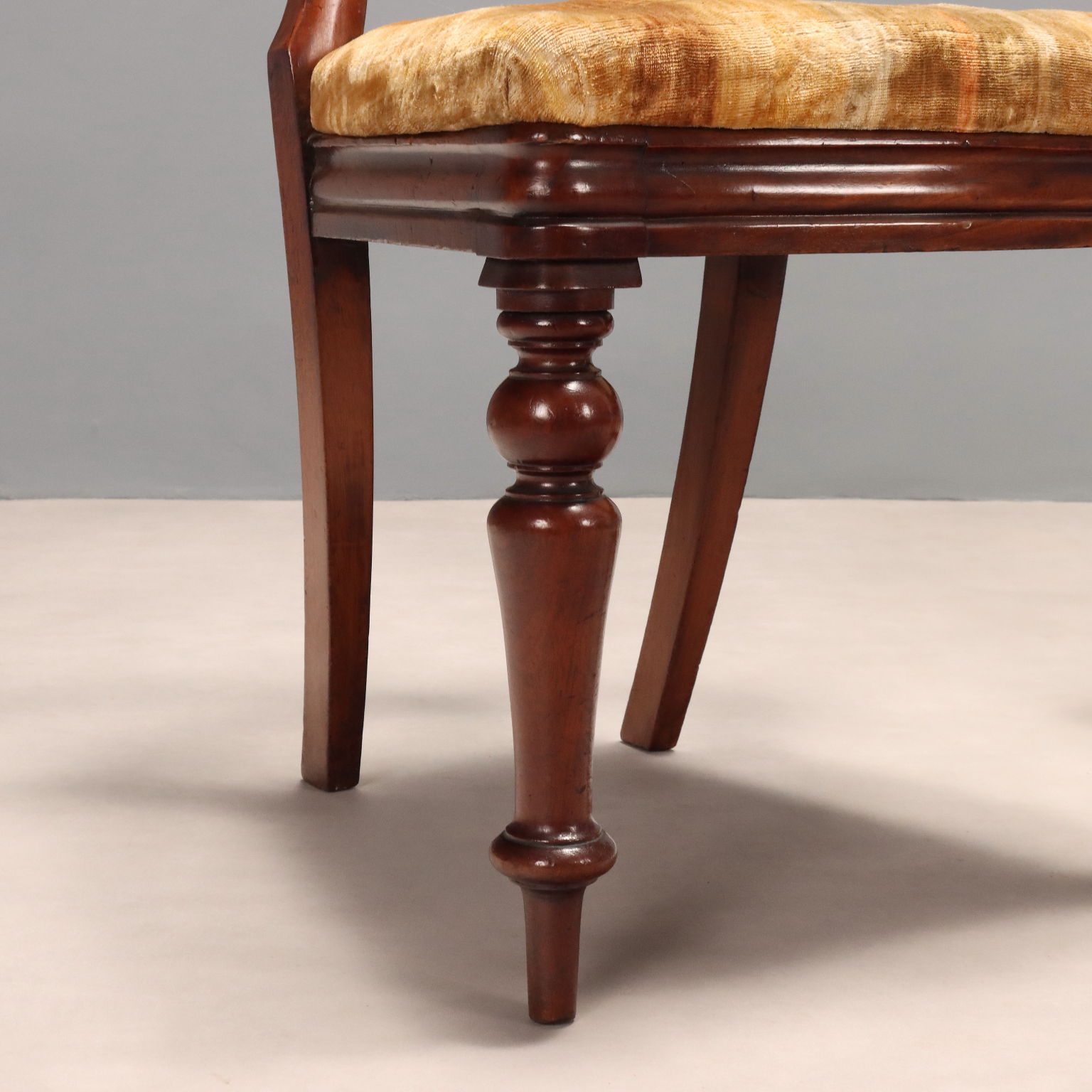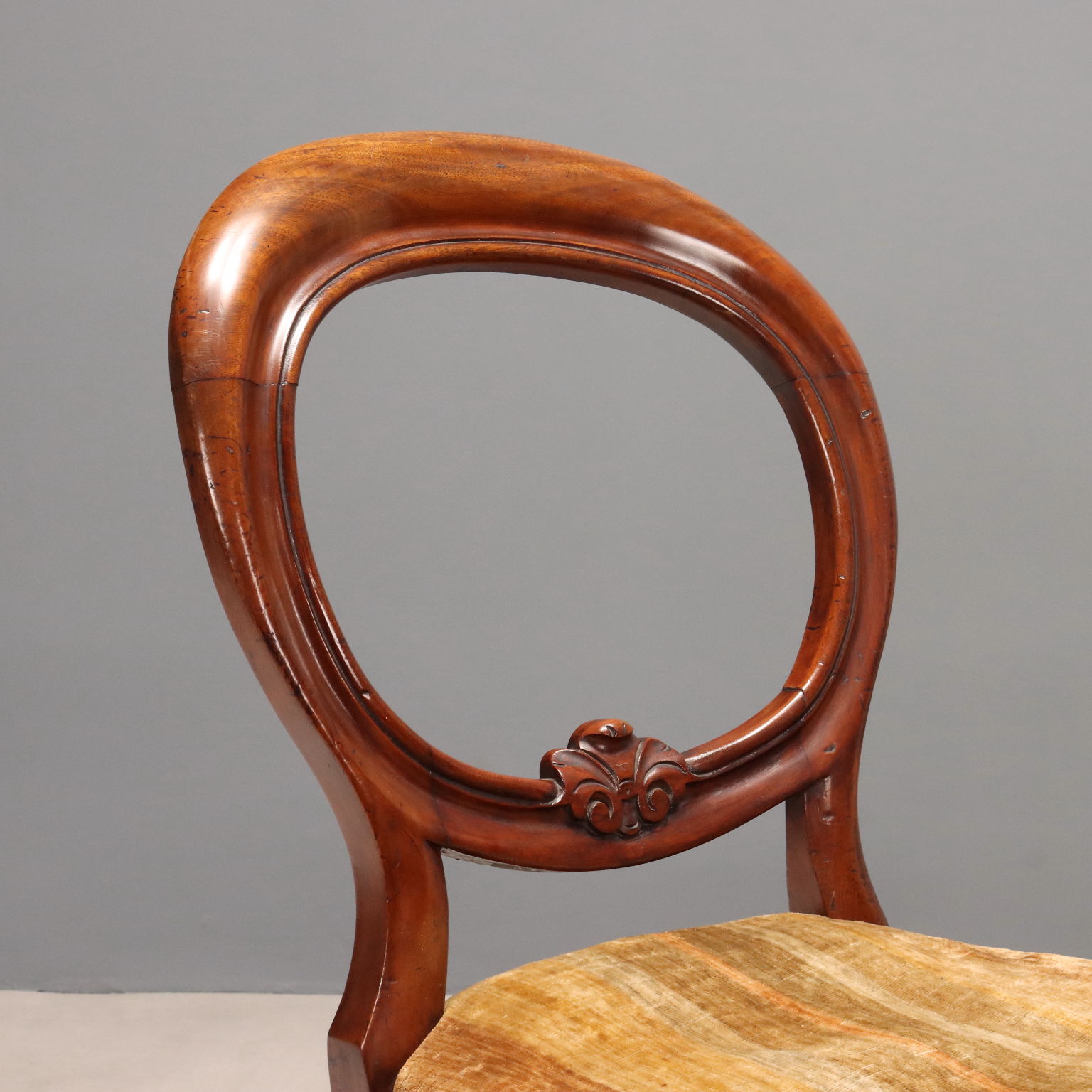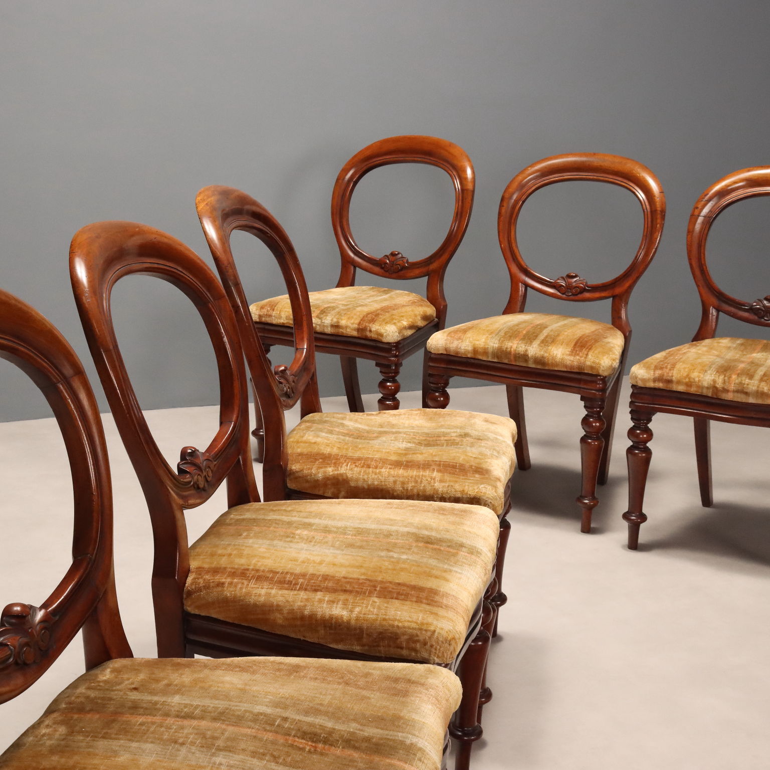 Gruppo di sei sedie Luigi Filippo in mogano, schienale a giorno con piccolo intaglio fogliaceo, gambe anteriori tornite, seduta imbottita. Italia, metà XIX Secolo.