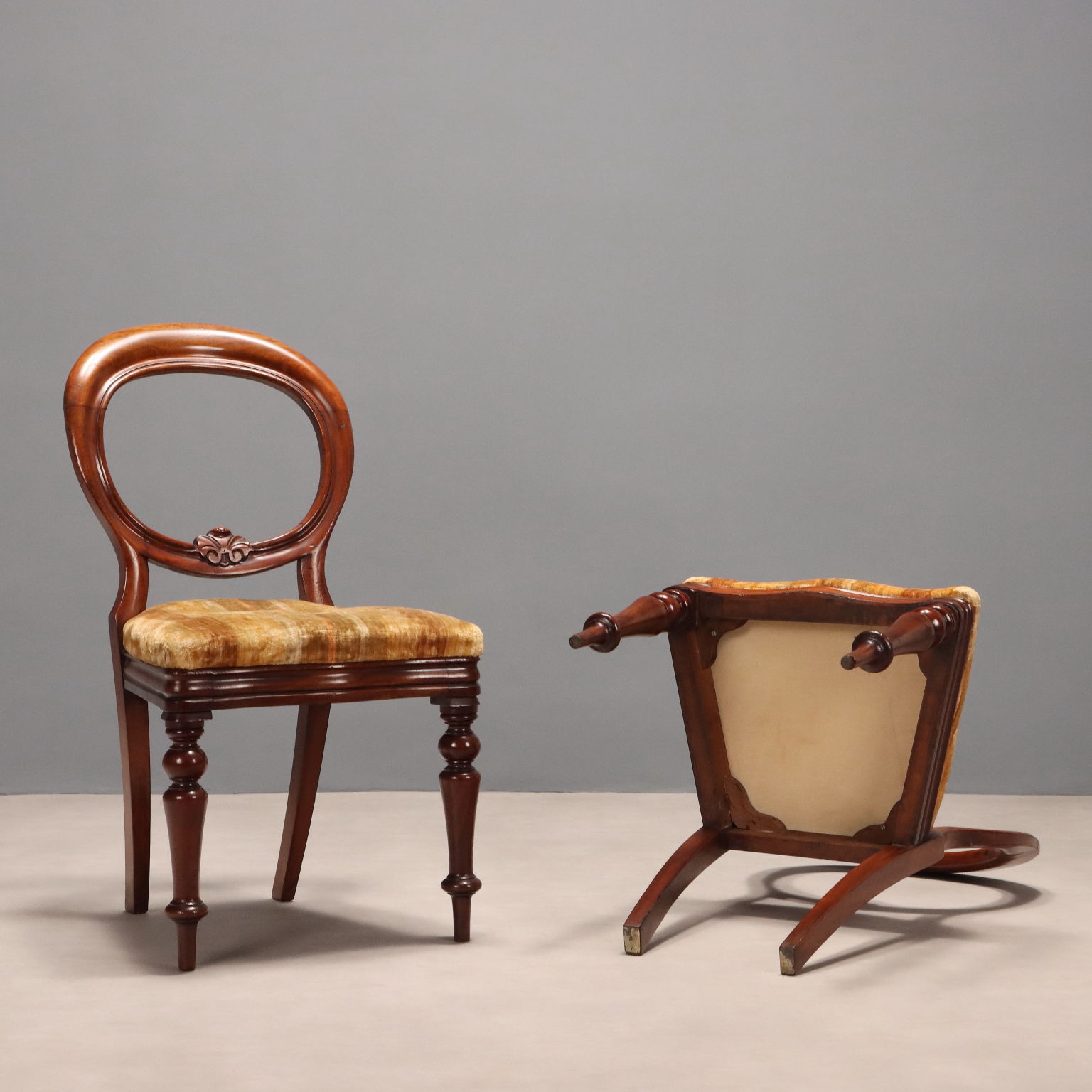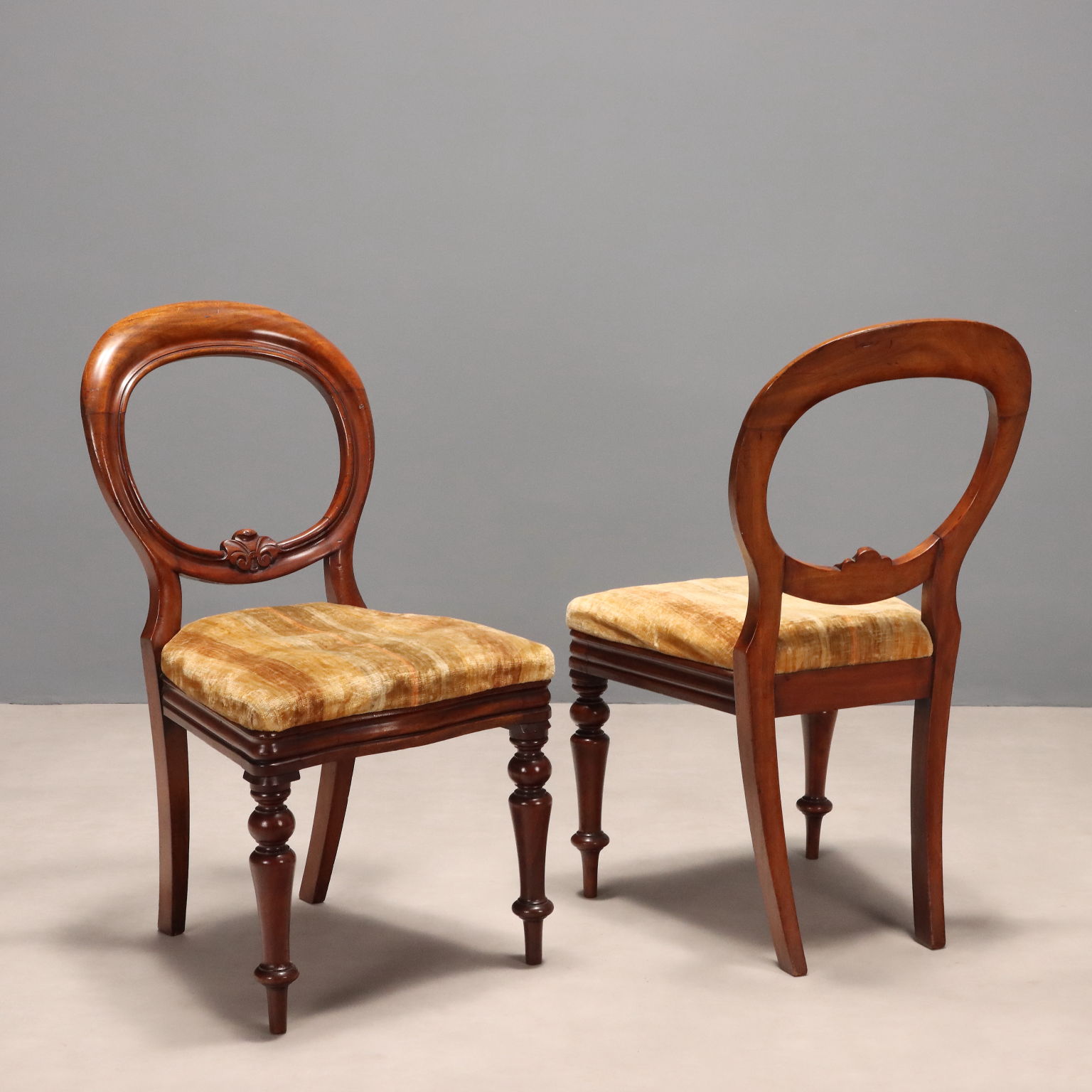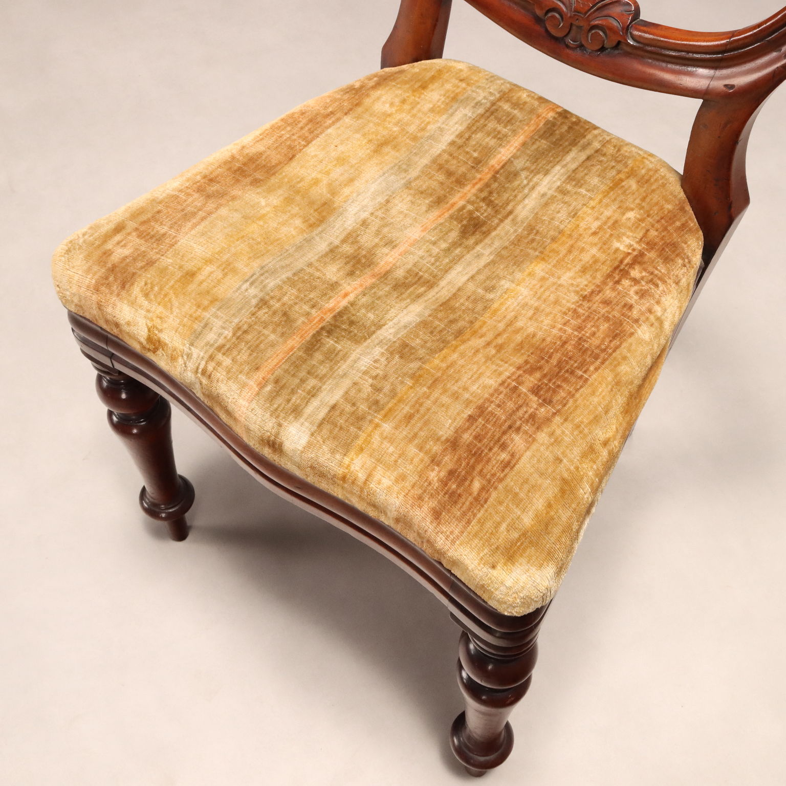 Gruppo di sei sedie Luigi Filippo in mogano, schienale a giorno con piccolo intaglio fogliaceo, gambe anteriori tornite, seduta imbottita. Italia, metà XIX Secolo.