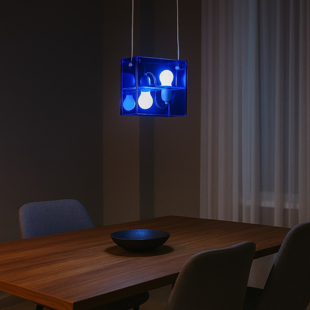 Lampada a soffitto con diffusore in materiale plastico blu, apparato di fissaggio in metallo cromato. Riporta il marchio della produzione.