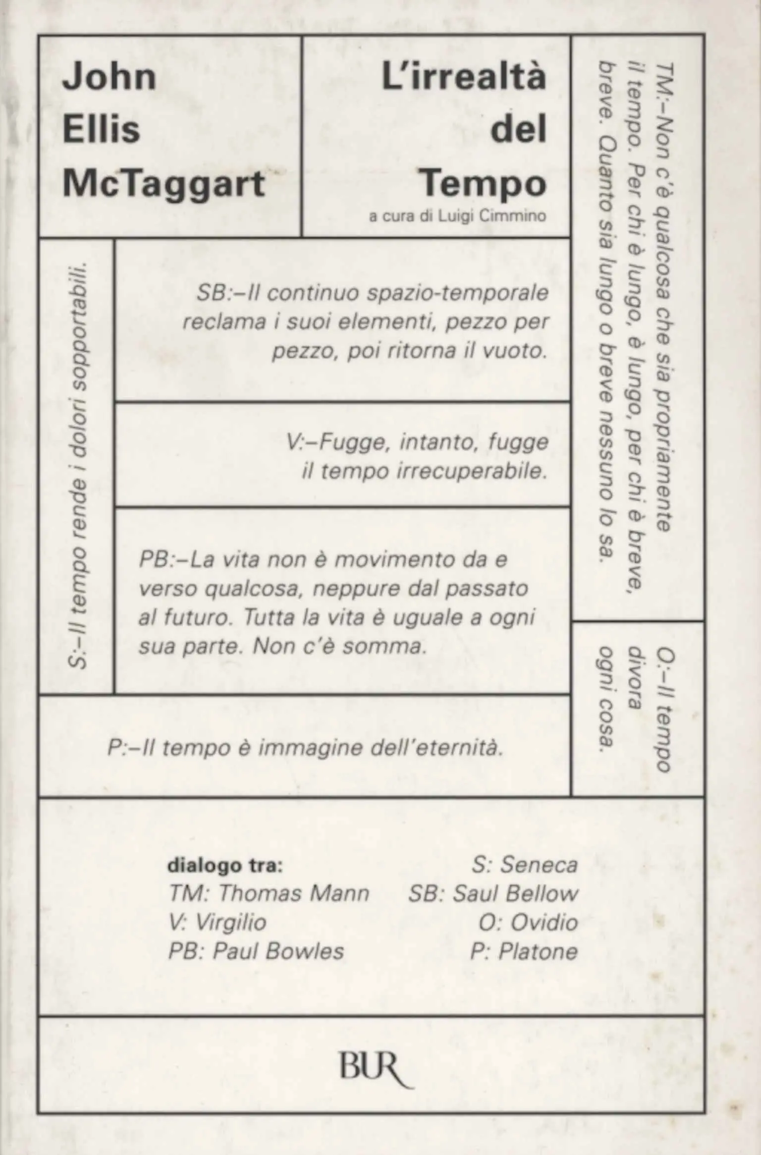 C'è un tempo della coscienza, fatto di presente, passato e futuro, di memoria e speranza, e un tempo della scienza, fatto di successioni e simultaneità. McTaggart li chiama serie A e serie B. Questo libro raccoglie i suoi scritti sul tema ("L'irrealtà del tempo", "Il rapporto tra Tempo ed Eternità" e"Misticismo"), con un saggio, a cura di Luigi Cimmino, che, a partire da McTaggart, illustra gli sviluppi più recenti della filosofia del tempo. Viviamo nel tempo, e questo dovrebbe bastarci. Eppure diciamo che il tempo passa. Ma il 2005, che ci siamo lasciati alle spalle, è prima del 2006, e in questo suo esser prima pare non potersi muovere. Così ieri rispetto a oggi. Cos'è dunque che passa?