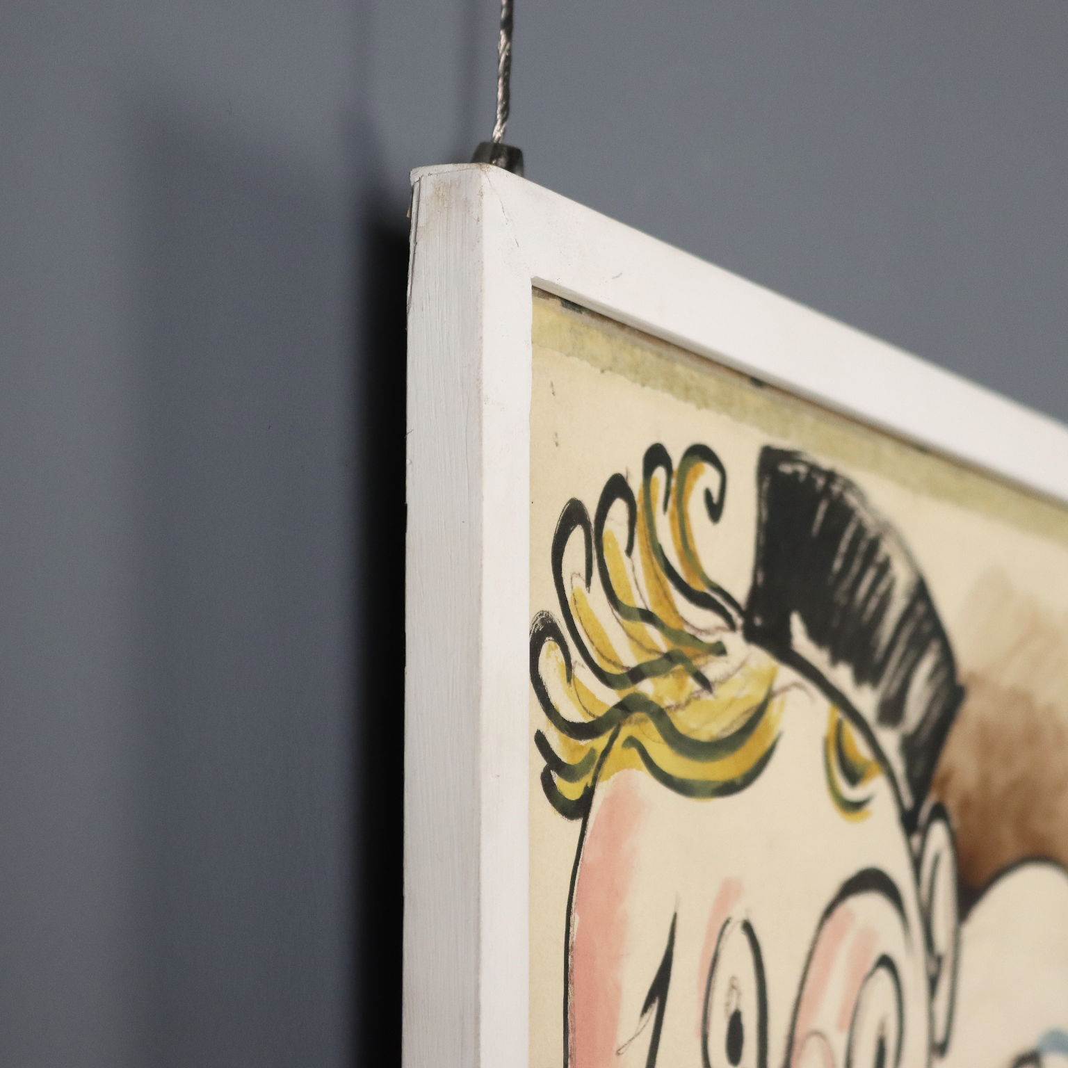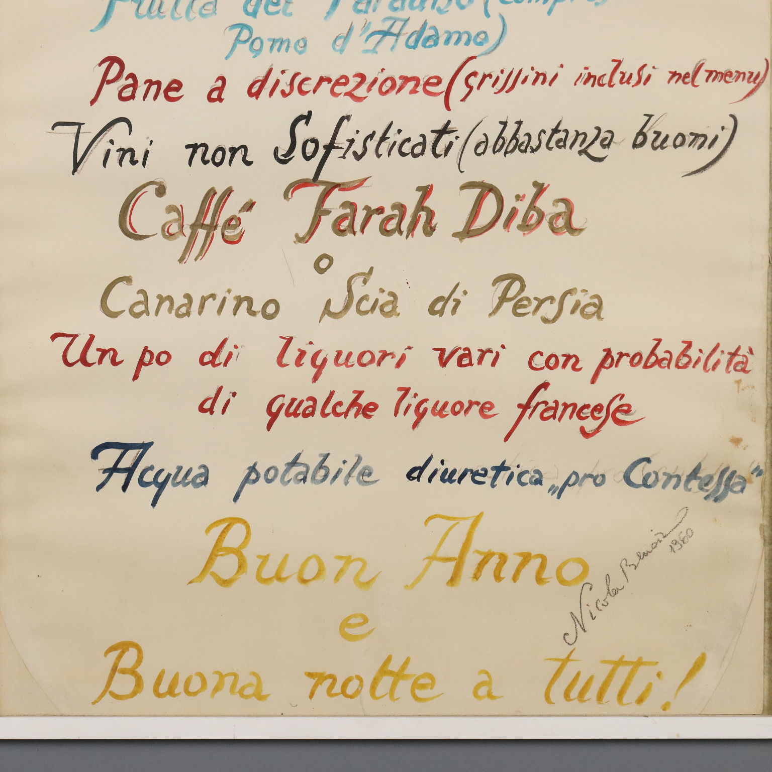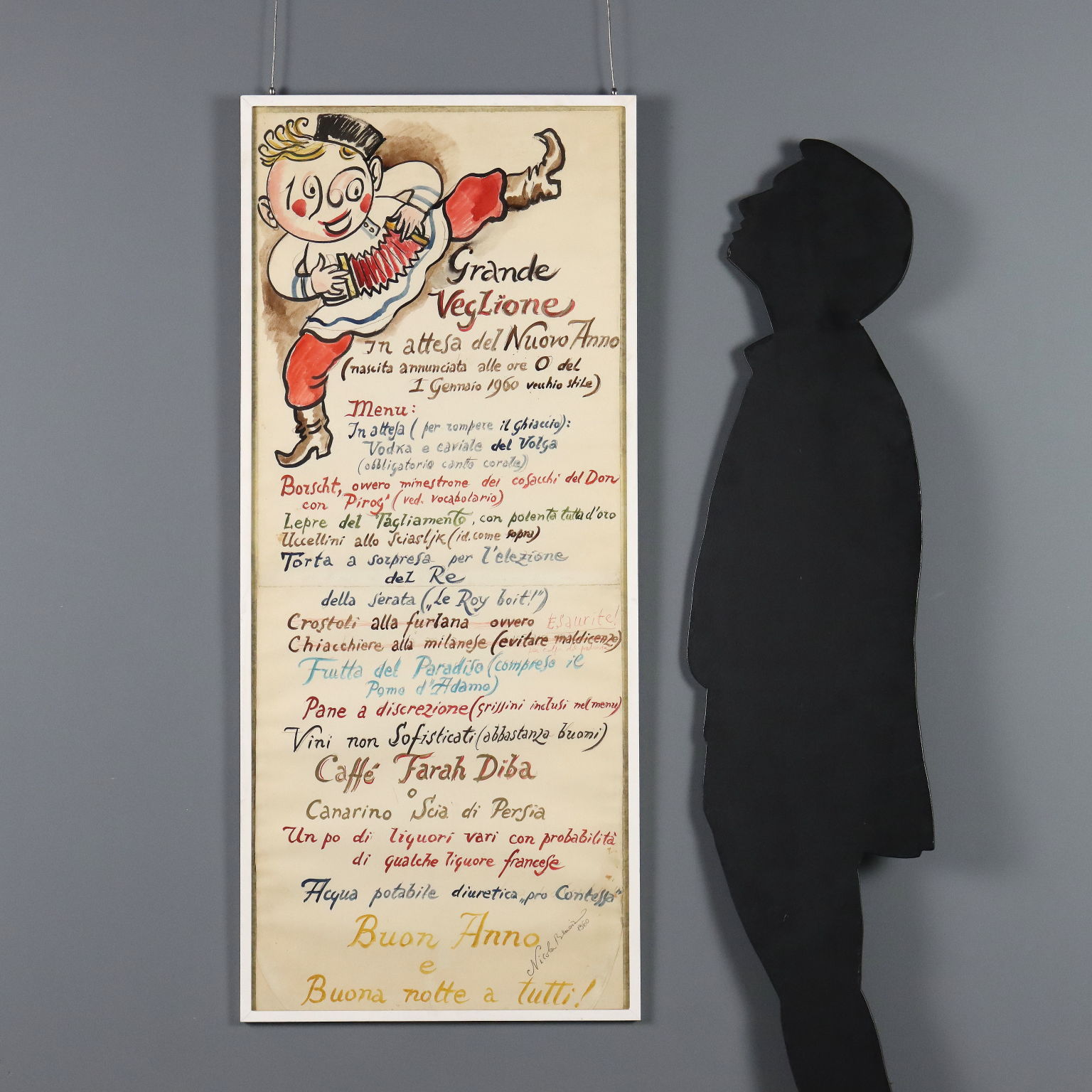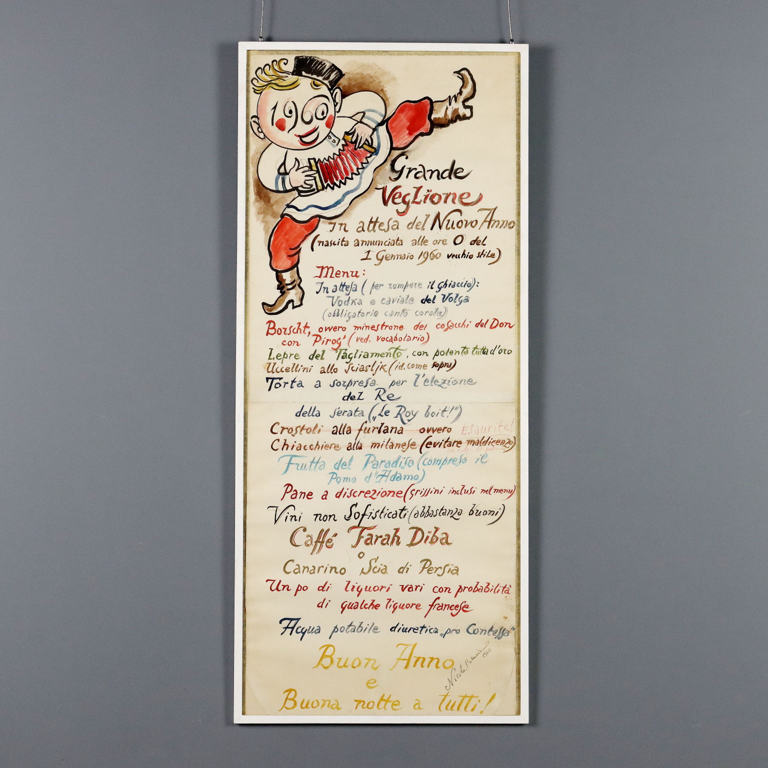 Tecnica mista su carta. Firmato e datato in basso a destra. Divertente e ironica presentazione del menu per il veglione del Capodanno 1960, ad opera del celebre scenografo, pittore e disegnatore russo, Nicola Benois, che dal 1935 fu lo scenografo principale del Teatro Alla Scala di Milano. Allegata all' opera la foto del un biglietto di ringraziamento che accompagnava l' opera, pe l'amico presso cui l'artista condivise la festa. Opera in cornice.