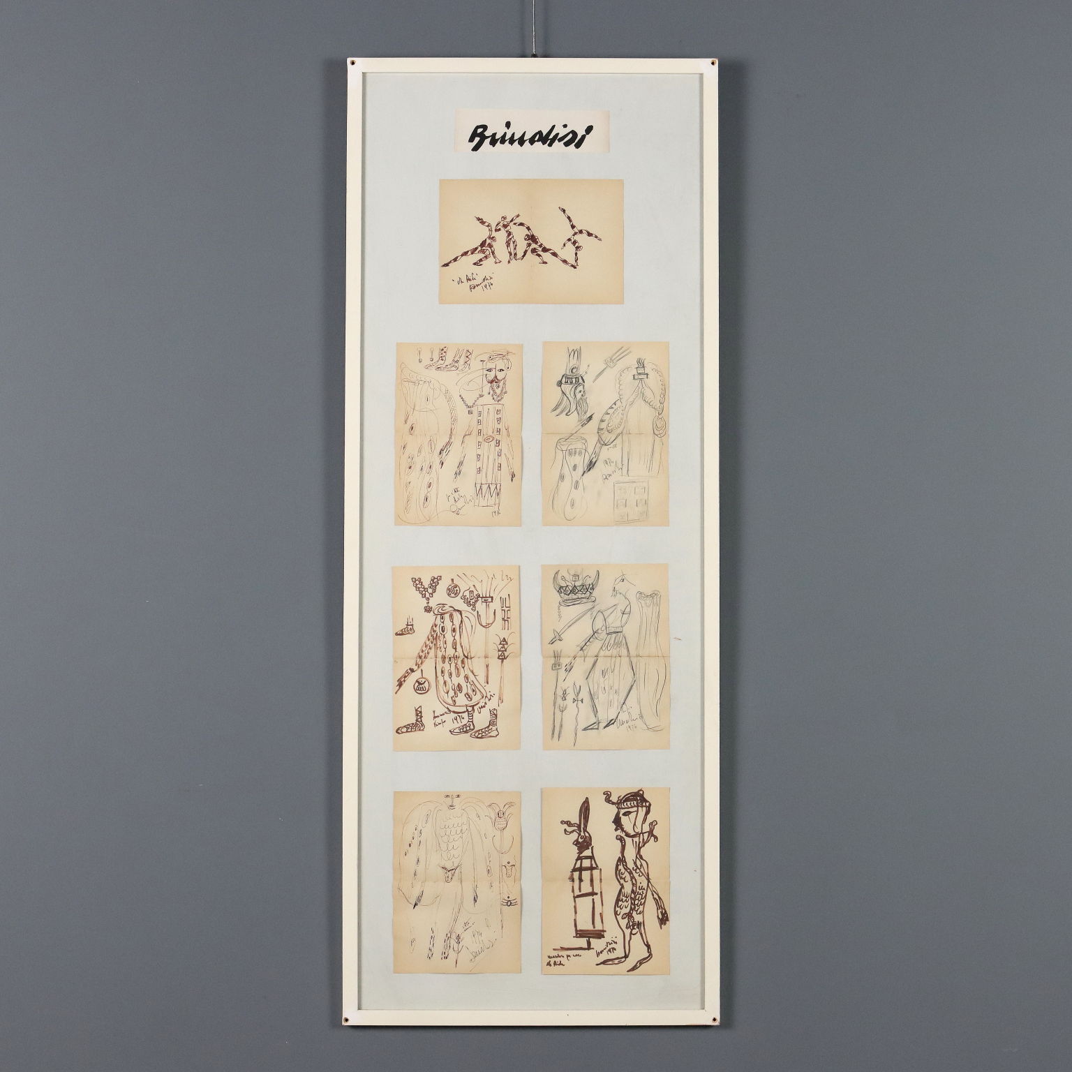 Tecnica mista su carta. Sette bozzetti firmati e datati, e, in alto, la riproduzione della firma dell'artista. Sono lavori dell'importante pittore italiano Remo Brindisi la cui pittura, legata nelle opere giovanili ad un impianto descrittivo e realistico, aggiunge nella maturità sfumature espressioniste, dando vita a un suo linguaggio neofigurativo. La sua produzione è sempre impregnata di intenti sociali e politici. Brindisi lavorò anche come scultore, illustratore, scrittore, scenografo, curatore di iniziative culturali. Proviene da collezione privata milanese. Speciale fu la sua collaborazione per la realizzazione delle grandiose scene e dei costumi per l'edizione dell'Aida all'Arena di Verona del 1974, di cui qui è proposta una serie di sette bozzetti, firmati e datati. In cornice