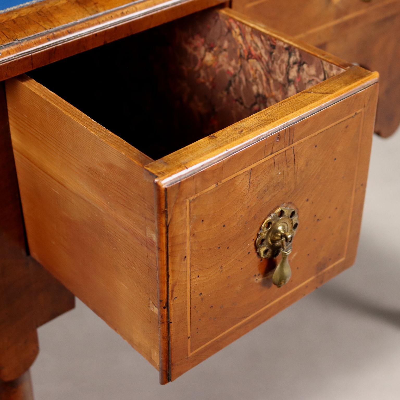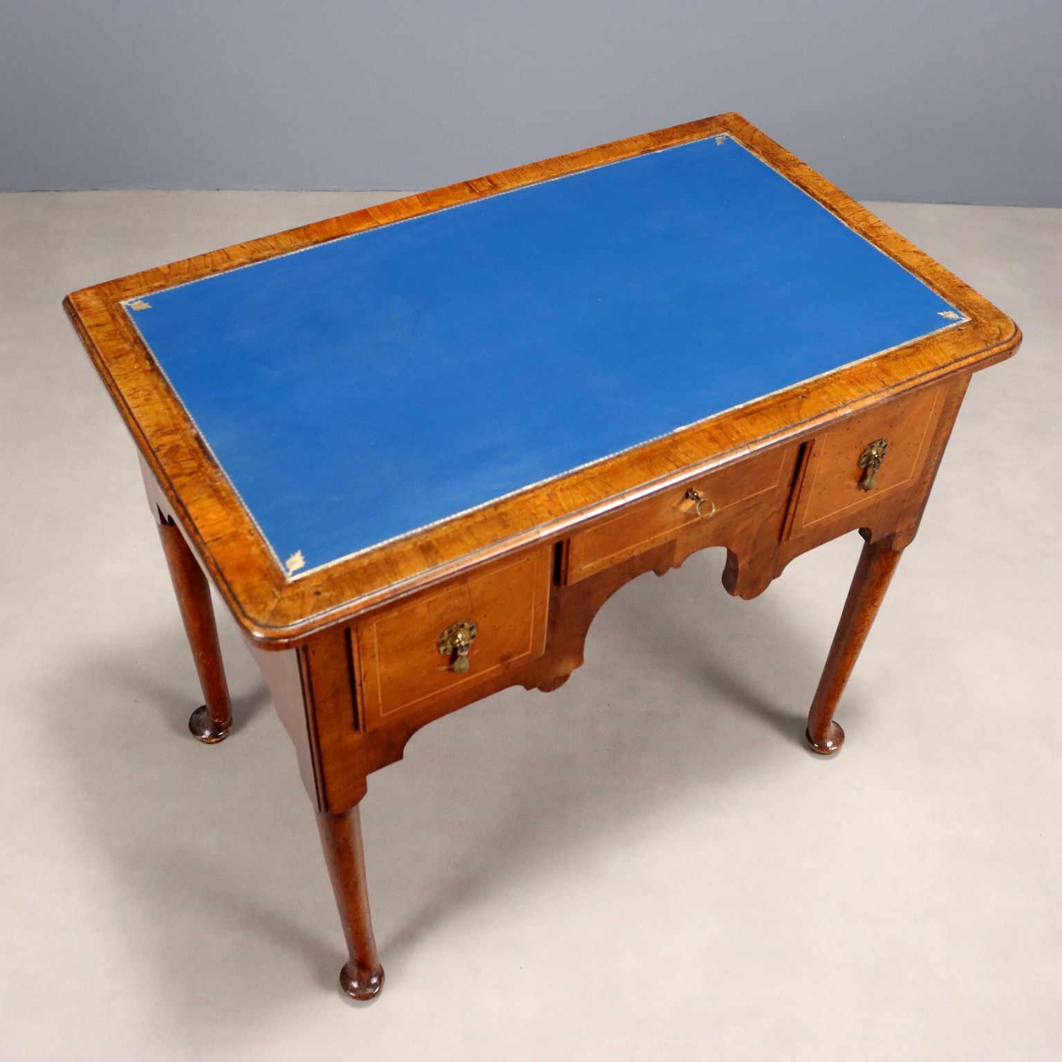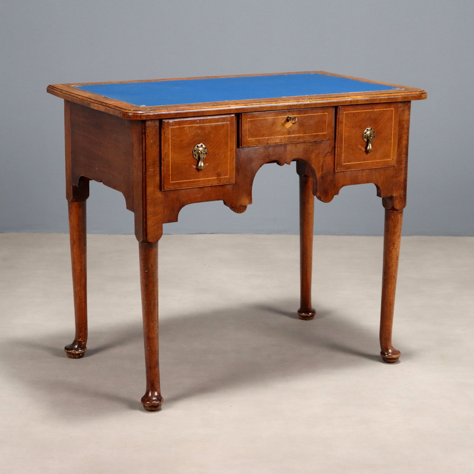 Piccolo scrittoietto Edoardiano in noce. Fronte a tre cassetti con filettature in acero e balaustra mossa. Piano con inserto in pelle blu, gambe tornite culminanti con piedi a cuscinetto. Inghilterra, fine XIX Secolo.