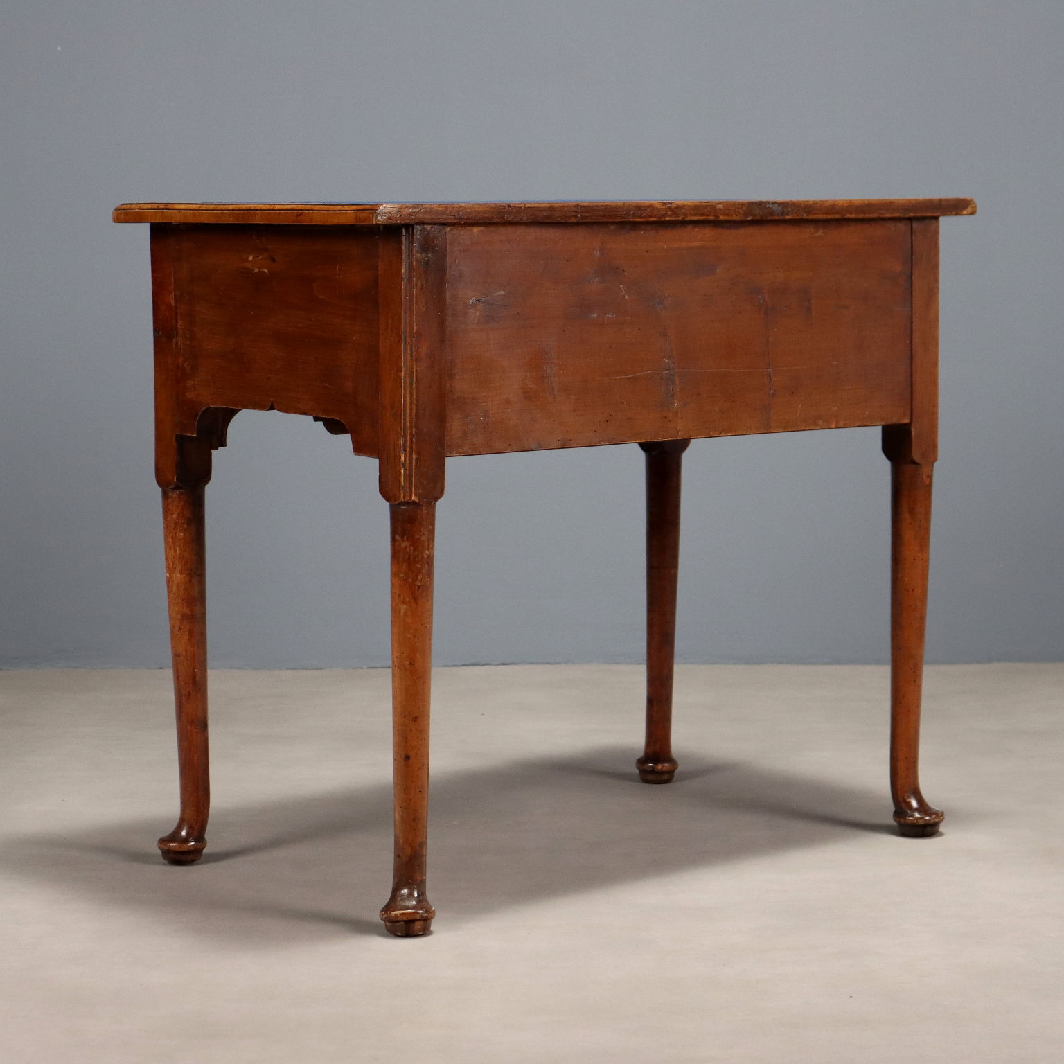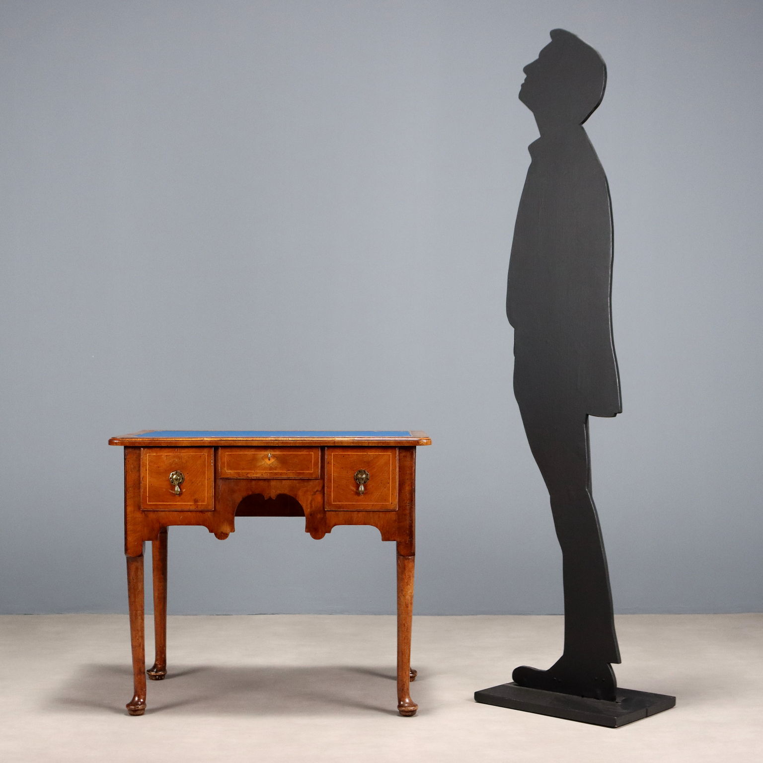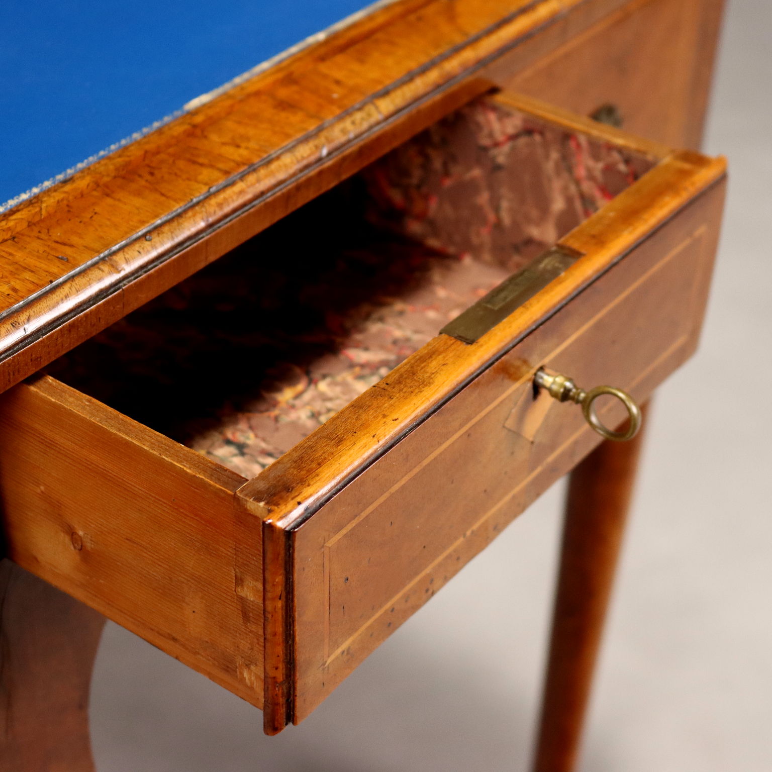 Piccolo scrittoietto Edoardiano in noce. Fronte a tre cassetti con filettature in acero e balaustra mossa. Piano con inserto in pelle blu, gambe tornite culminanti con piedi a cuscinetto. Inghilterra, fine XIX Secolo.