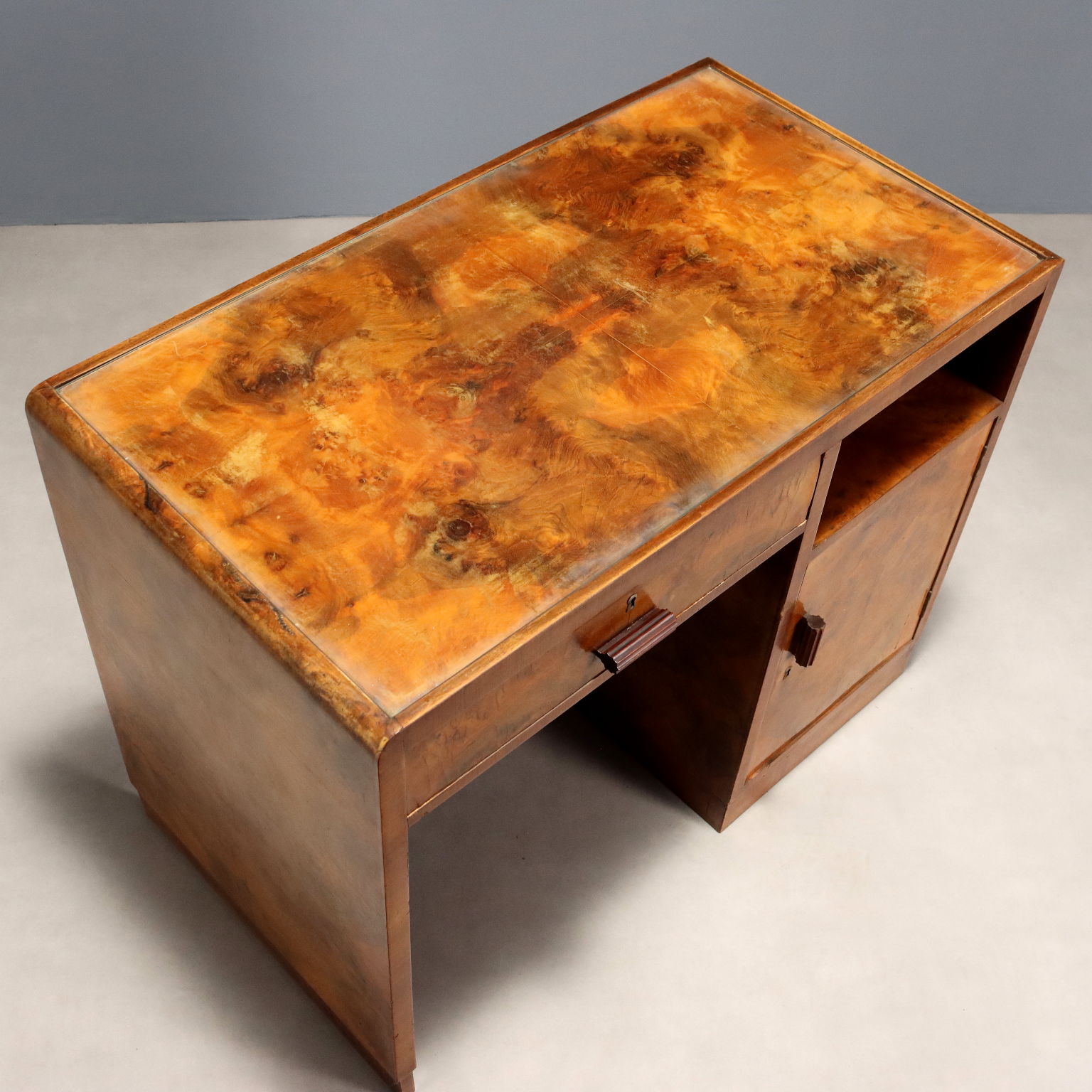 Scrittoio Art Decò impiallacciato in mogano e radica di mogano. Fronte con cassetto sottopiano, vano a giorno e anta laterali. Piano in vetro. Italia, primo quarto XX Secolo.