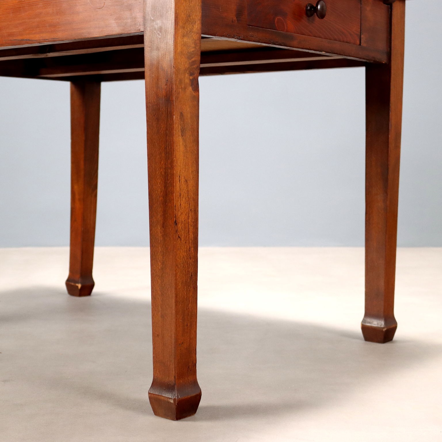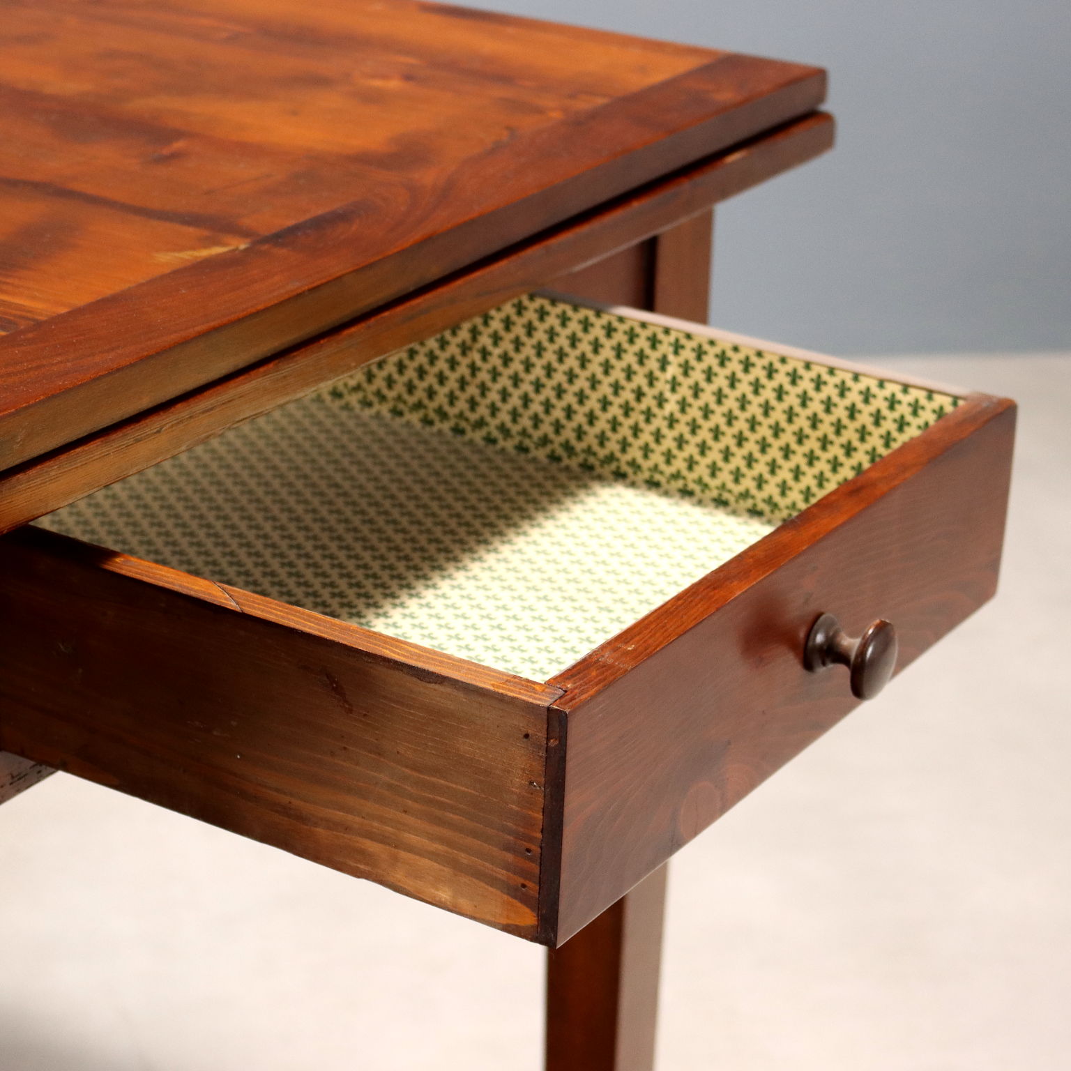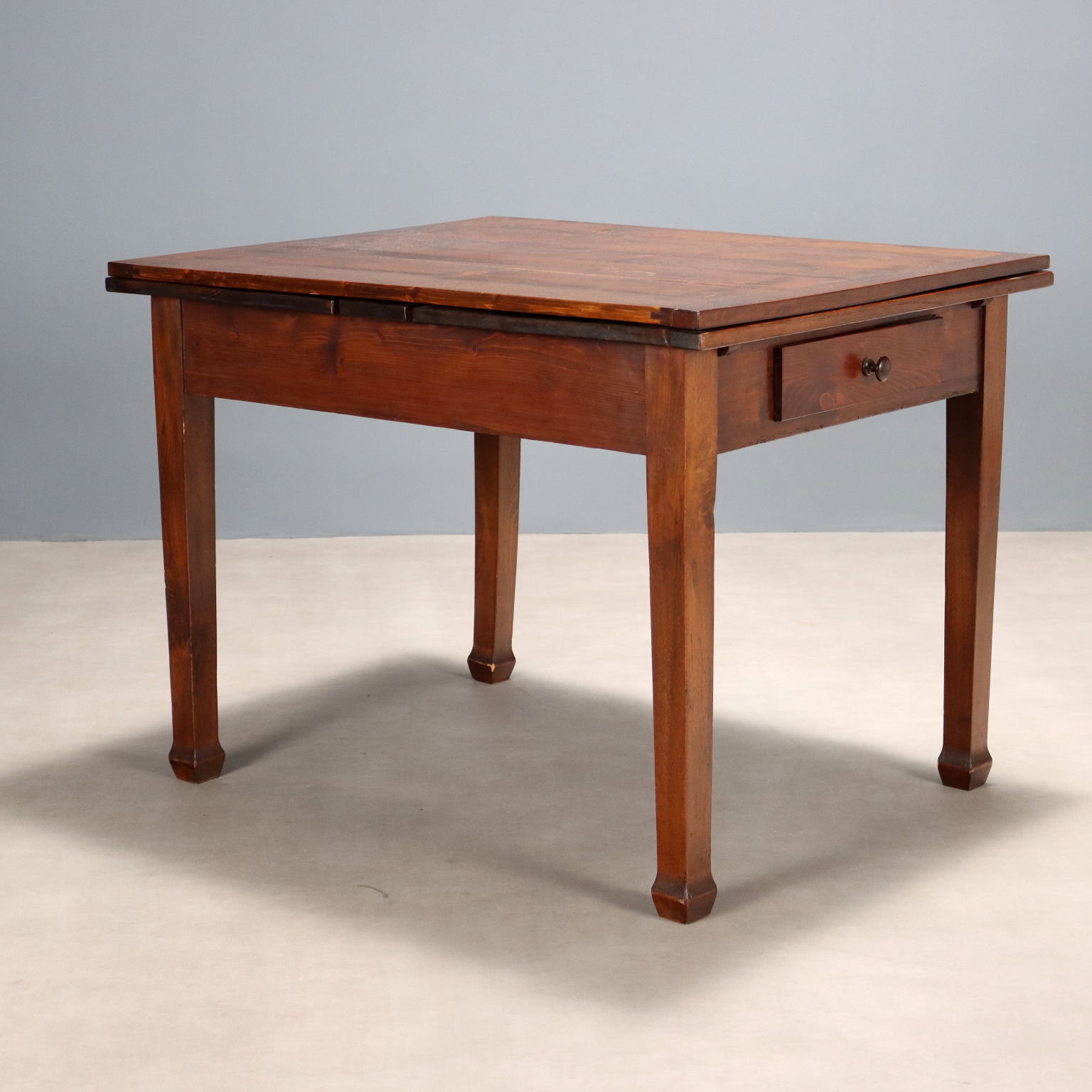 Tavolo allungabile in abete e faggio tinti noce. Due allunghe e cassetto nel lato corto sottopiano, gambe leggermente tronco coniche. Italia, fine XIX Secolo.