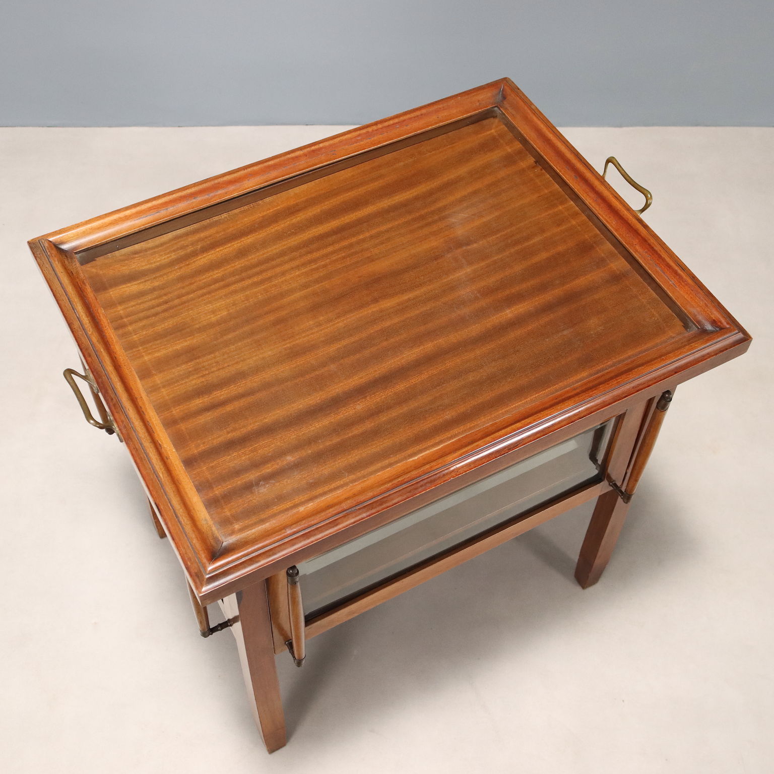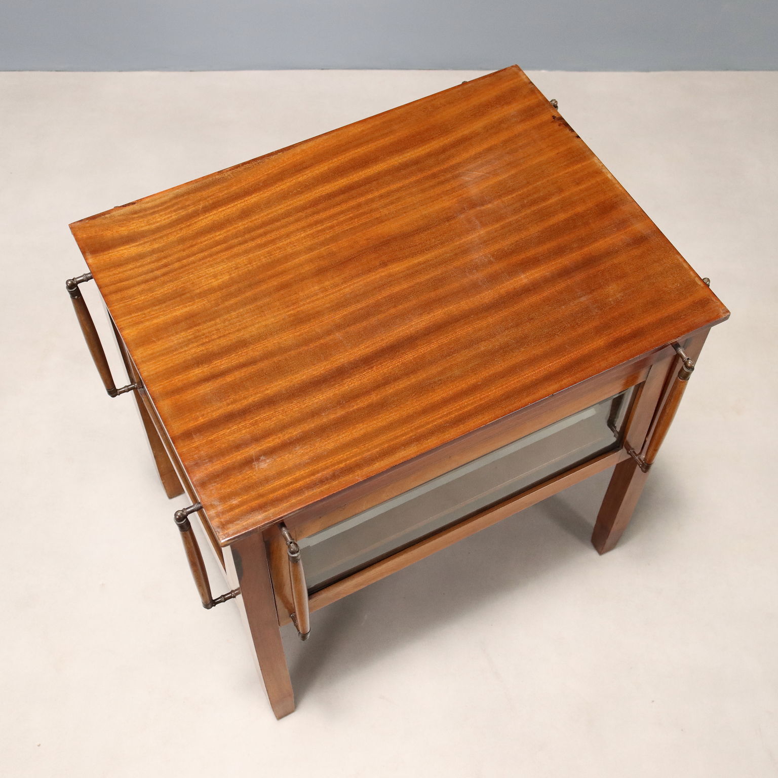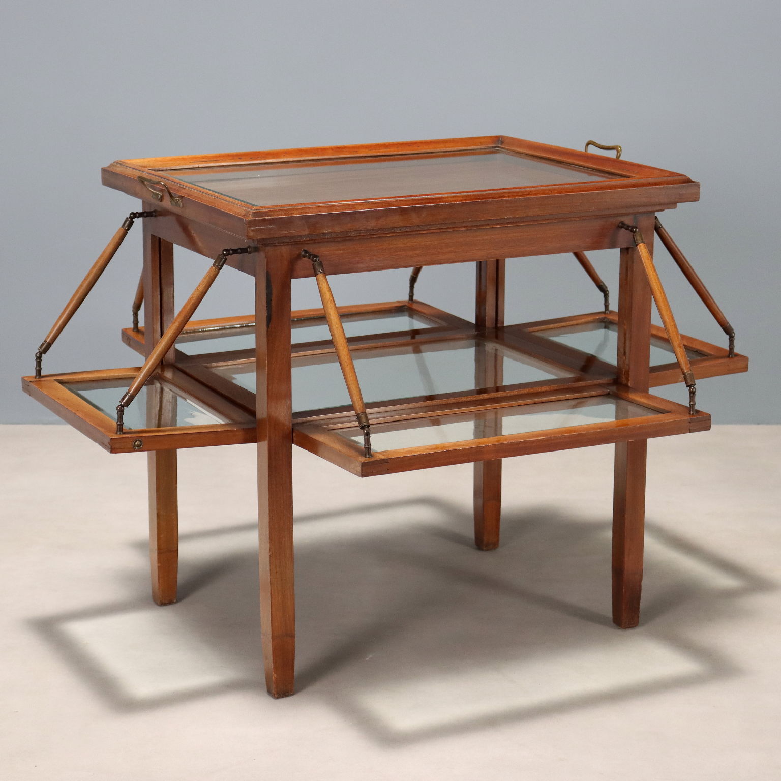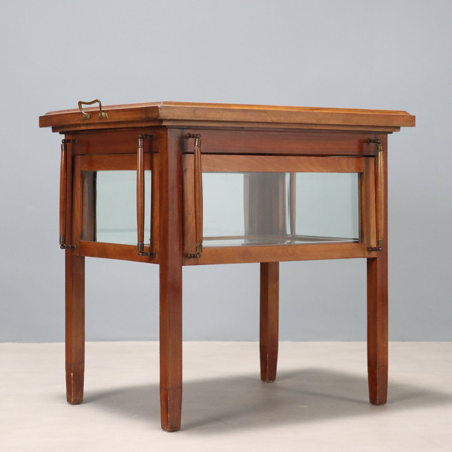 Tavolino espositore in mogano e vetri bisellati. Vassoio con piano in vetro e maniglie in bronzo sovrapposto al piano superiore, sui quattro lati ante basculanti apribili con coppia di maniglie in bronzo e mogano. Italia, fine XIX Secolo.