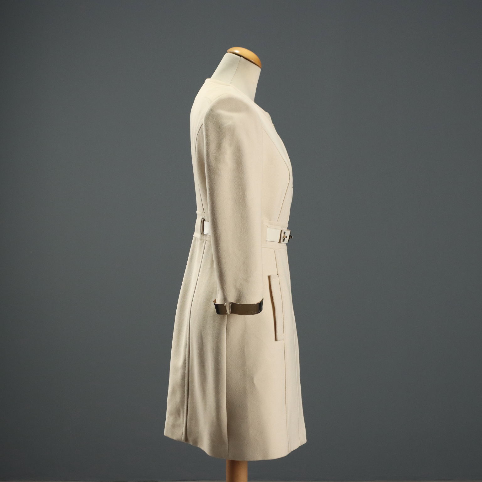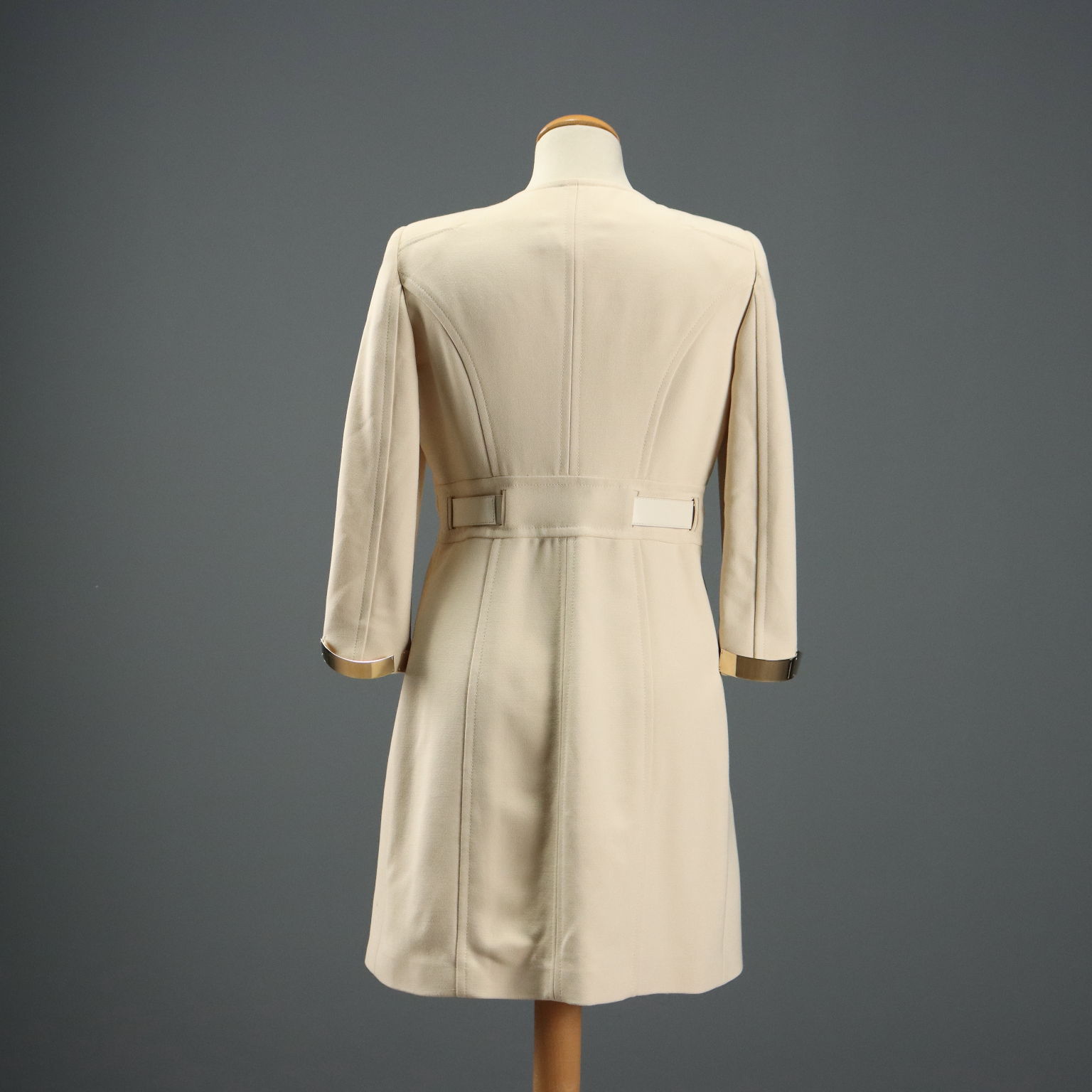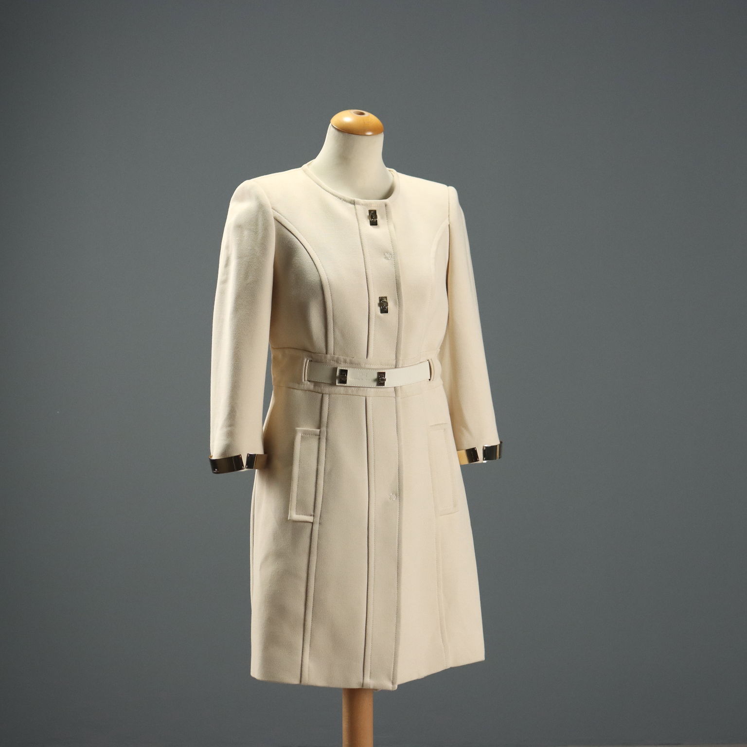 Elegante cappotto per la mezza stagione in misto lana bianco panna. Realizzato con scollo tondo e abbottonatura monopetto, con bottoni automatici a scomparsa e ganci logati. Cintura in vita e polsini con originale dettaglio in metallo dorato. Larghezza spalle: 37 cm. Lunghezza manica: 47 cm. Lunghezza. 85 cm. Girovita: 78 cm.
