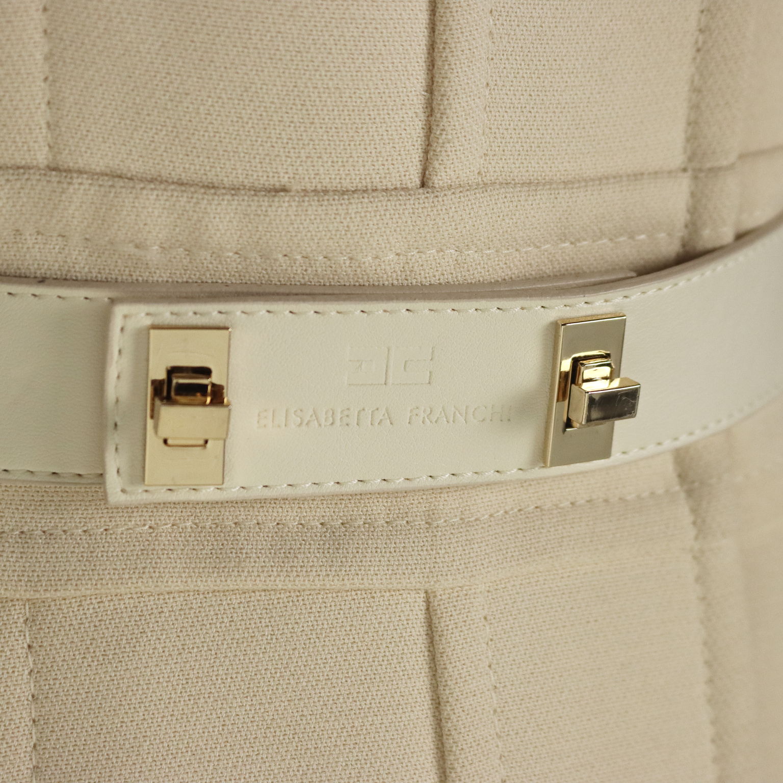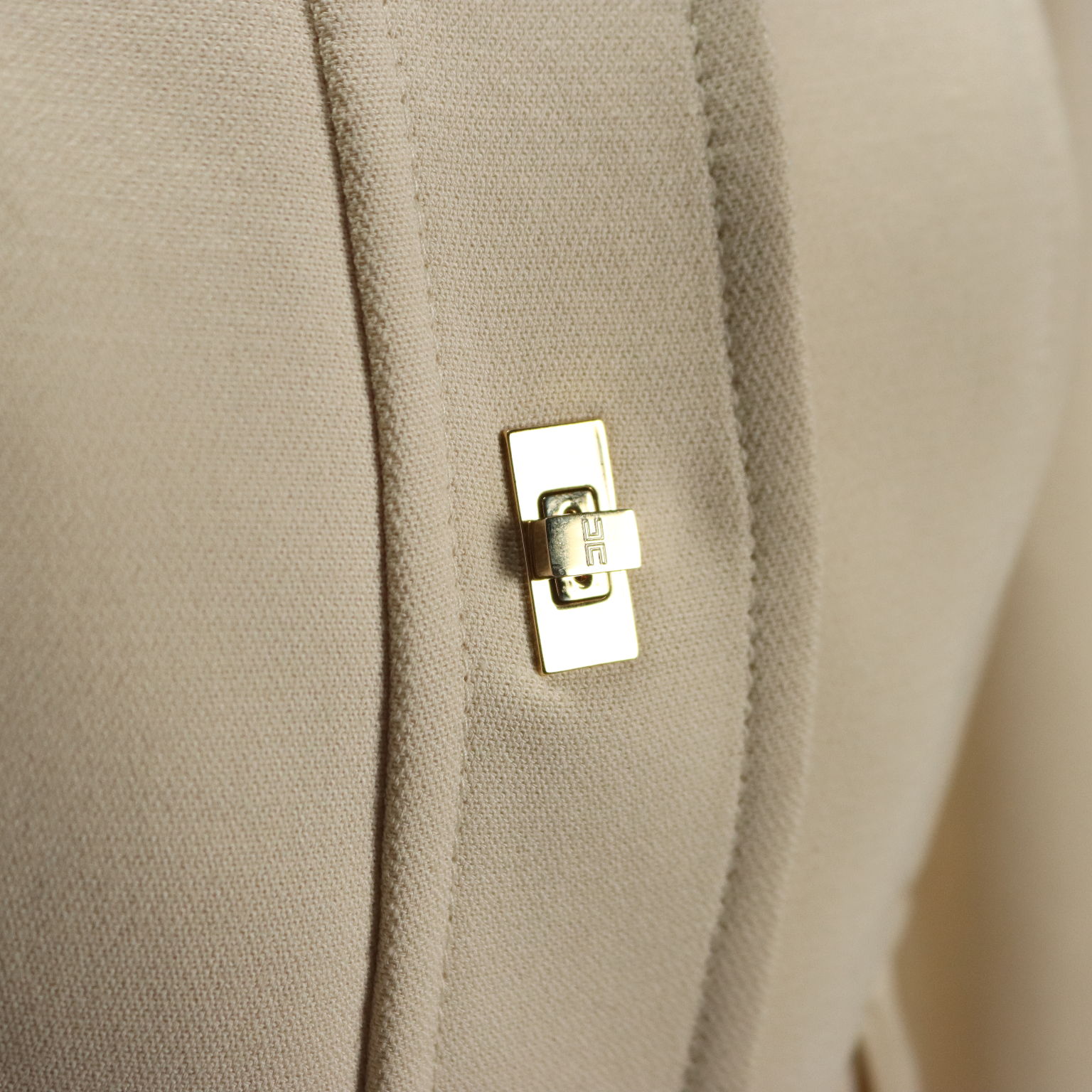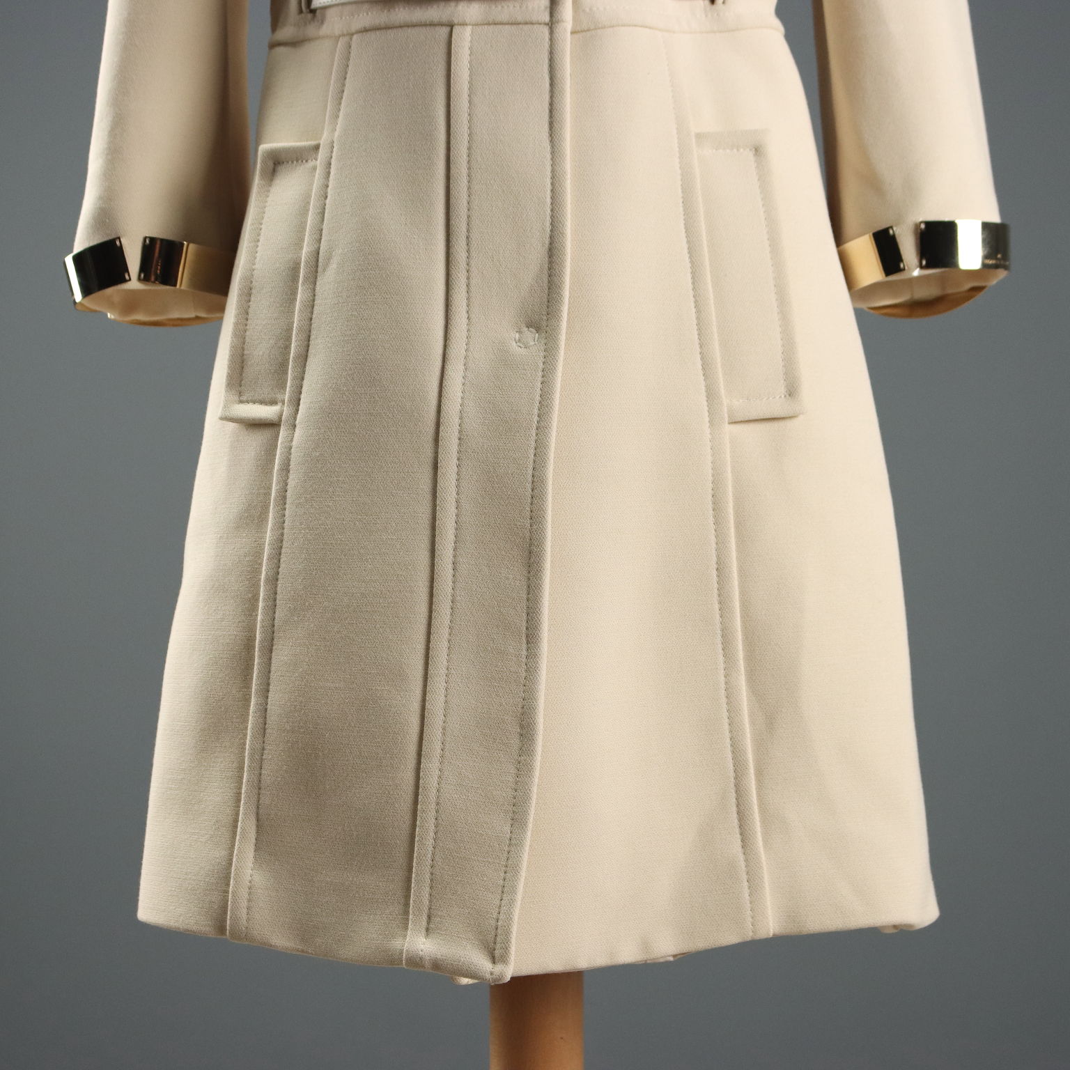 Elegante cappotto per la mezza stagione in misto lana bianco panna. Realizzato con scollo tondo e abbottonatura monopetto, con bottoni automatici a scomparsa e ganci logati. Cintura in vita e polsini con originale dettaglio in metallo dorato. Larghezza spalle: 37 cm. Lunghezza manica: 47 cm. Lunghezza. 85 cm. Girovita: 78 cm.