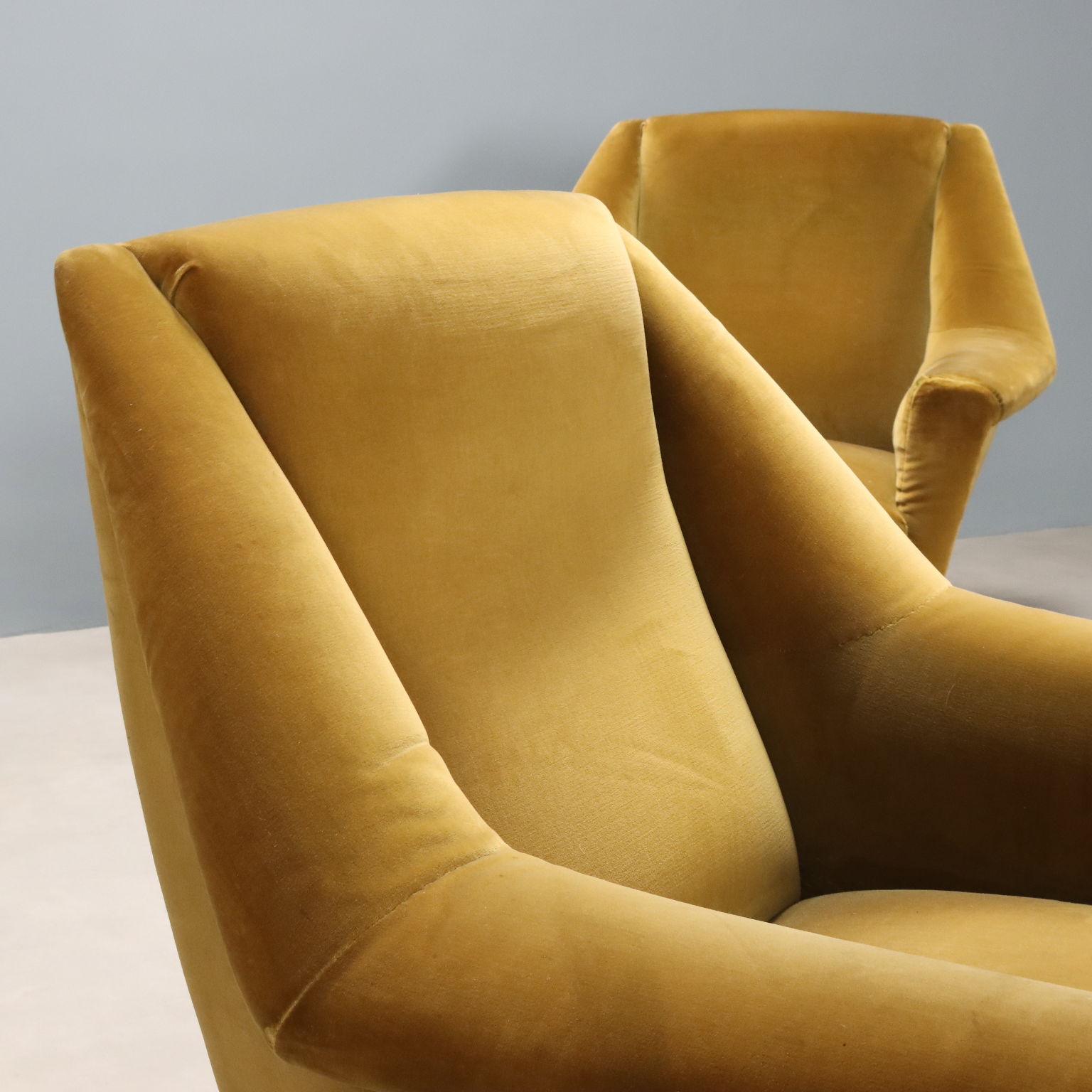 Coppia di poltrone vintage di manifattura italiana con imbottitura in espanso e rivestimento in velluto originale del periodo nei toni del verde bottiglia.