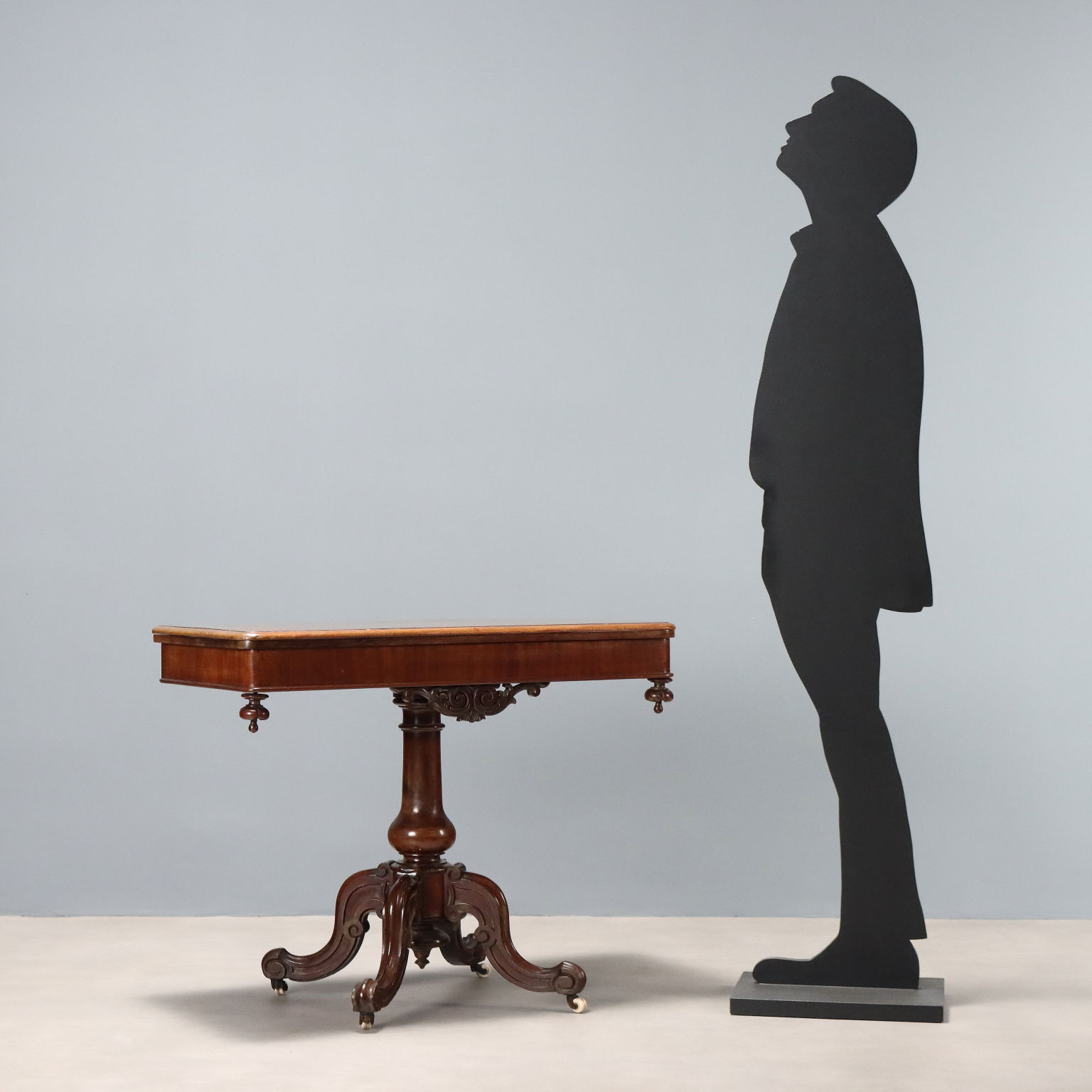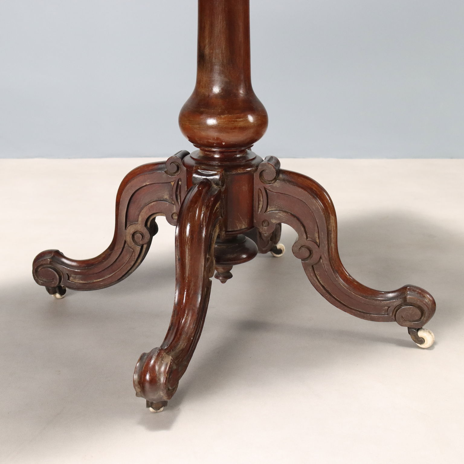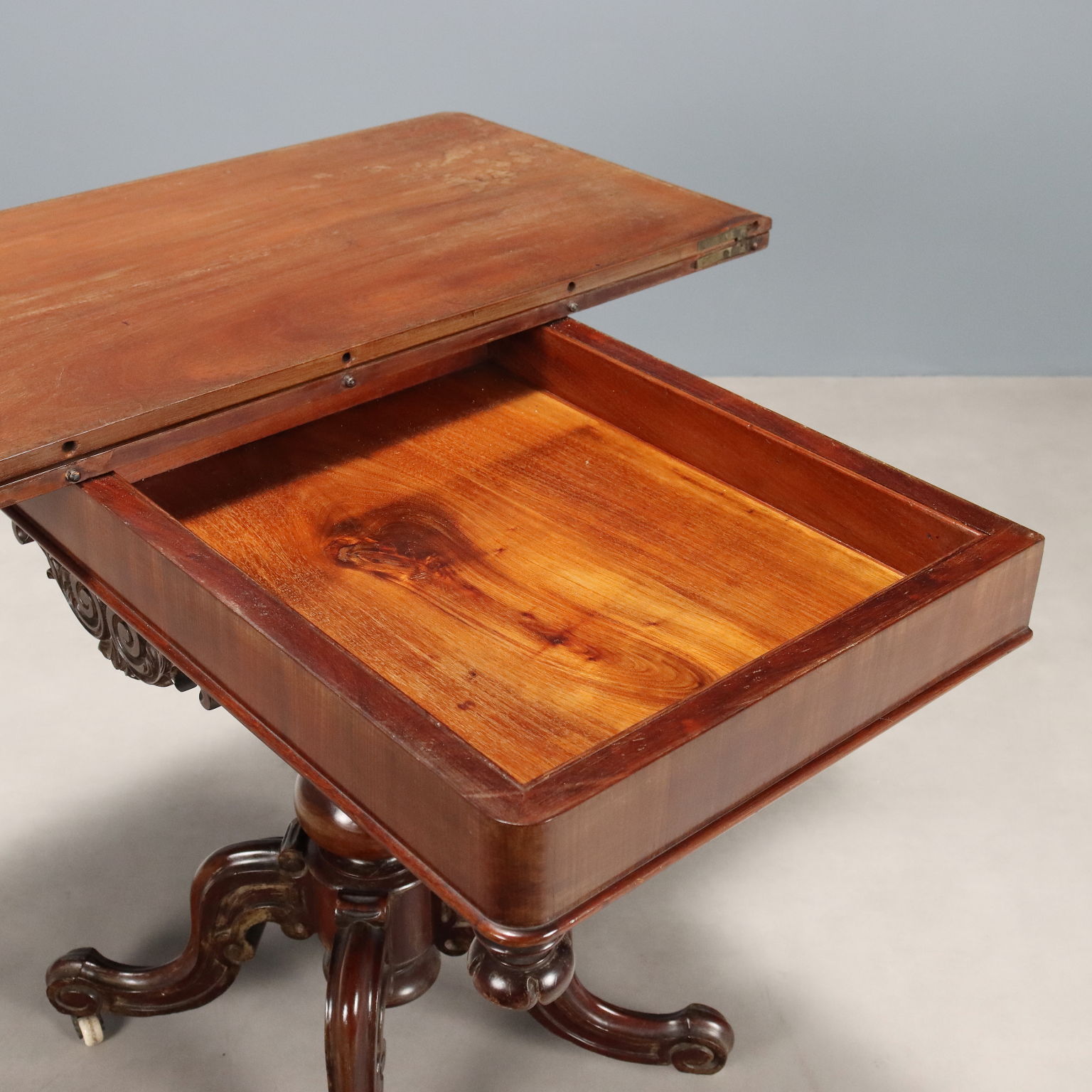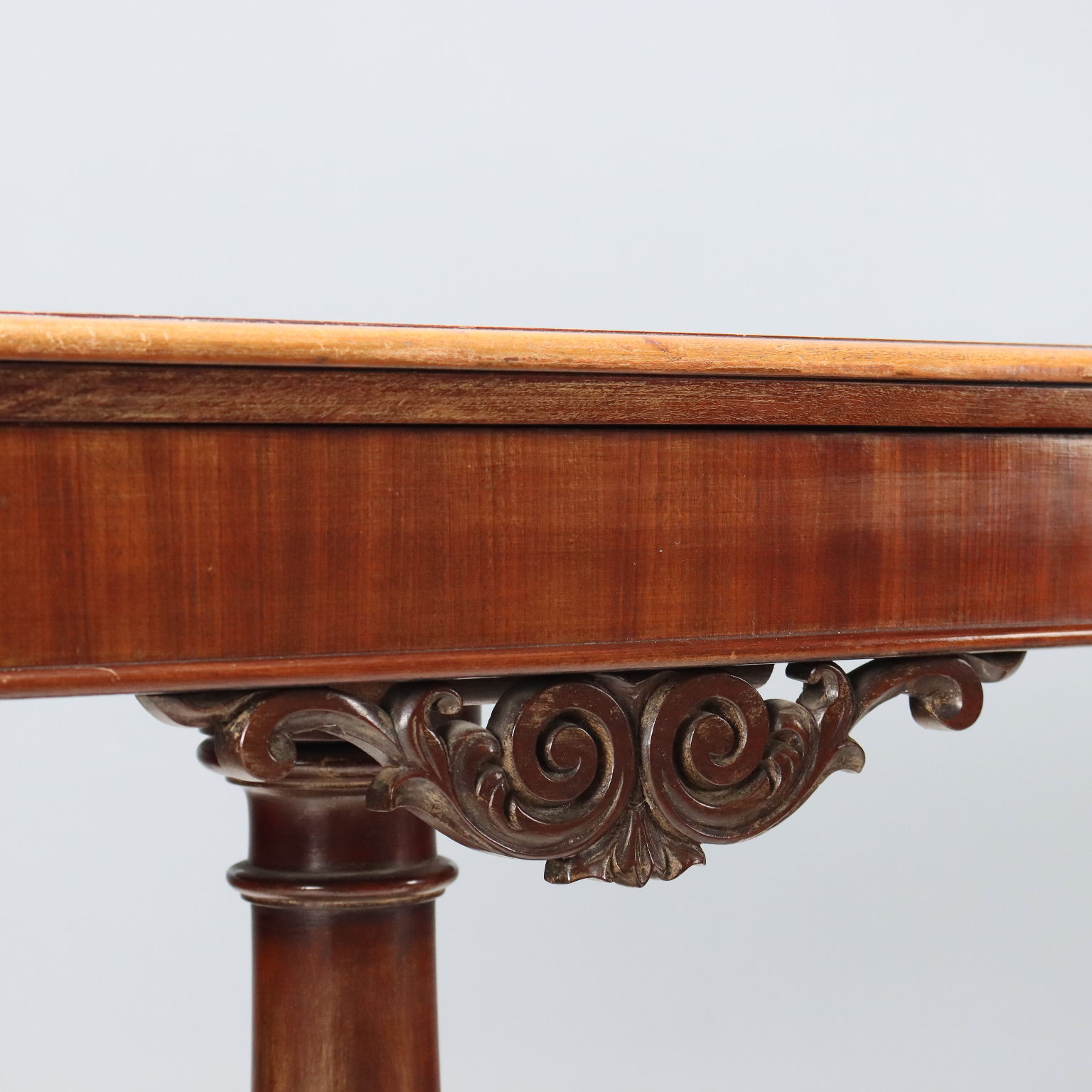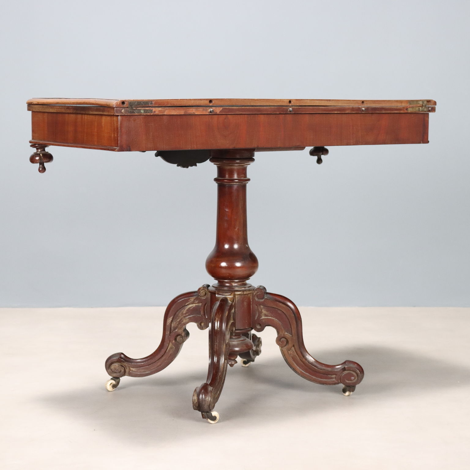 Tavolino da gioco Luigi Filippo in mogano. Piano girevole celante vano a giorno, apribile a libro, filettatura interna in essenze varie. Coppia di pennacchi e intaglio sotto piano, gamba centrale tornita poggiante su quattro piedi mossi culminanti a ricciolo e rotelle. Francia, secondo quarto XIX Secolo.
