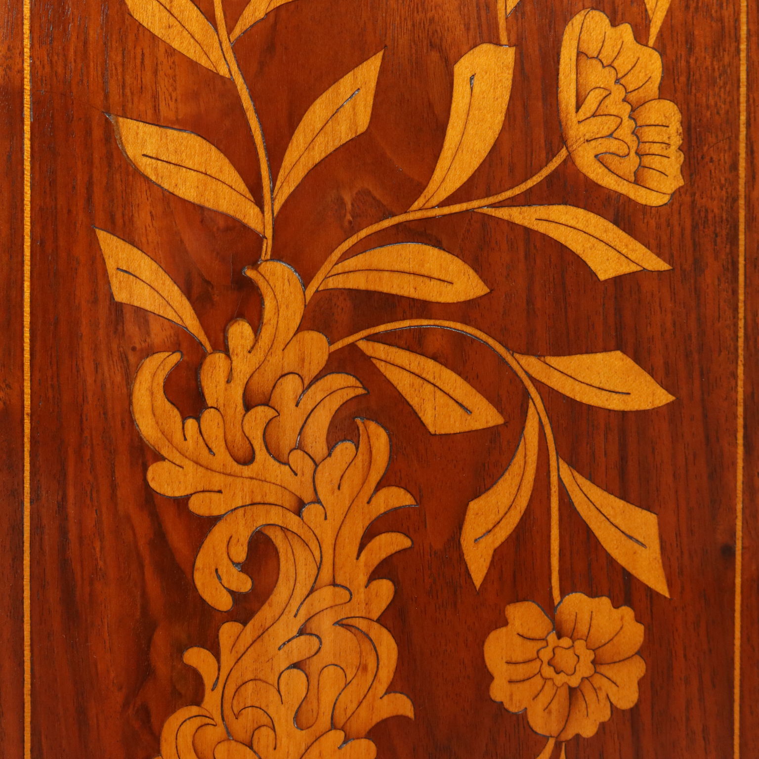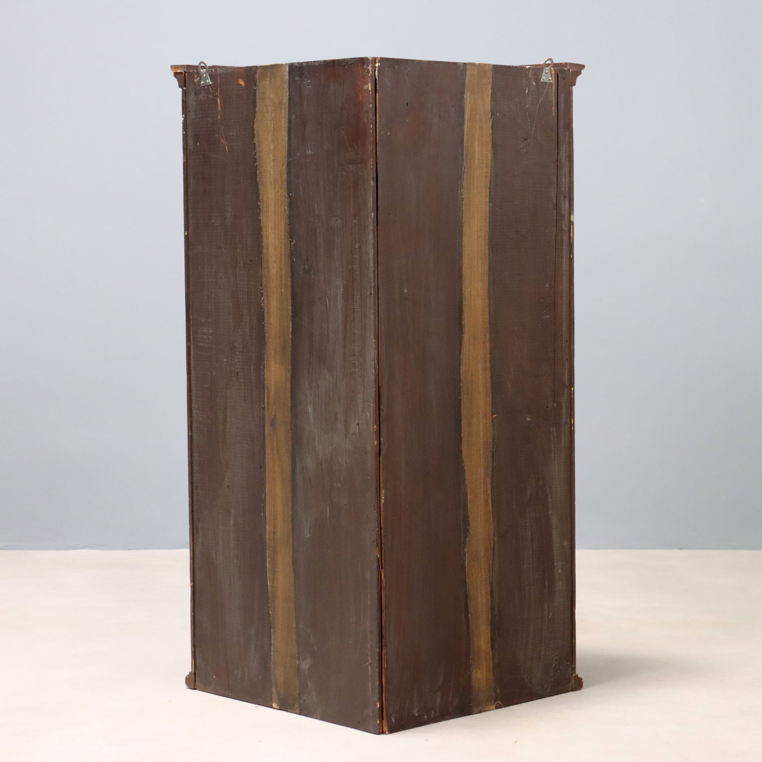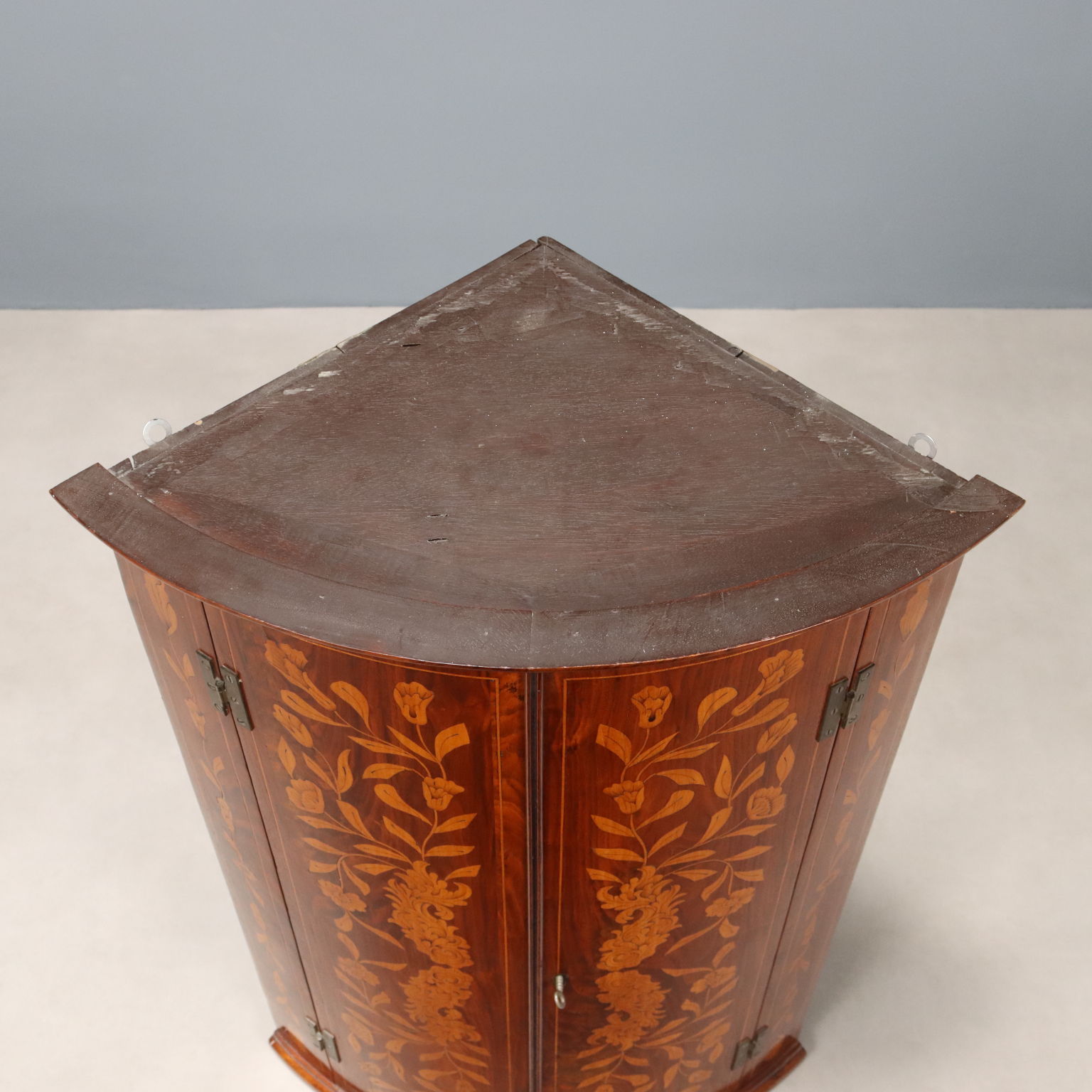 Alzata di angoliera a mezza luna Olandese in noce, da appendere a parete. Due ante, intarsi floreali e fogliacei in acero su tutta la superficie. Olanda, XIX Secolo.