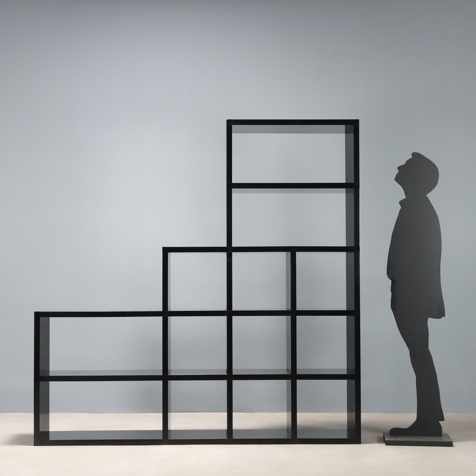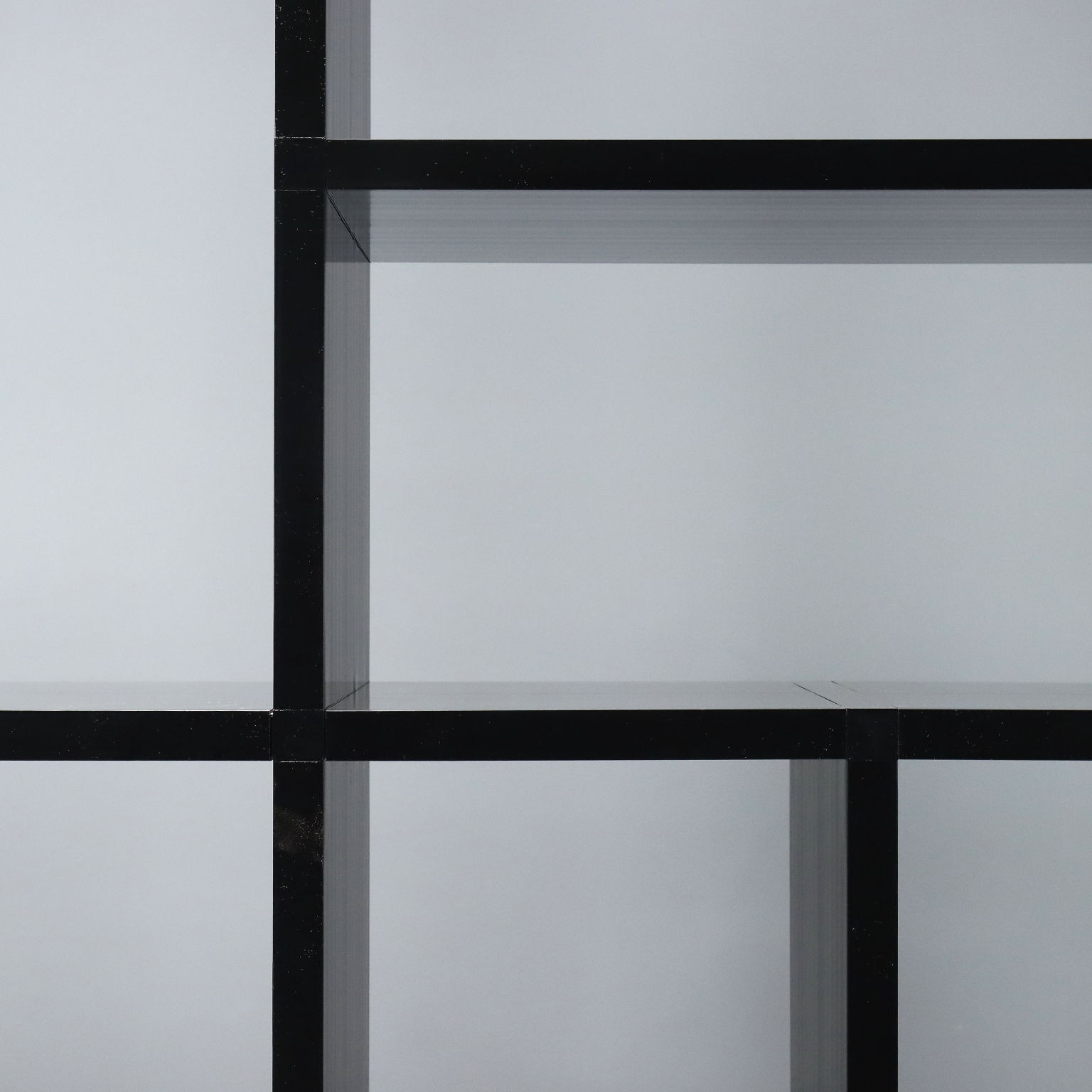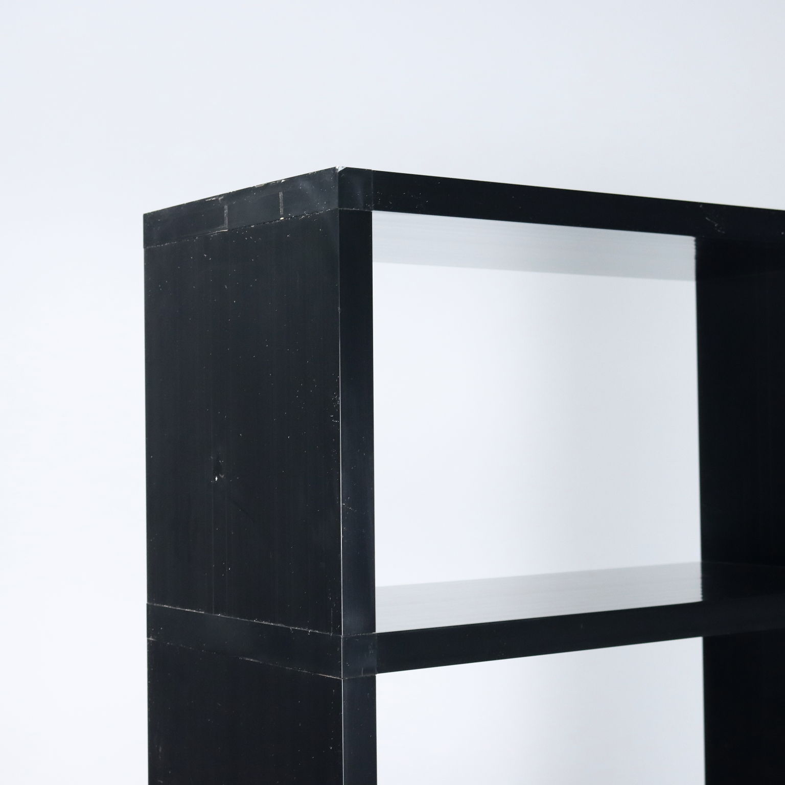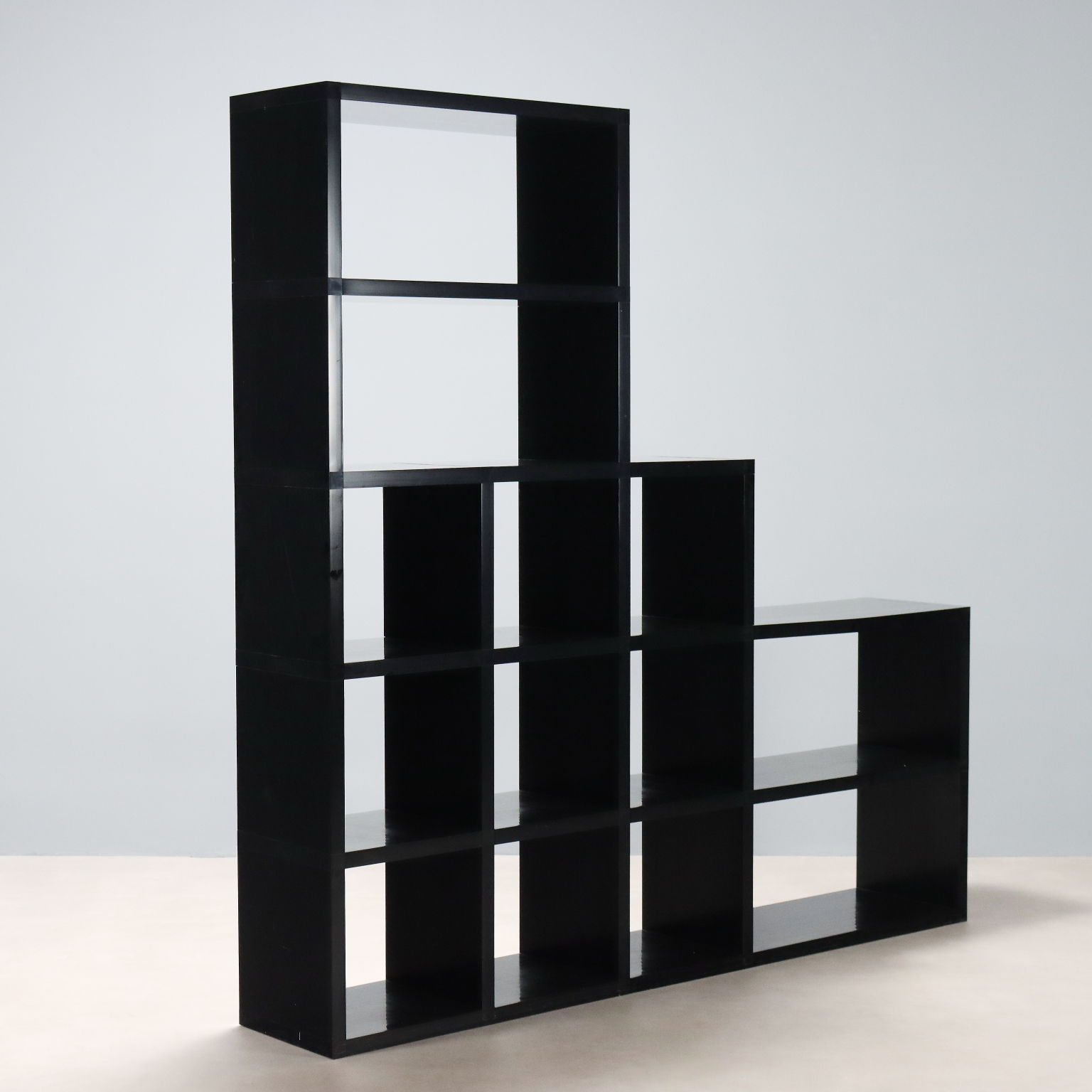 Libreria modulare in materiale plastico nero con elementi a posizione regolabile.