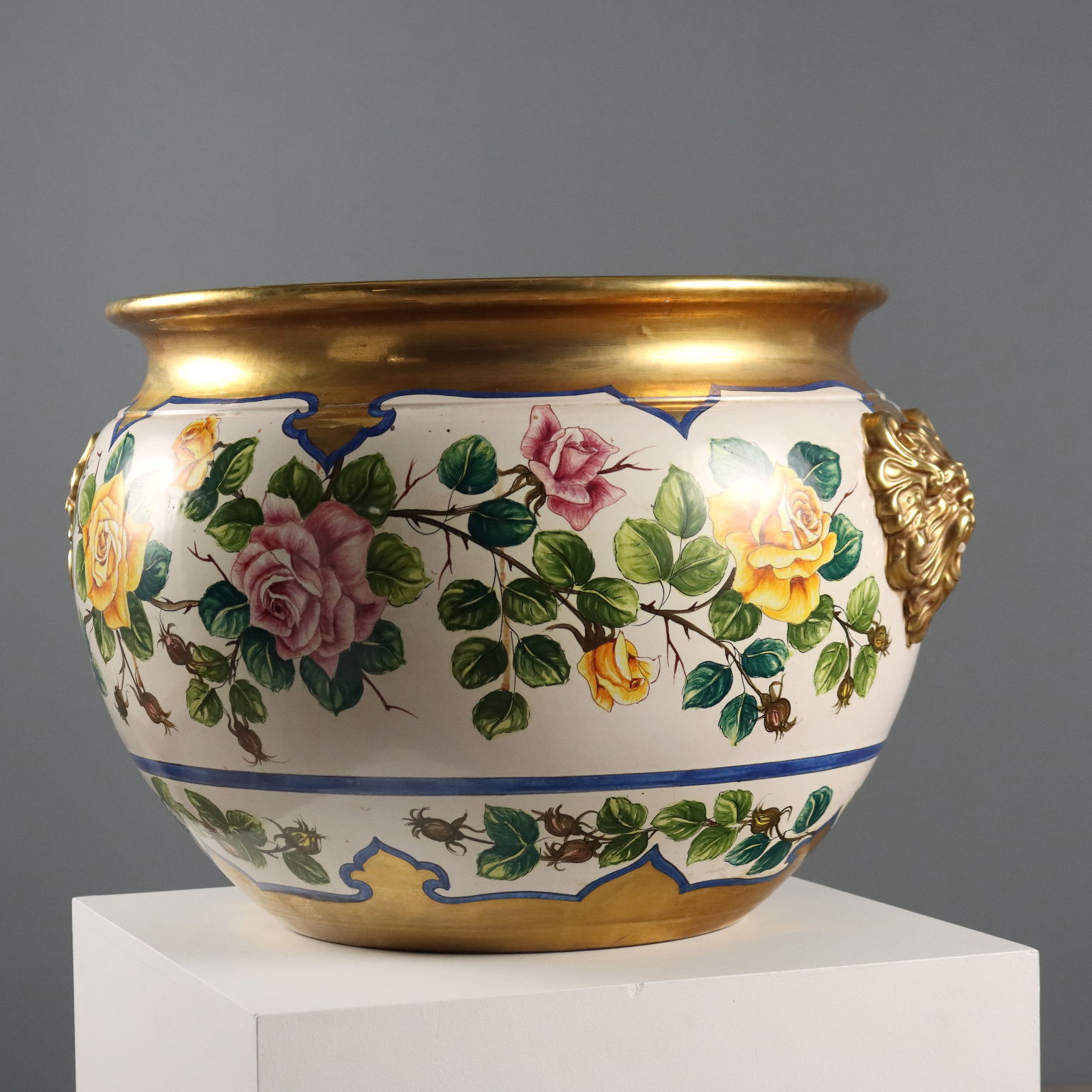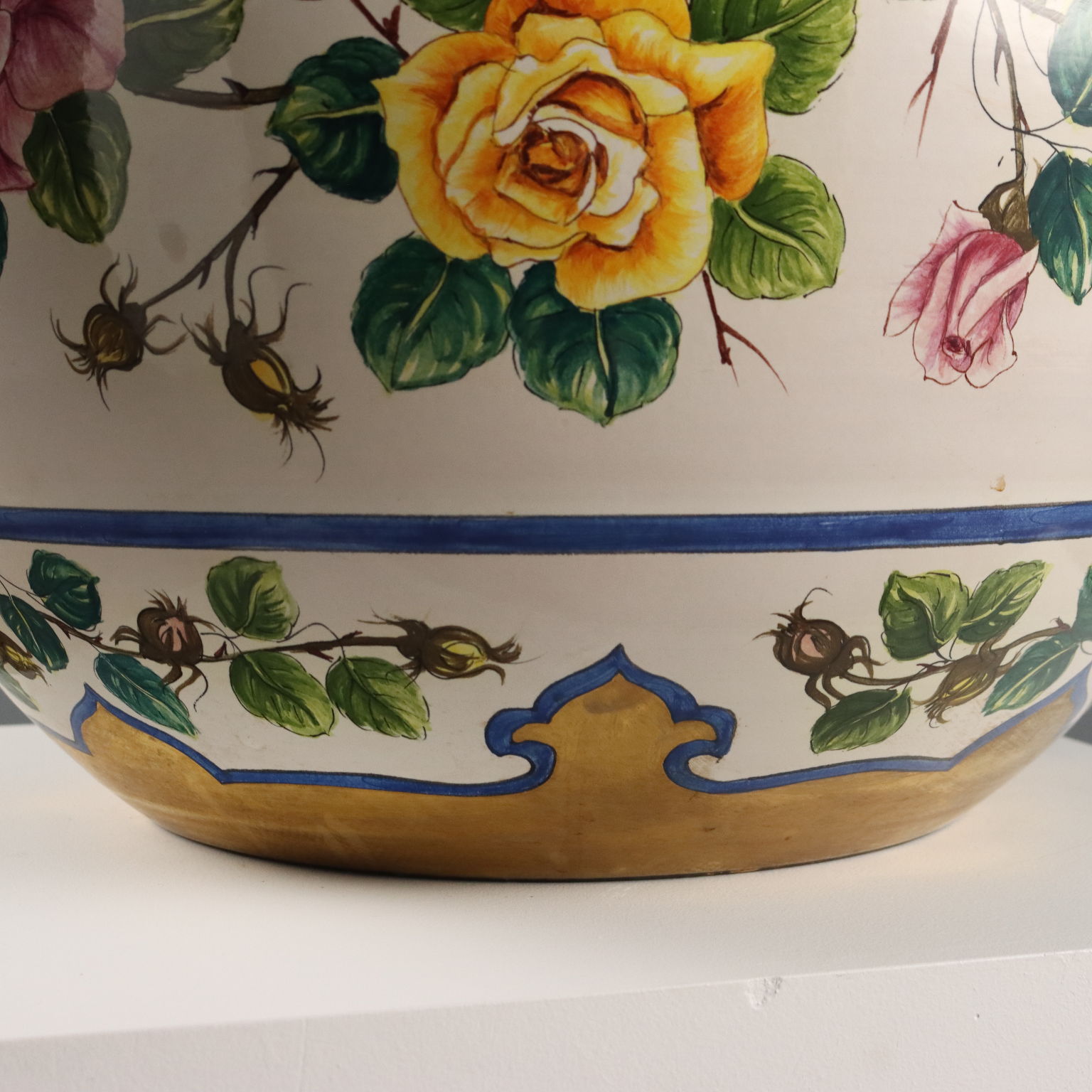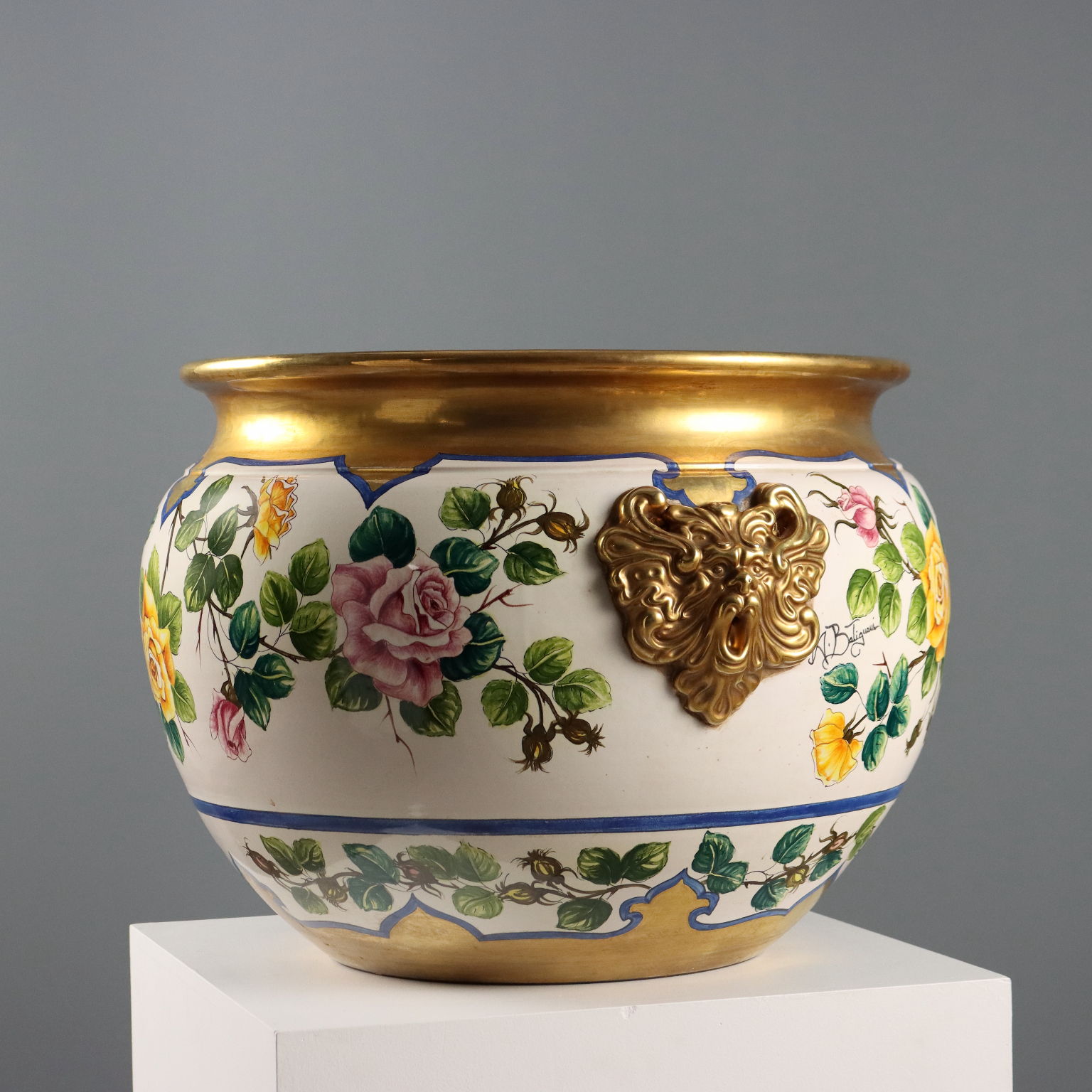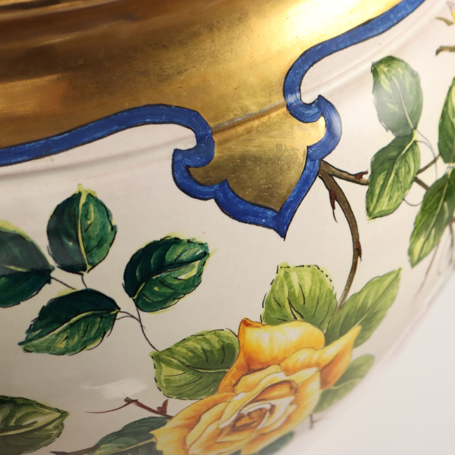 Cache pot in ceramica con decoro policromo raffigurante tralci di rose. Grottesche a rilievo in oro zecchino. Numero di serie limitata 2/100, etichetta e marchio della manifattura sotto la base.