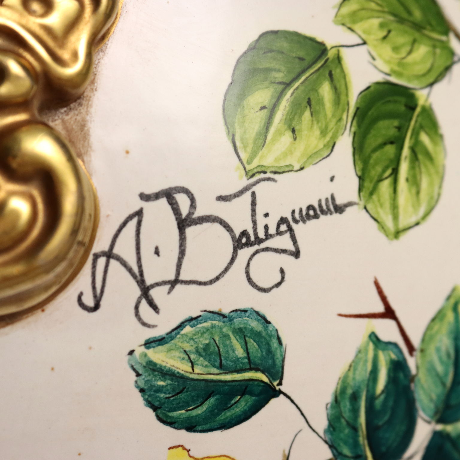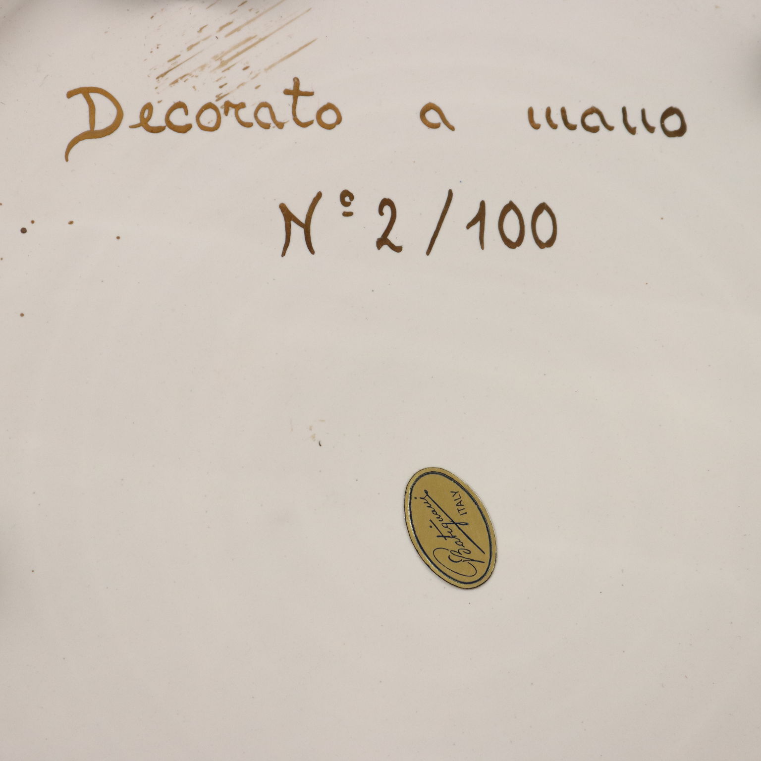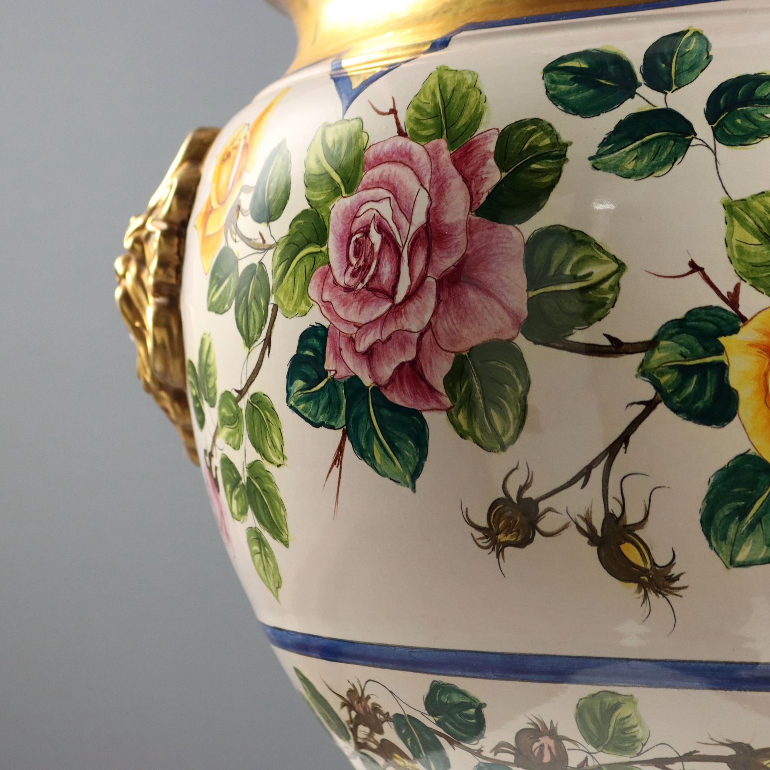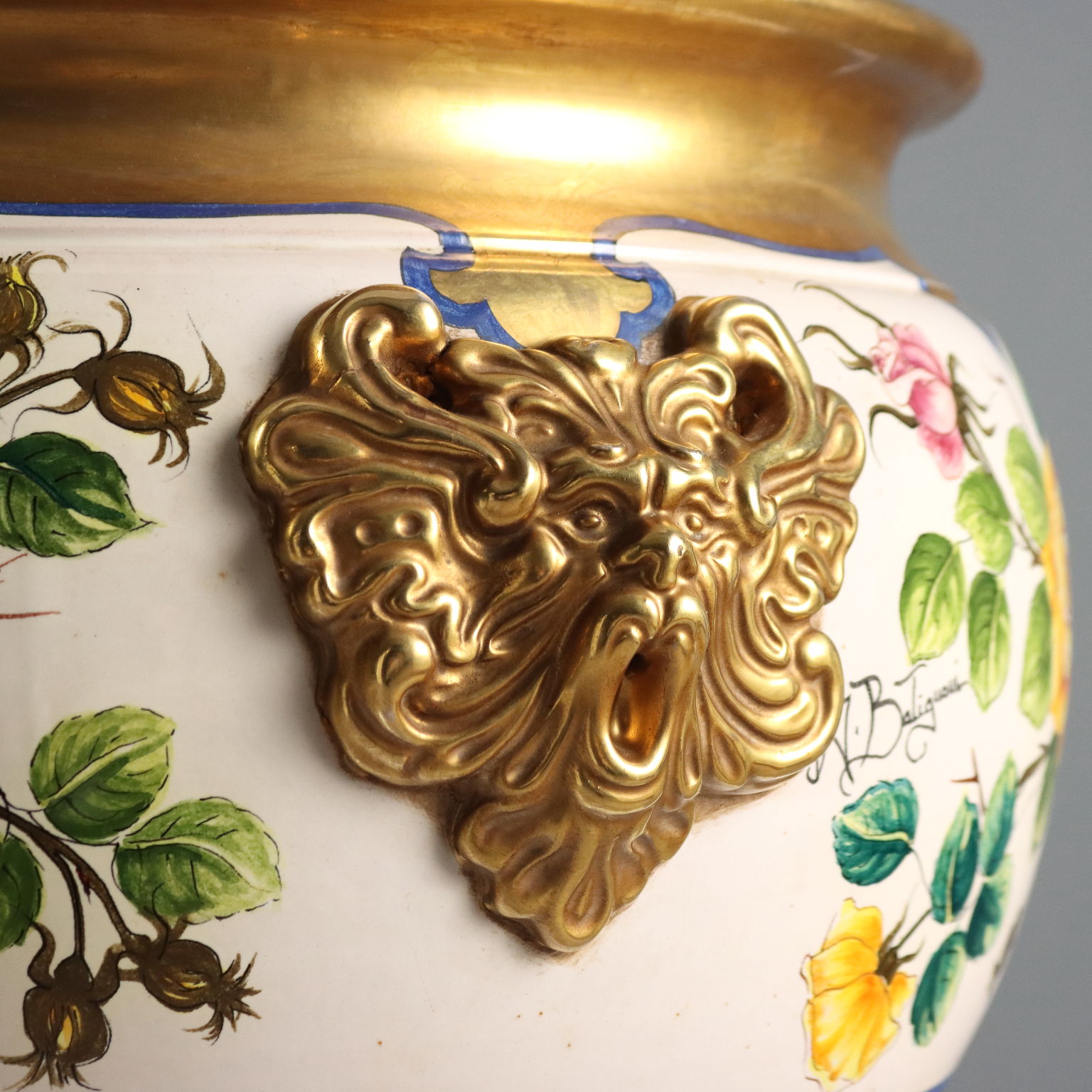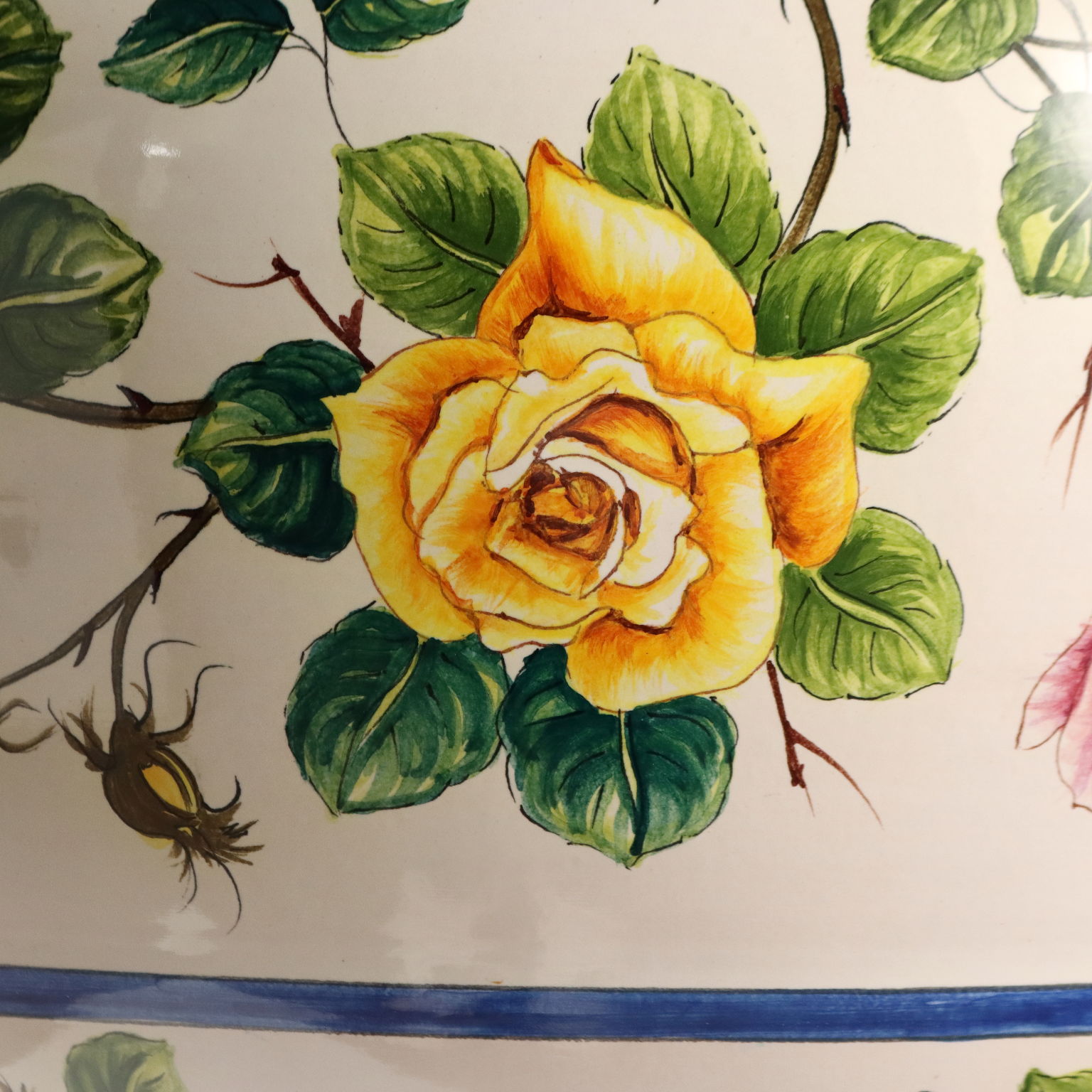 Cache pot in ceramica con decoro policromo raffigurante tralci di rose. Grottesche a rilievo in oro zecchino. Numero di serie limitata 2/100, etichetta e marchio della manifattura sotto la base.