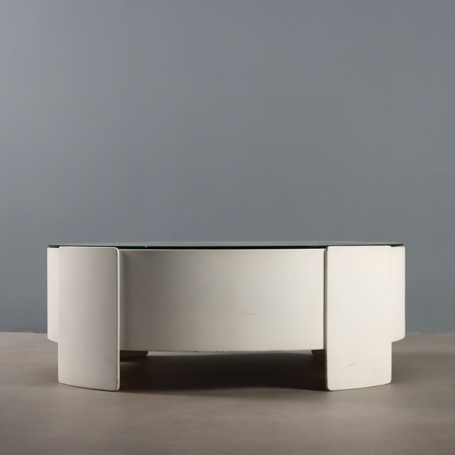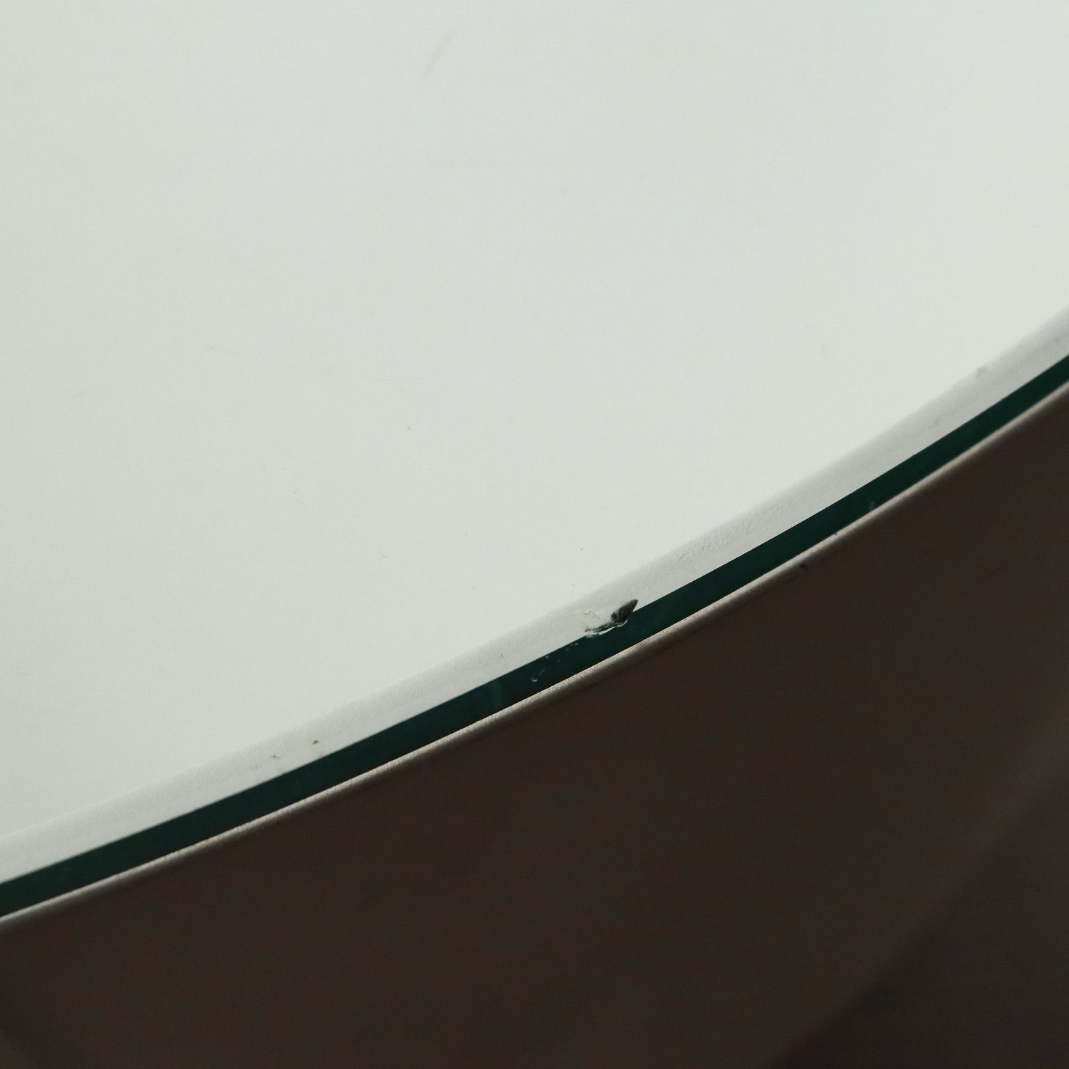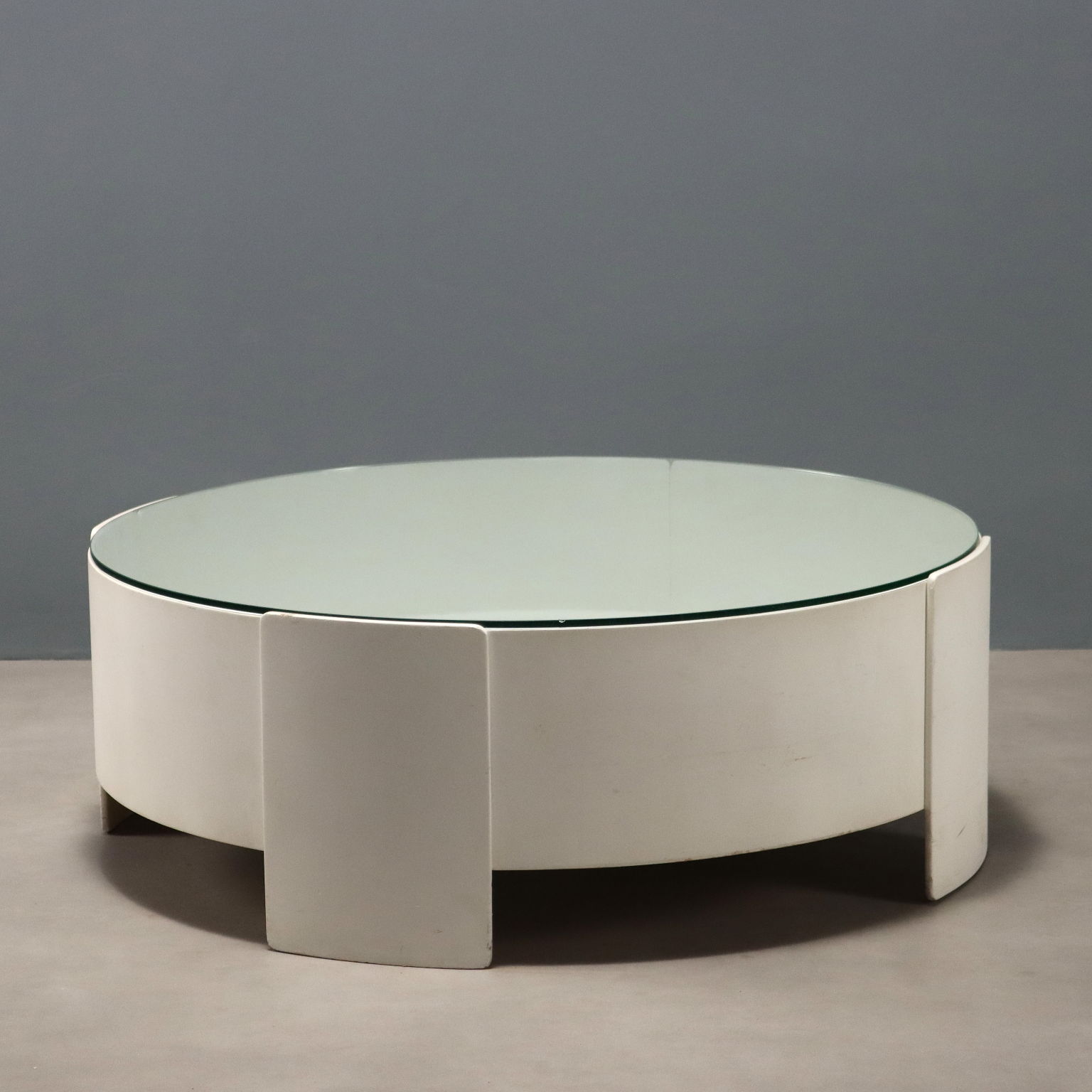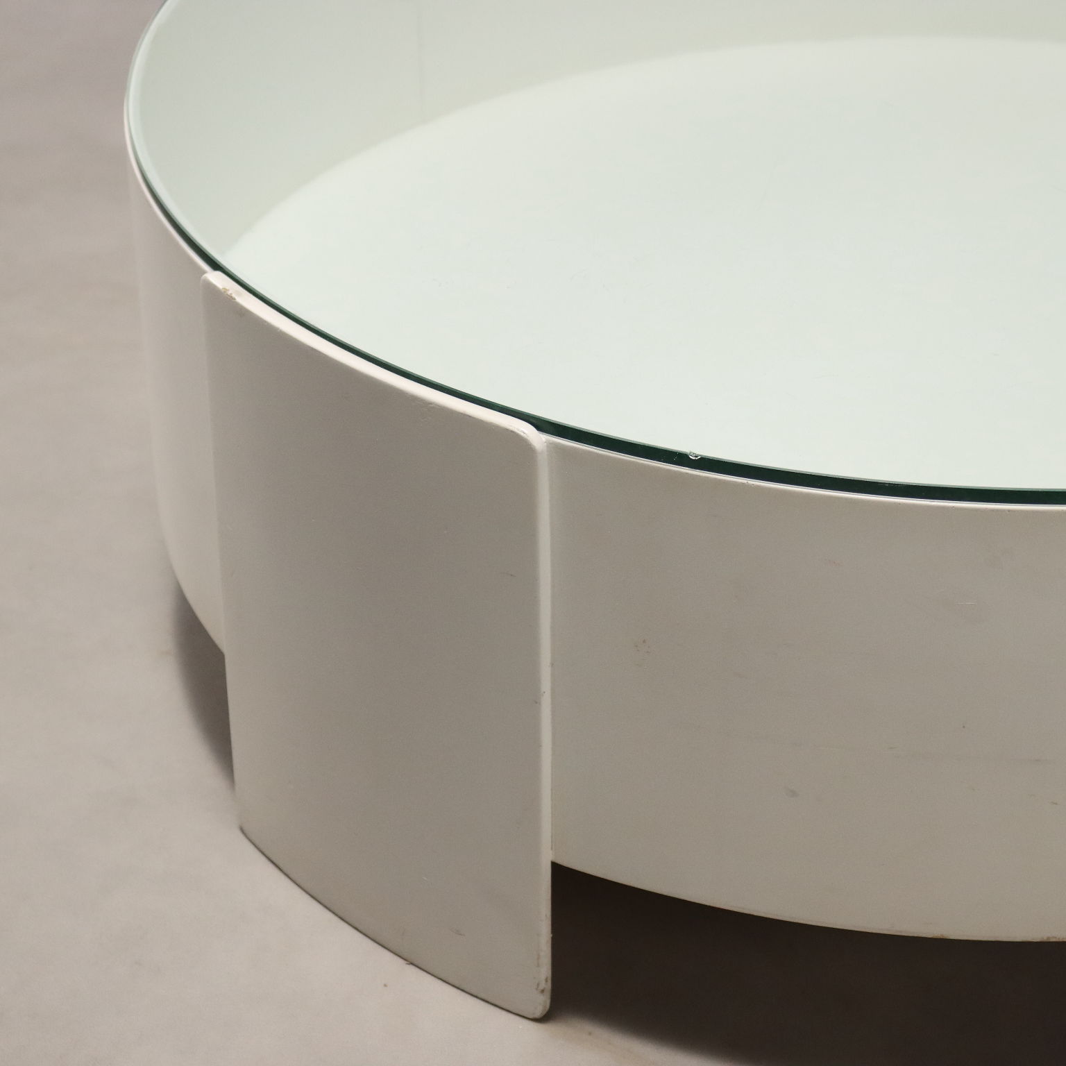 Tavolino da centro vintage con struttura in legno laccato bianco, piano tondo in vetro. In buone condizioni generali, presenta una piccola sbeccatura sul piano.