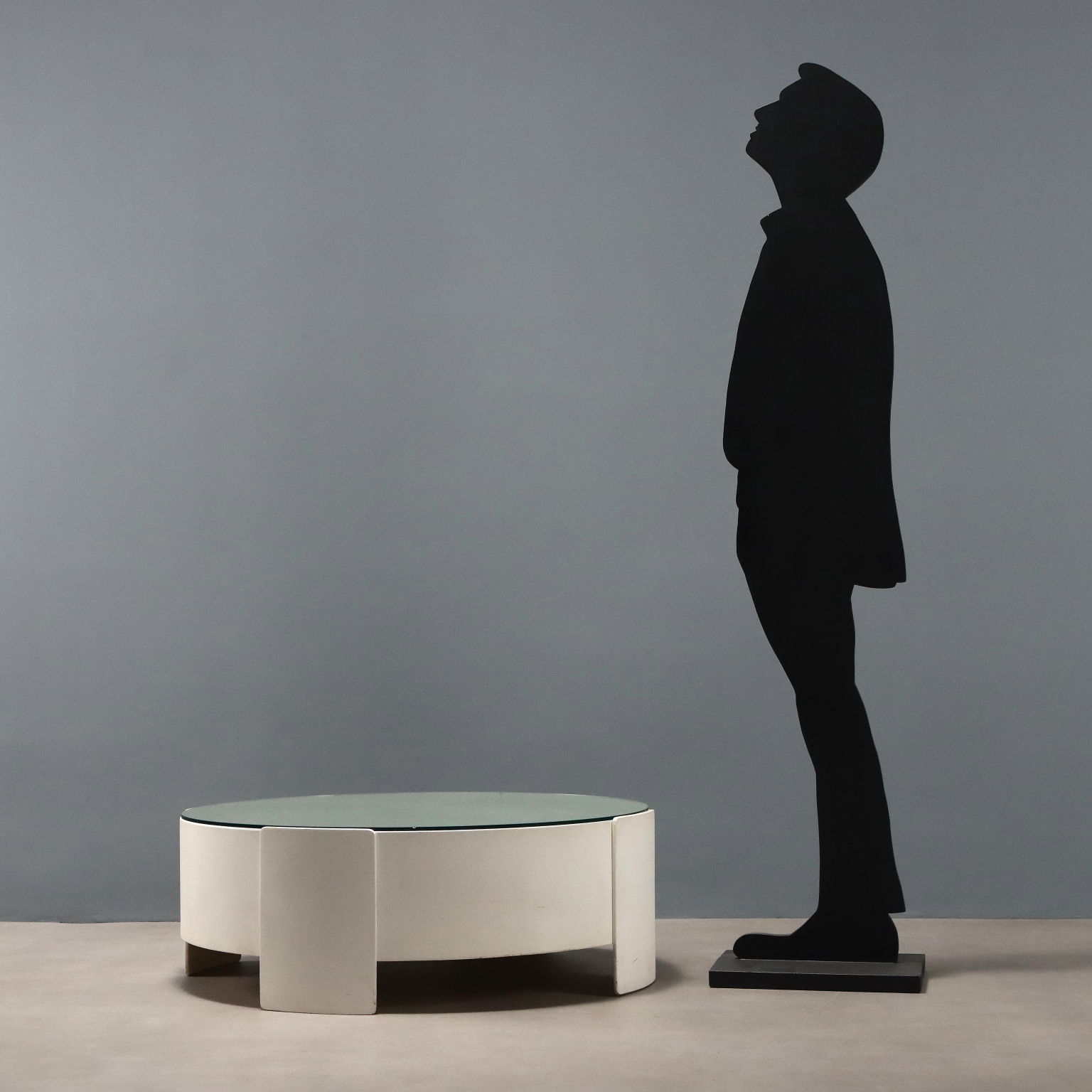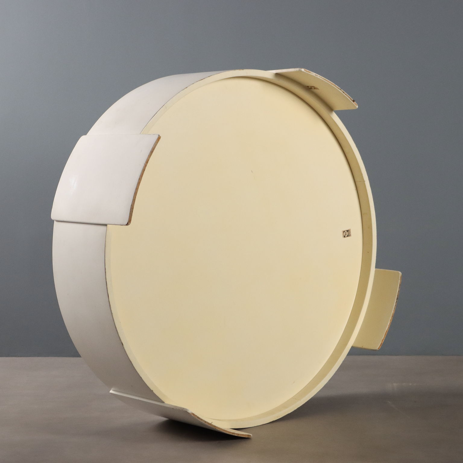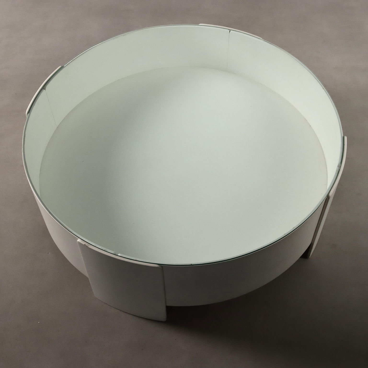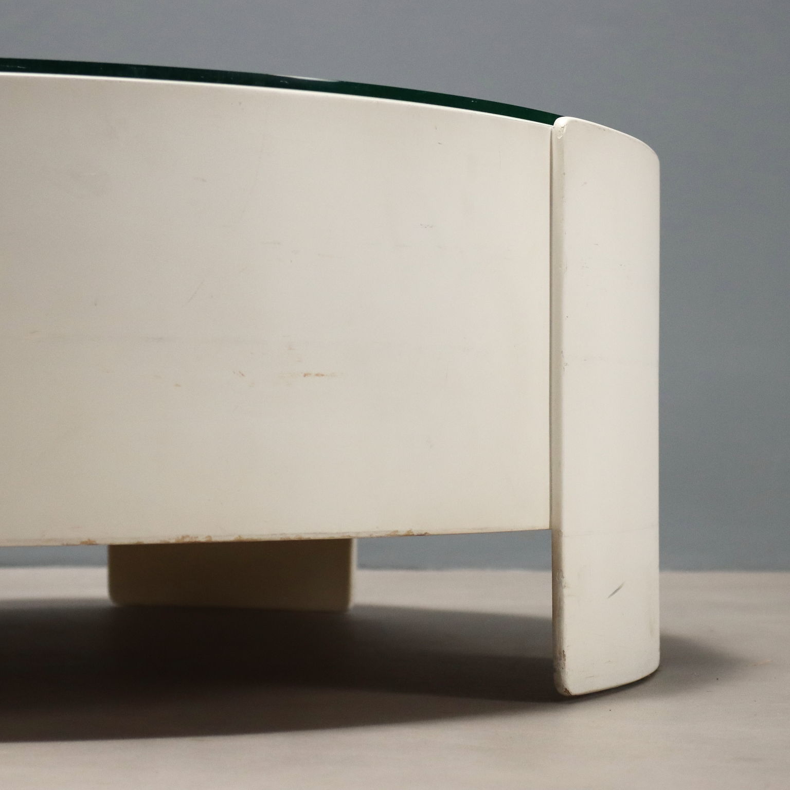 Tavolino da centro vintage con struttura in legno laccato bianco, piano tondo in vetro. In buone condizioni generali, presenta una piccola sbeccatura sul piano.