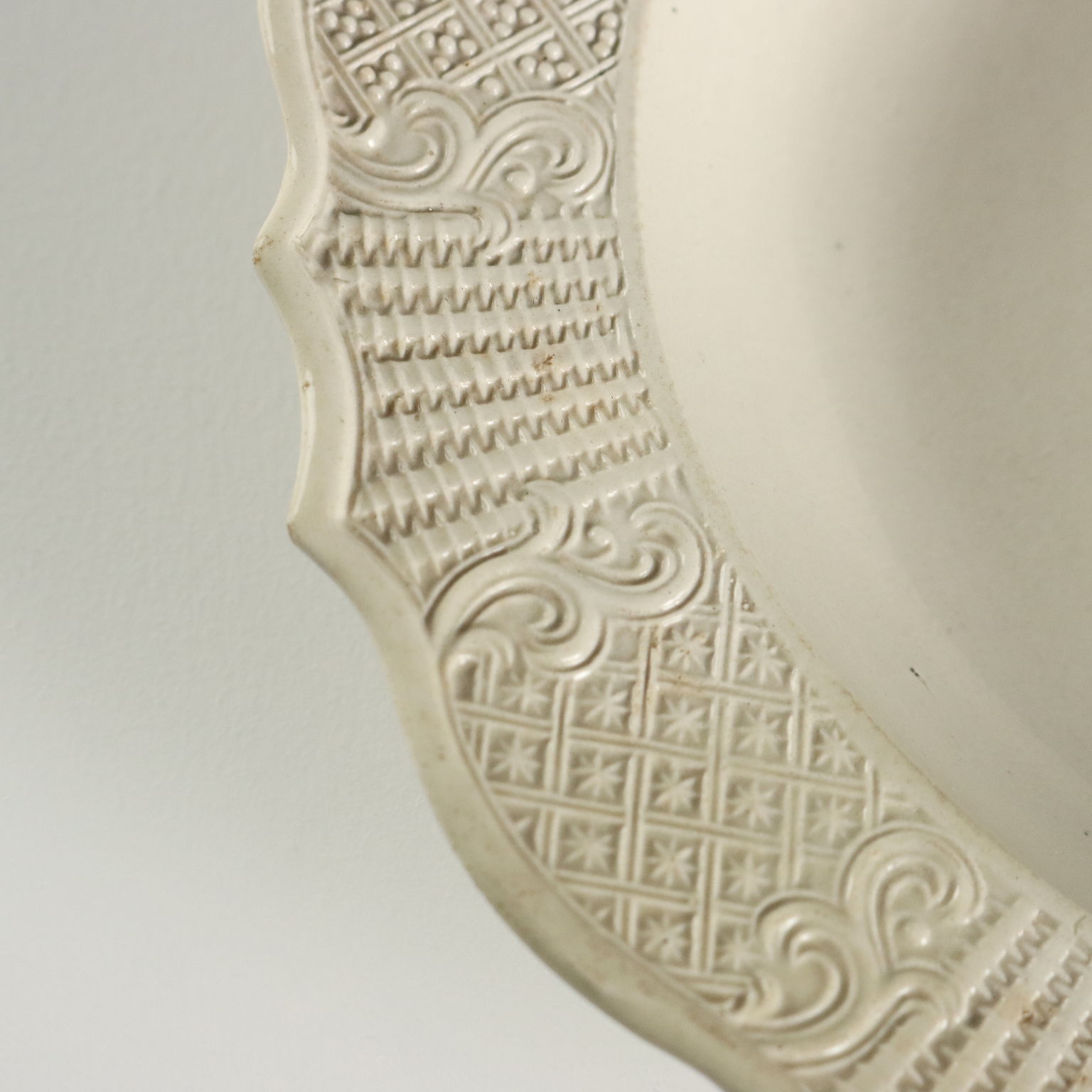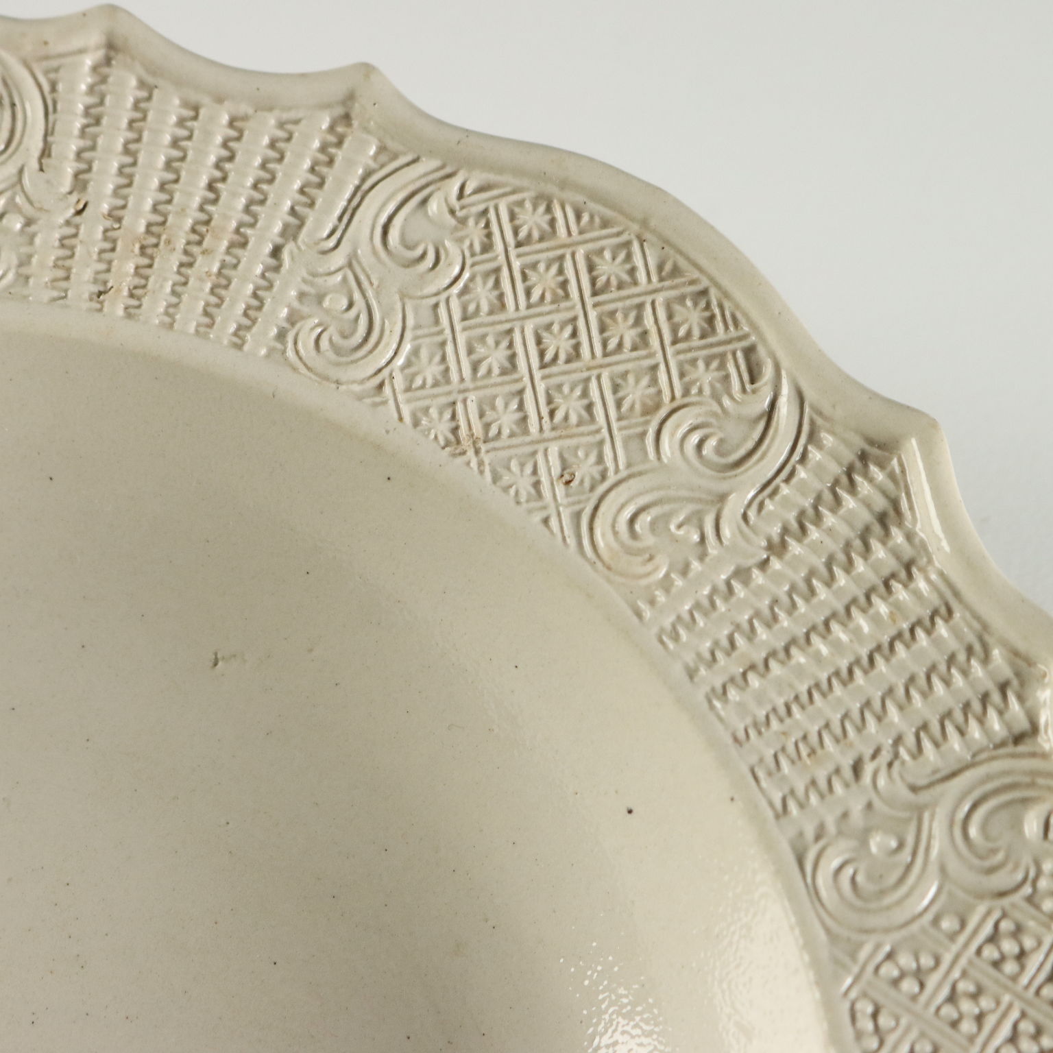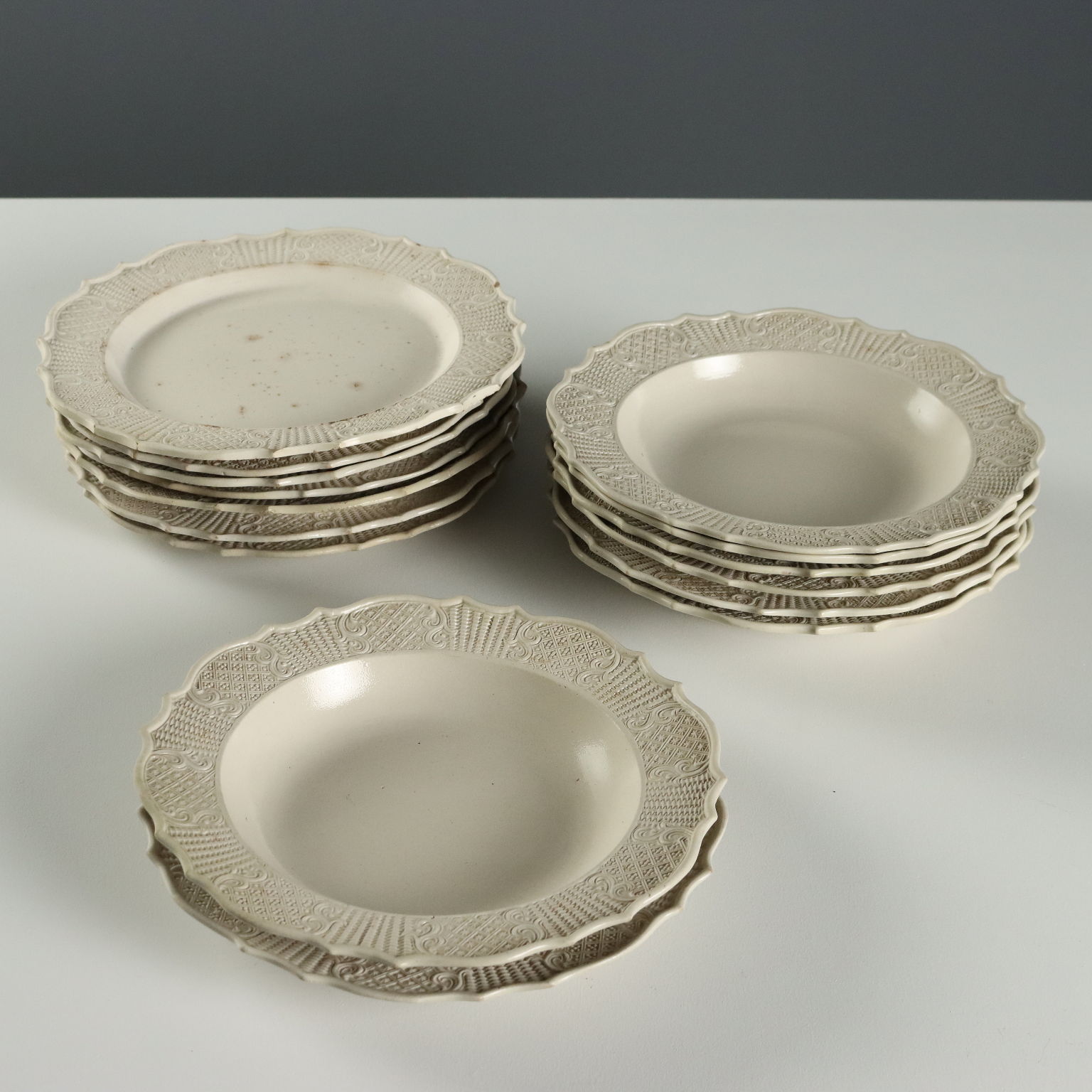 Gruppo di piatti in terraglia a forte componente vetrosa. Tesa lavorata ad incisione con motivi a canestro e racemi vegetali.