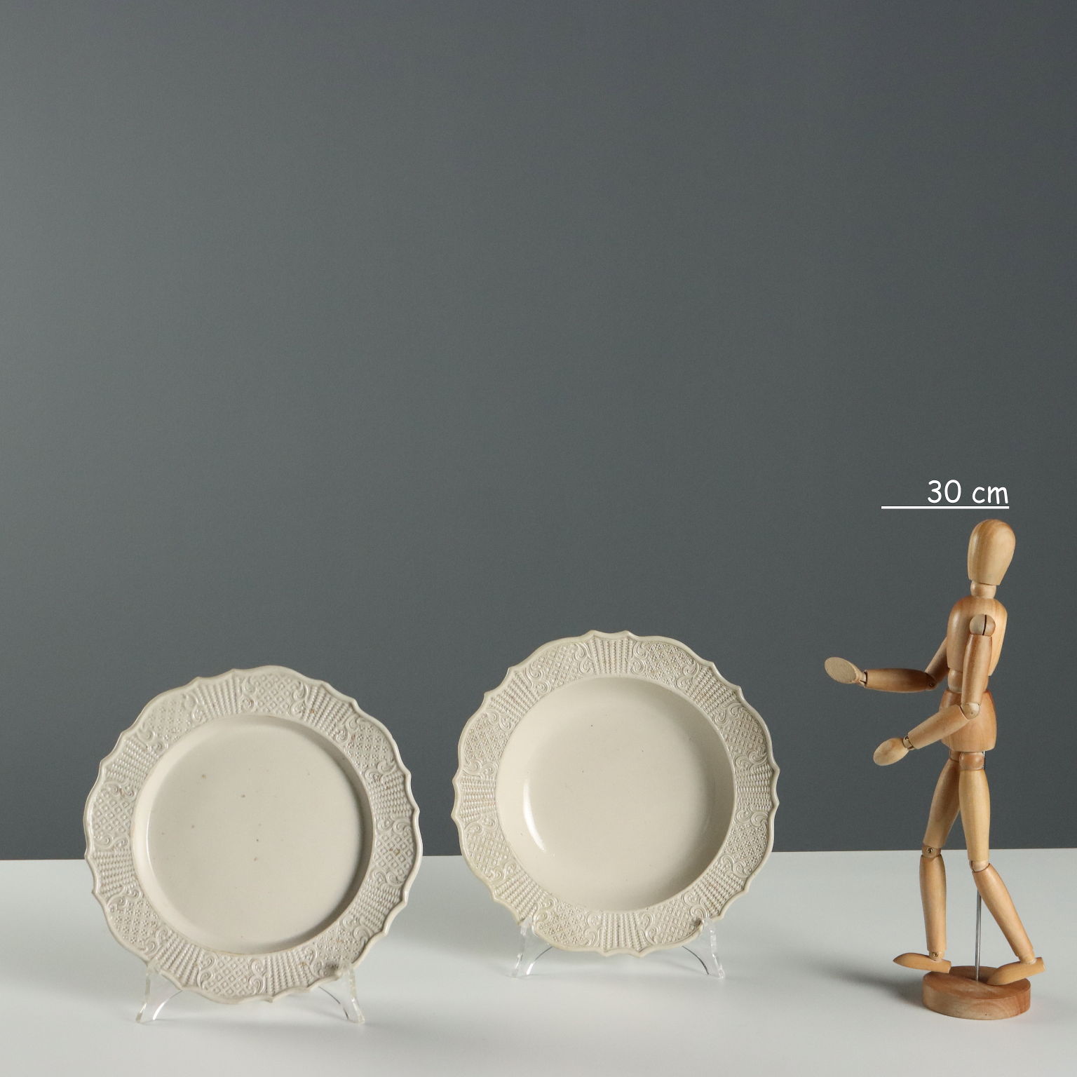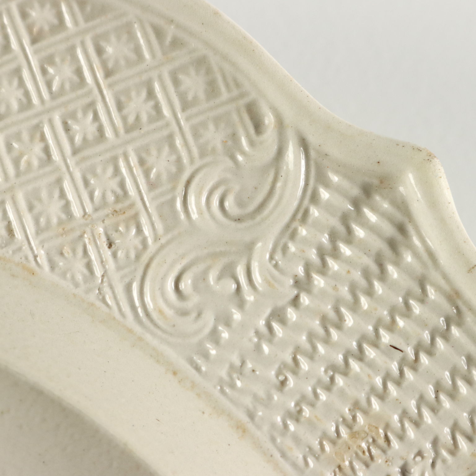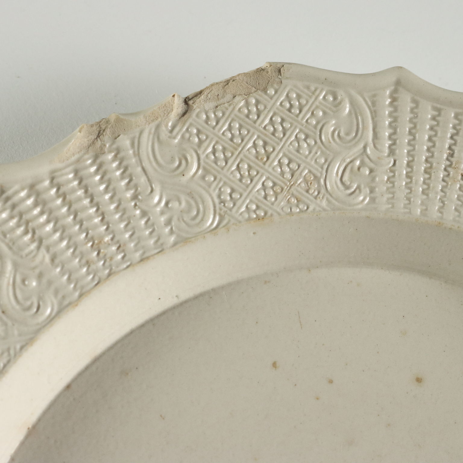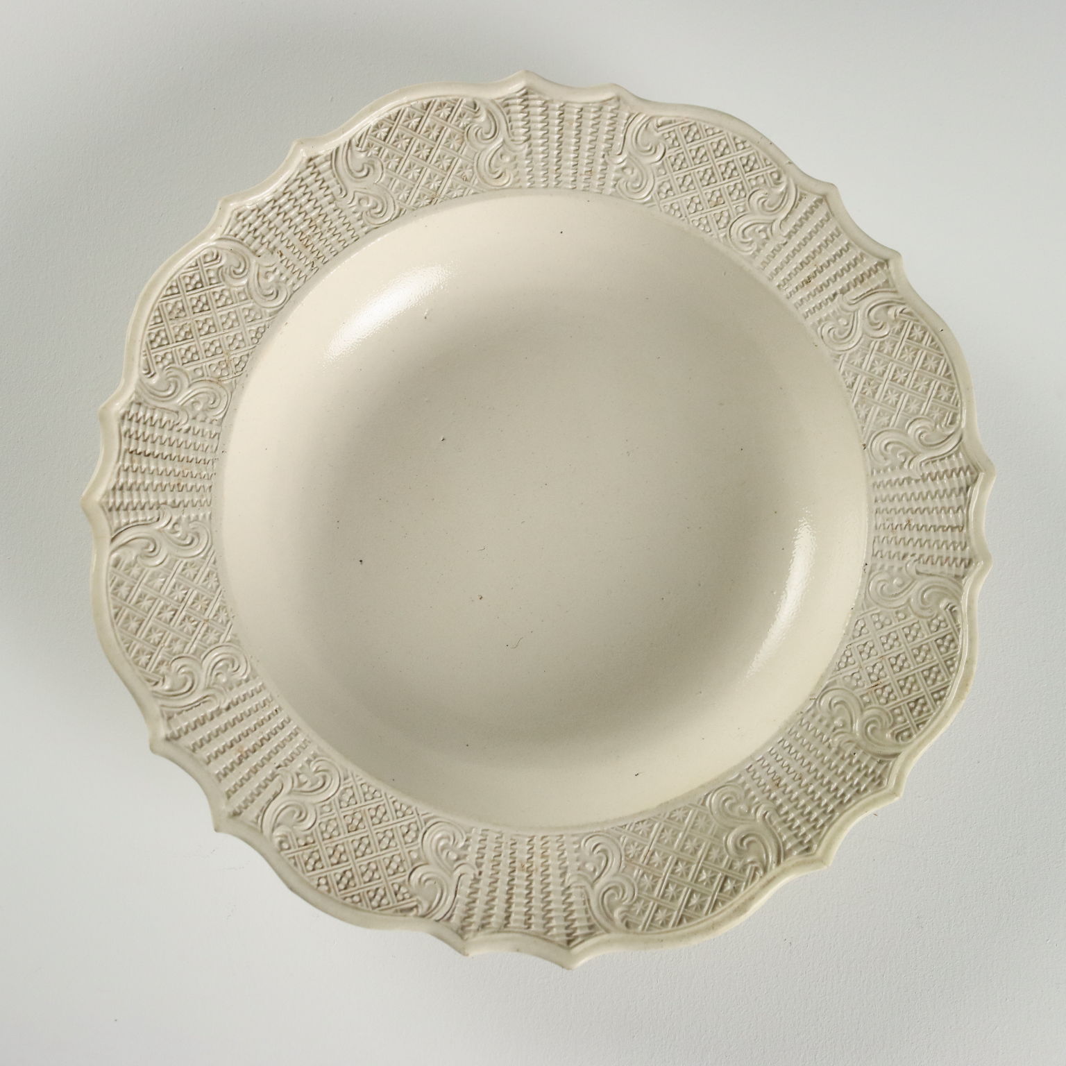 Gruppo di piatti in terraglia a forte componente vetrosa. Tesa lavorata ad incisione con motivi a canestro e racemi vegetali.