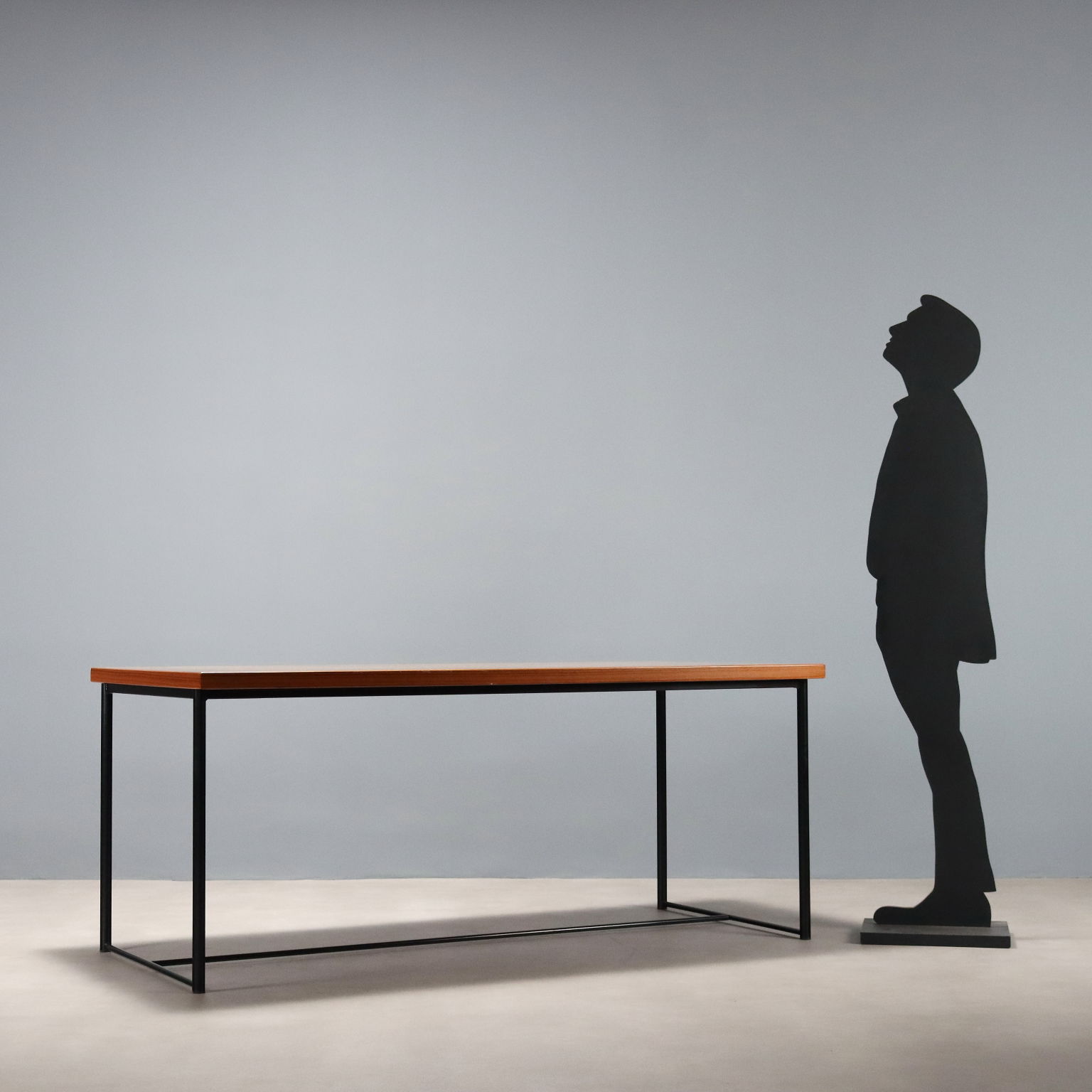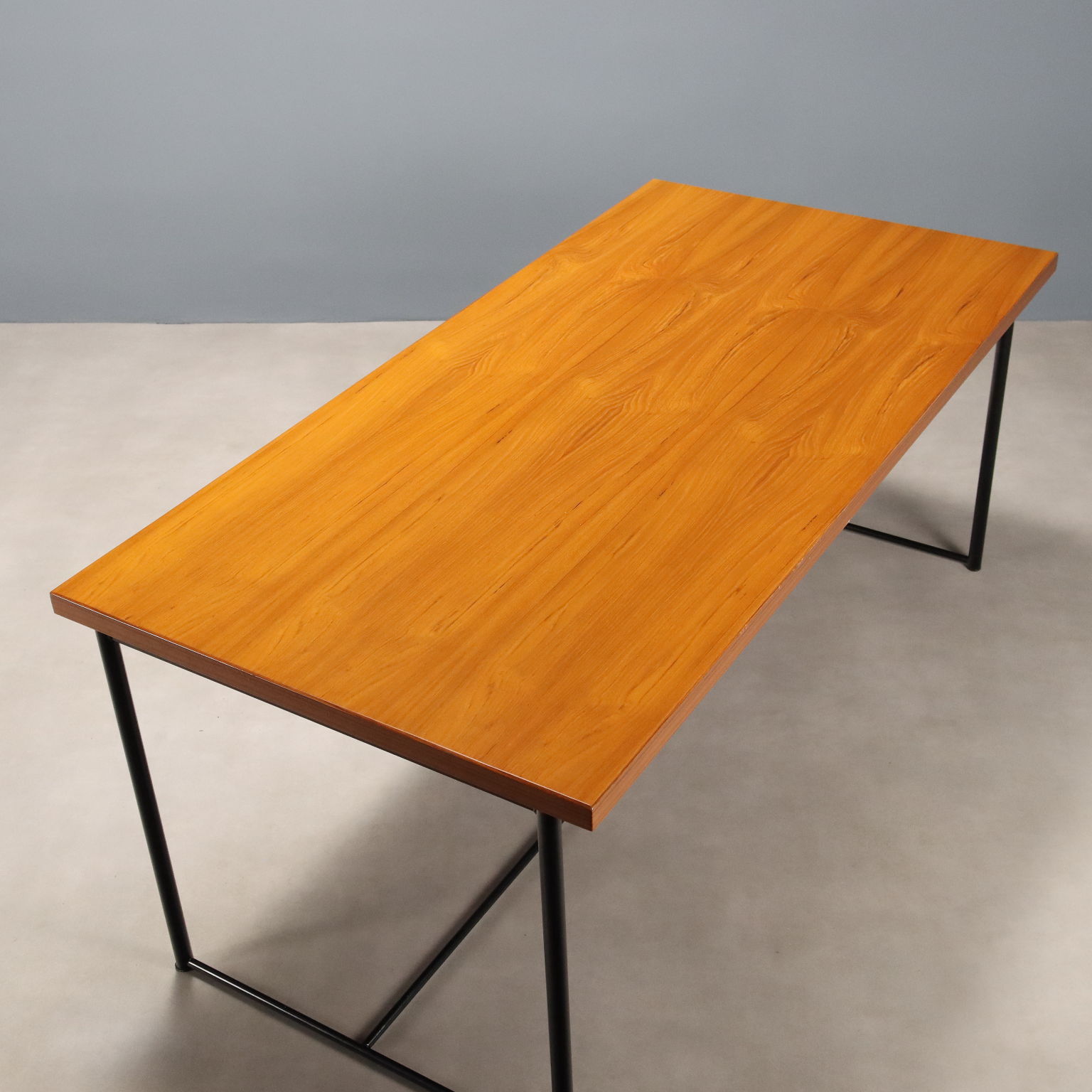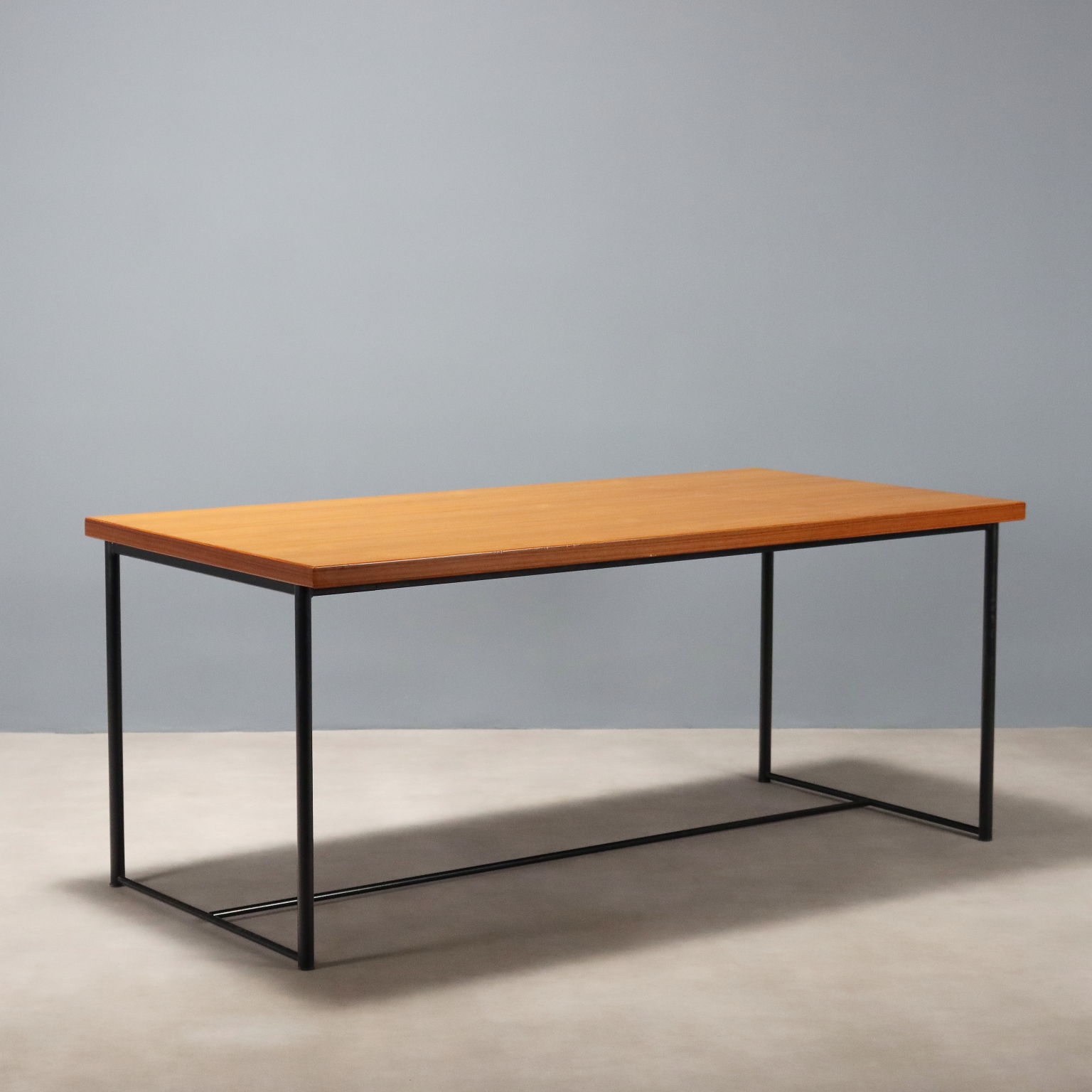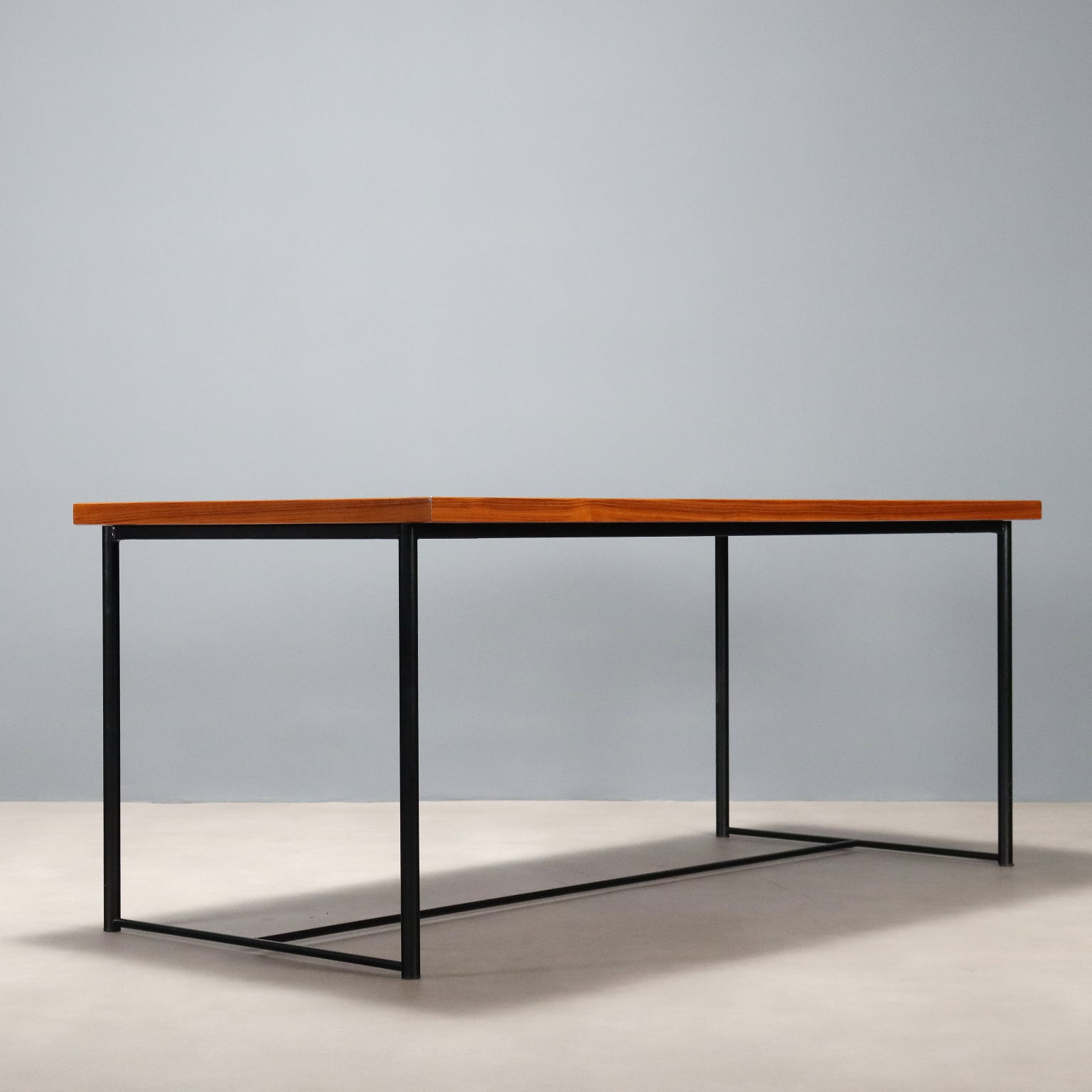 Tavolo da pranzo/scrivania vintage con struttura in metallo laccato nero e piano rettangolare in legno.