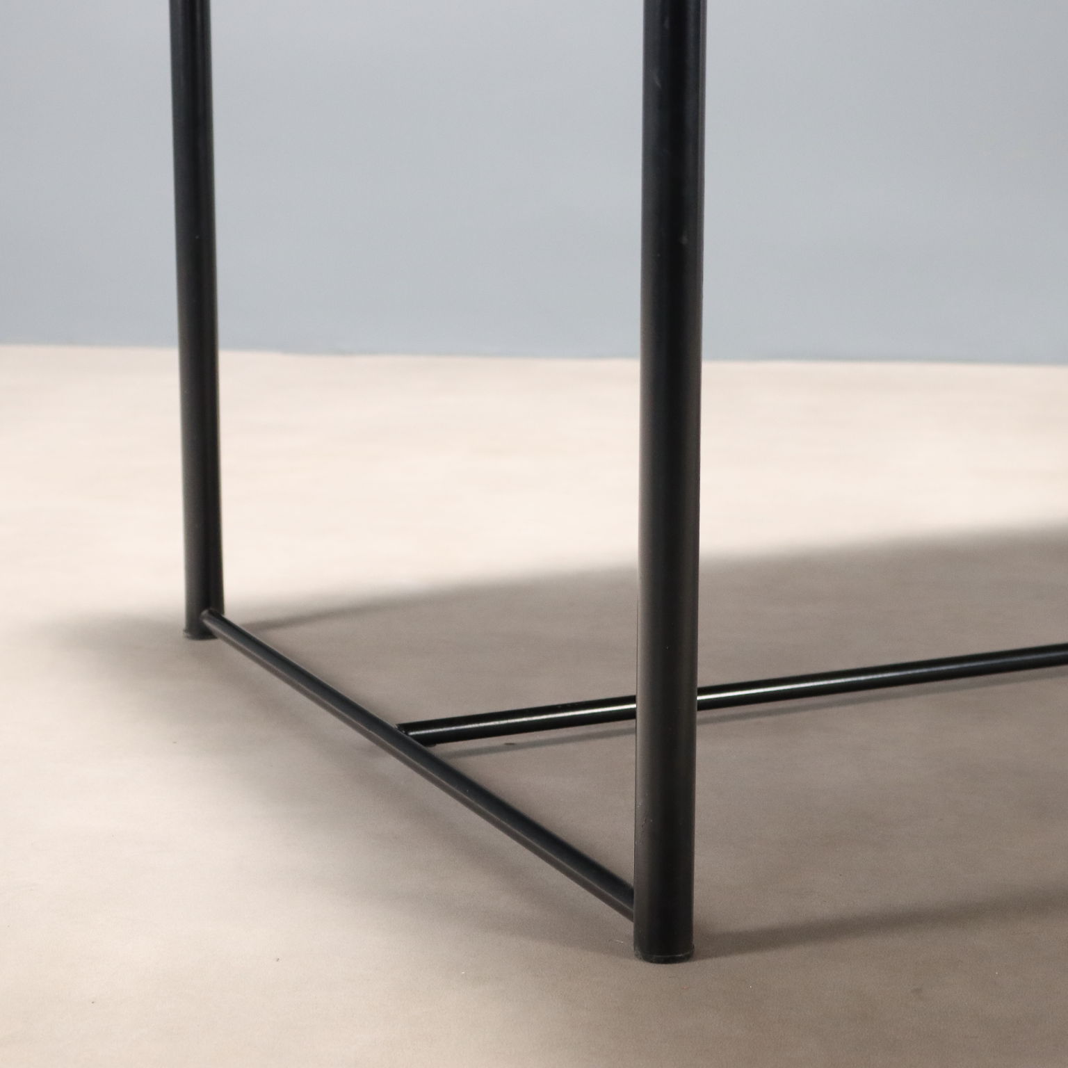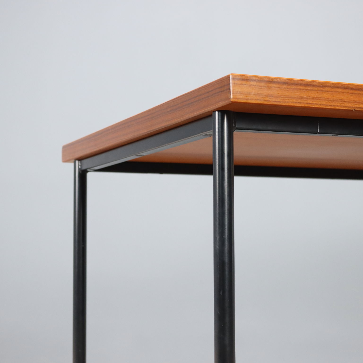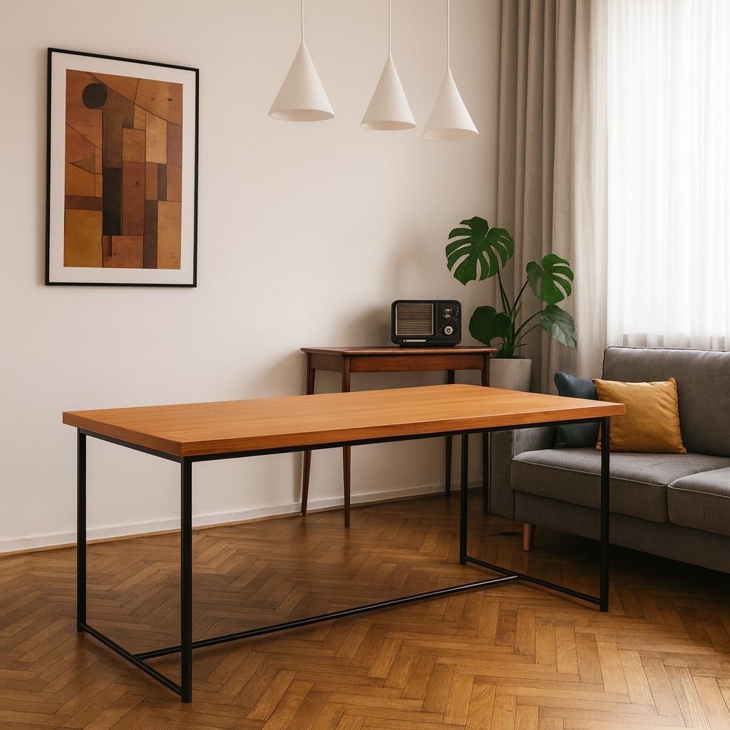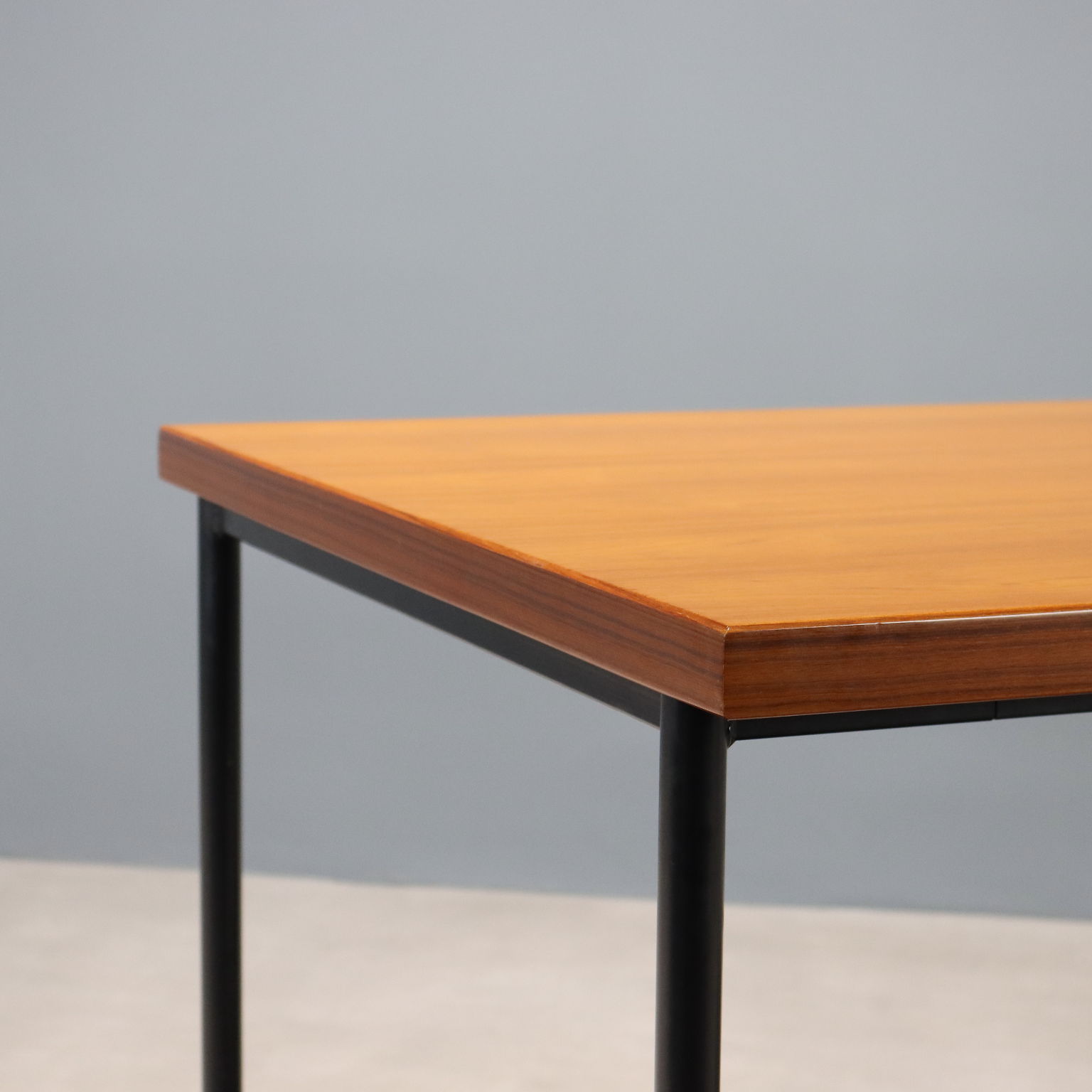 Tavolo da pranzo/scrivania vintage con struttura in metallo laccato nero e piano rettangolare in legno.