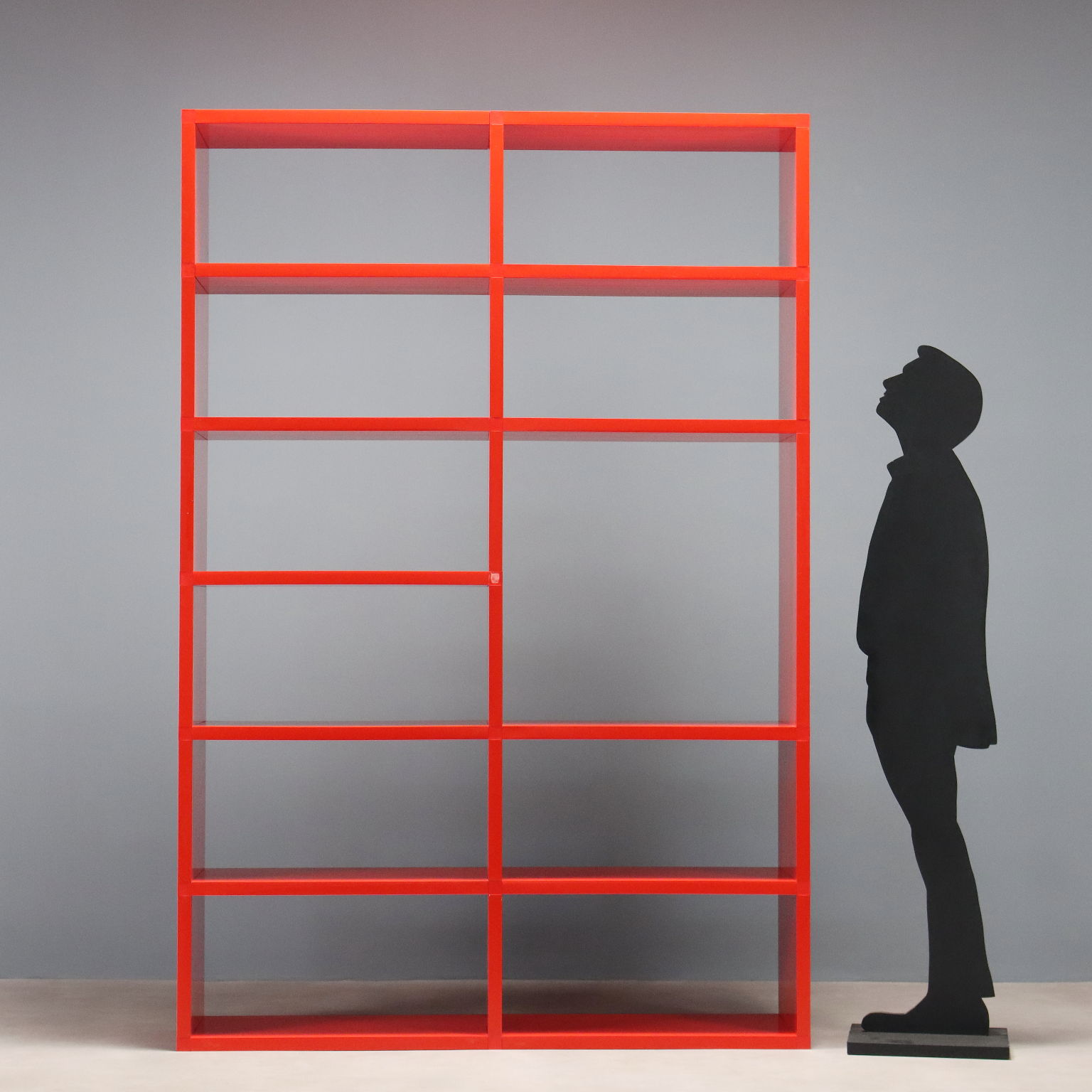 Libreria modulare in materiale plastico rosso con elementi a posizione regolabile. Presente il marchio della manifattura.