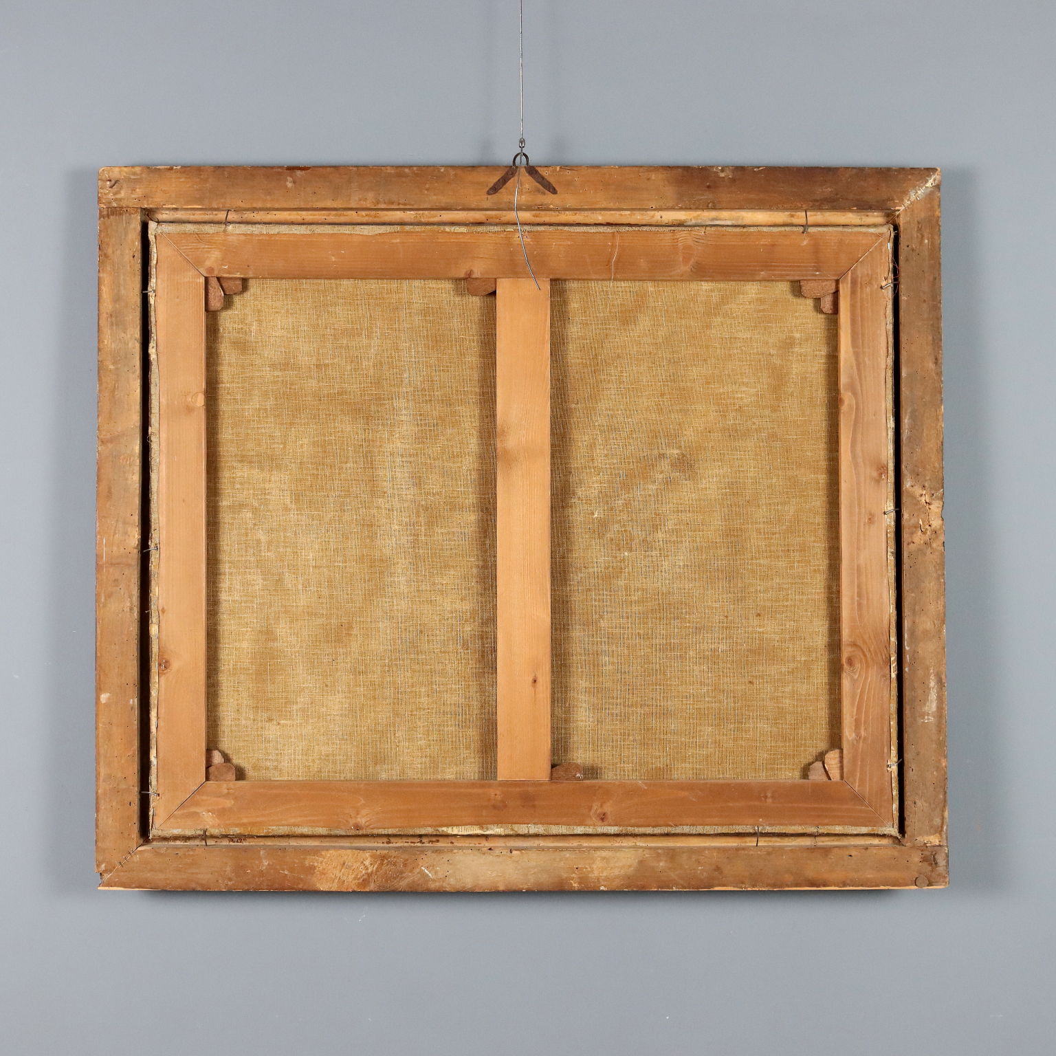 Olio su tela. Scuola nord-italiana dell' inizio XVIII secolo. Nel paesaggio su rilievi collinari rocciosi è collocato un borgo di edifici turriti, che si erge in prossimità di una costa marittima, visibile sullo sfondo a destra; in primo piano, lungo una piccola insenatura costiera, ferve la vita popolare, con molteplici figure intente a diverse attività. Il dipinto presenta segni di restauro e ritelatura pregressi; attualmente risulta ben marcato il cretto, ma ancora integro il colore. Il dipinto è presentato in cornice antica, con lievi mancanze.