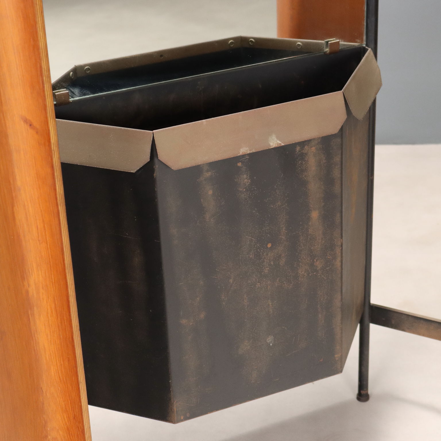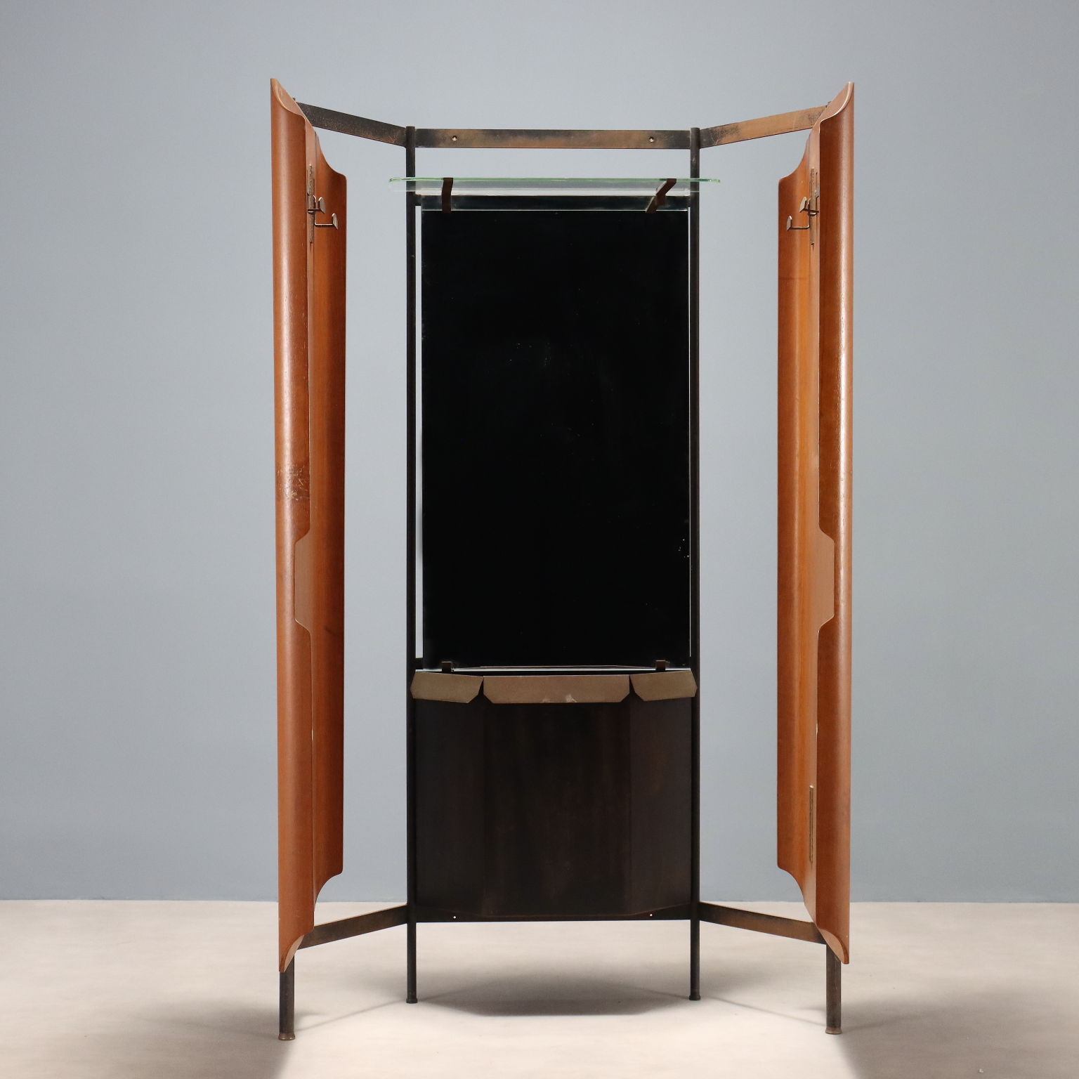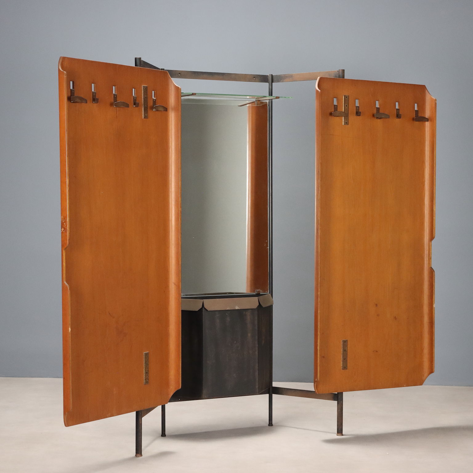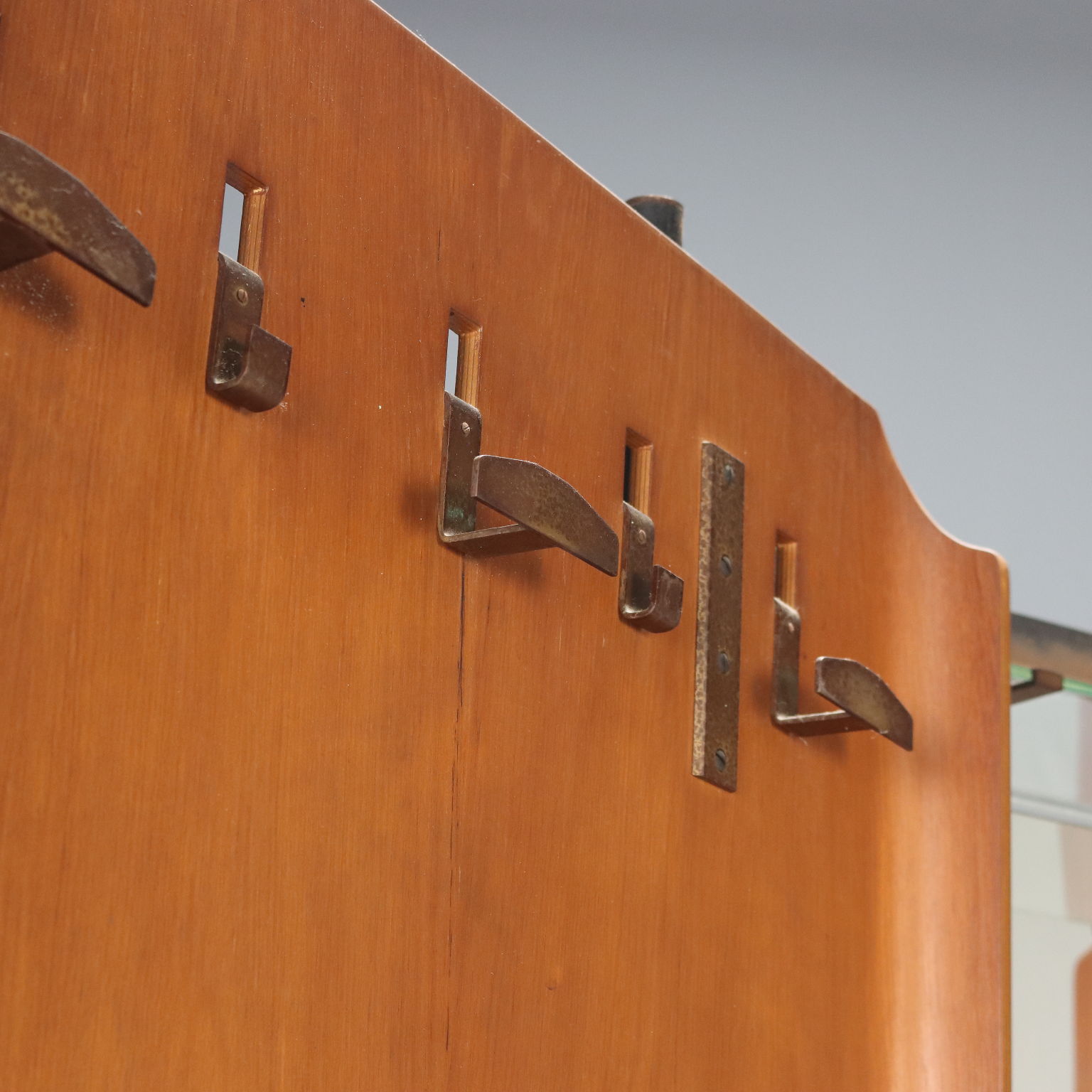 Appendiabiti vintage con ante in compensato impiallacciato teak che celano uno specchio, una mensola, un contenitore e appendini in ottone.