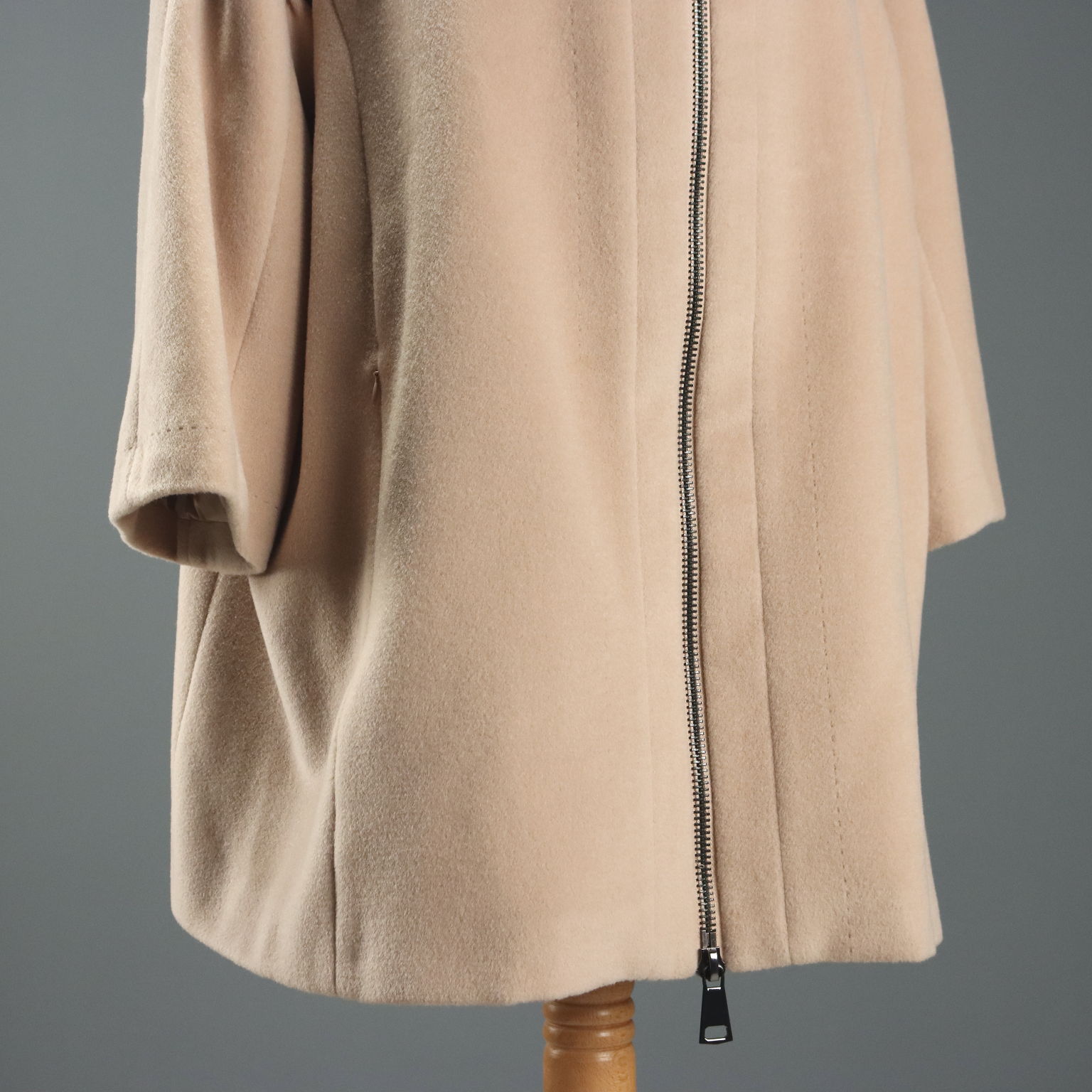 Cappotto per la mezza stagione in morbidissimo tessuto in misto lana, seta, cashmere e poliammide. Allacciatura con zip a doppio cursore. La taglia non è riportata, segnaliamo quindi alcune misure utili. Lunghezza. 73 cm. Lunghezza manica (misurata dalla base dello scollo, essendo una manica a kimono senza cucitura e a taglio 3/4): 57 cm. Giromanica: 51 cm. Larghezza torace: 61 cm.