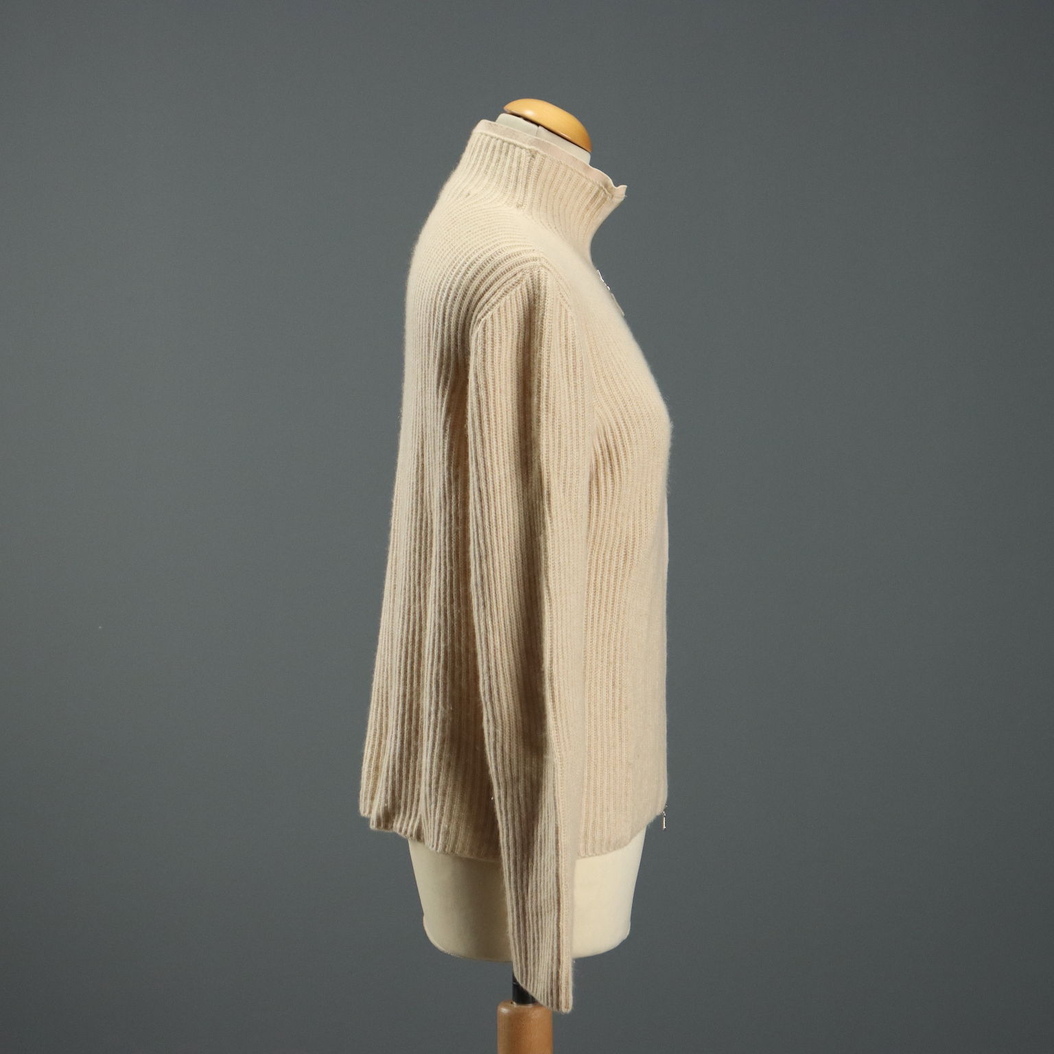 Morbidissimo maglione in puro cashmere pregiato con lavorazione a coste e profili in panno di misto lana, cashmere e angora. Allacciatura con zip a doppio cursore. Lunghezza: 53 cm. Lunghezza manica: 64 cm. Giromanica: 48 cm. Larghezza spalle: 41 cm. Larghezza torace: 50 cm.